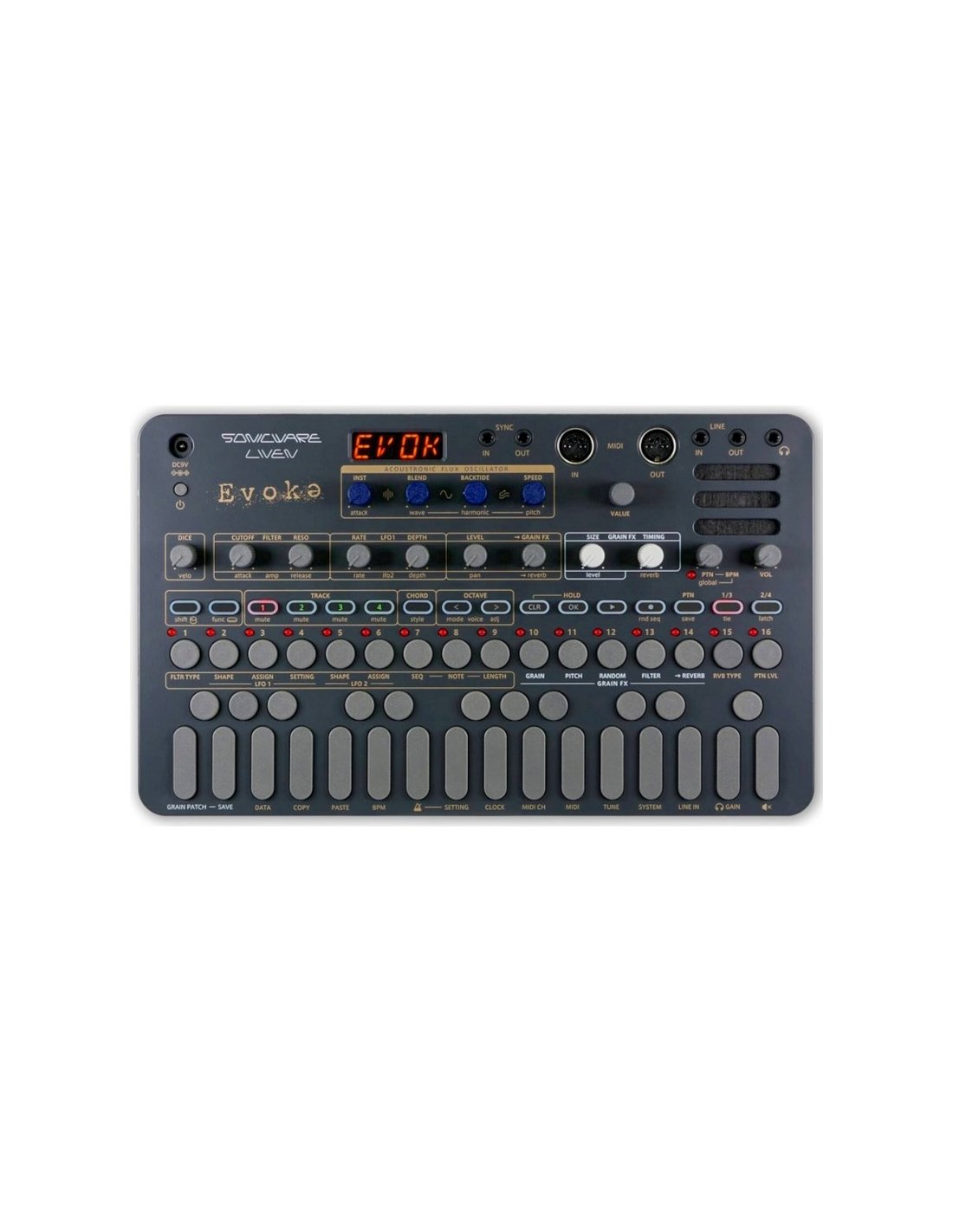 Groove machine che fonde toni acustici ed elettronici. L'Acoustronic Flux Oscillator offre un'ampia gamma di toni dai pianoforti morbidi alle corde risonanti e ai vibrafoni, in un sintetizzatore con step sequencer ideale per i compositori ambient, i sound designer cinematografici e per creare musica post-classica con trame in evoluzione. Il Grain FX consente di tagliare le frasi in micro-grani per ottenere trasformazioni uniche in sync con le sequenze. I 10 riverberi, che includono l'atmosferico Mirage, consentono di aggiungere profondità e dimensione ad ogni suono. Il sequencer è a 4 tracce, 64 step per pattern. Le dotazioni includono la tastiera a 27 tasti con funzione Chord e Note Hold, un altoparlante integrato, ingresso/uscita audio e uscita cuffie con jack da 3,5 mm, ingresso/uscita sync con jack da 3,5 mm, ingresso/uscita MIDI. L'alimentazione è a batteria (6 pile AA, non incluse) o con alimentatore opzionale (da 9V, 1A). Dimensioni 297 mm (L) x 176 mm (P) x 48 mm (A), peso 790 g.