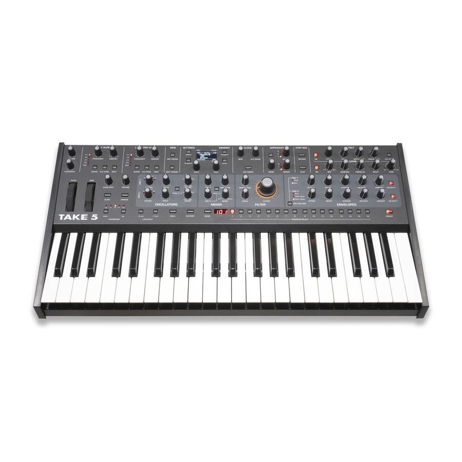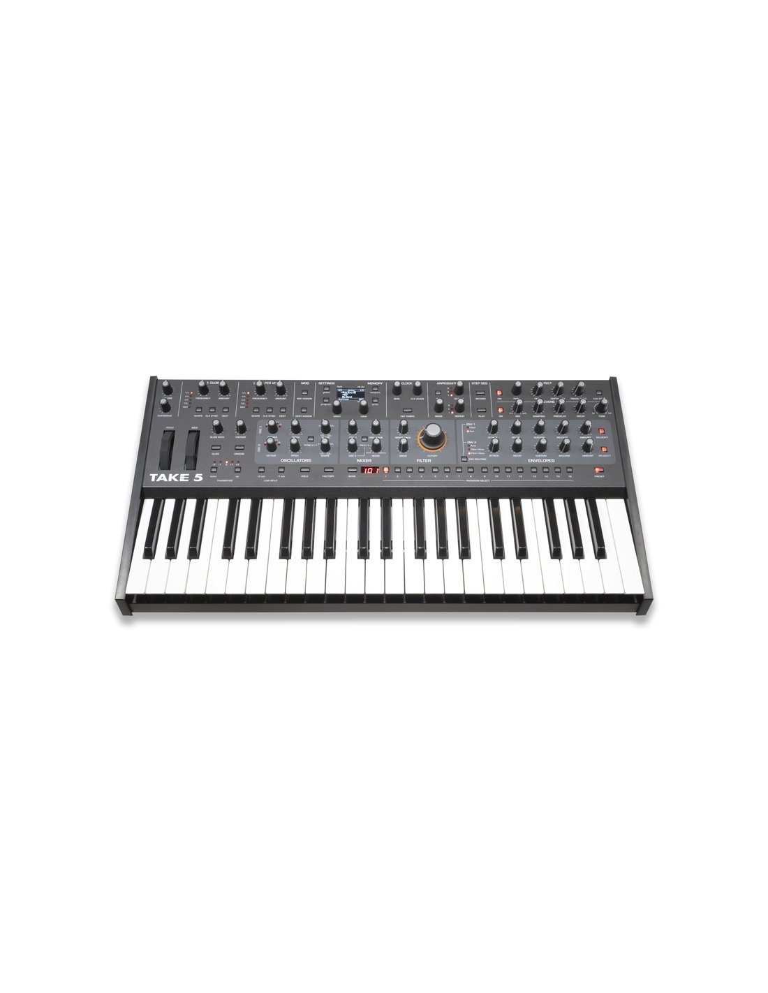 The Take 5 is a 5-voice polyphonic analog synthesizer from Sequential. It is equipped with a 44-key keyboard, 2 VCOs per voice, a 4-pole resonant filter, 2 envelope generators, 2 LFOs, an overdrive, double digital effects, analog FM, a 64-step polyphonic