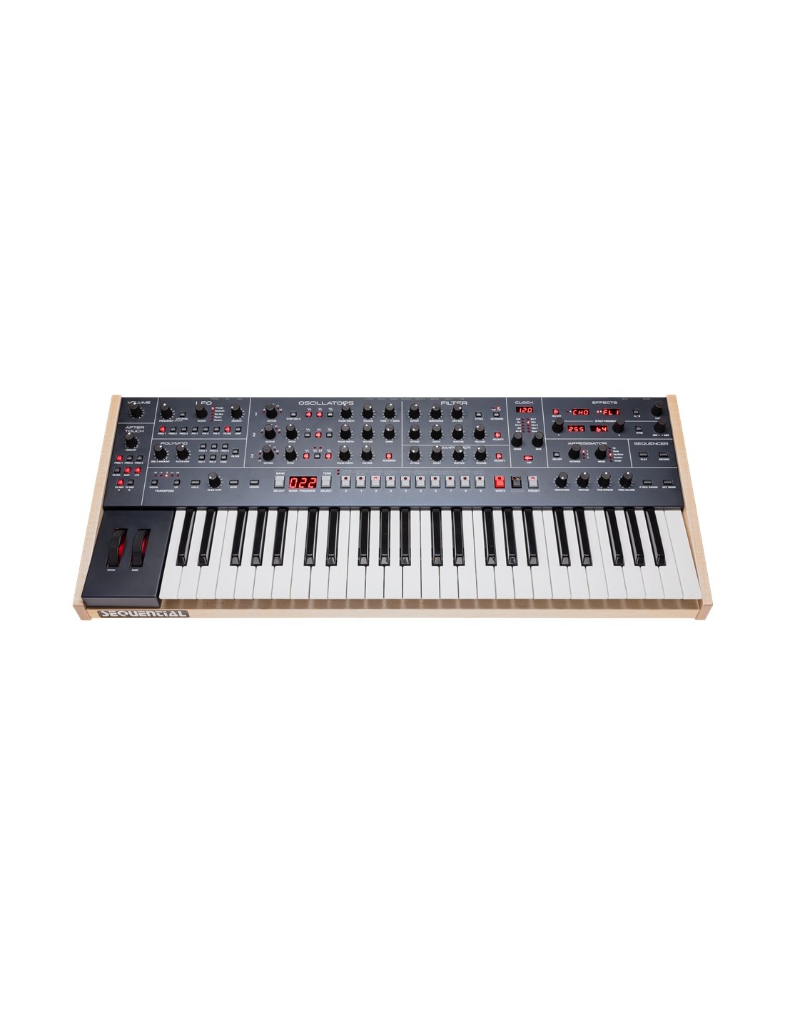 The Trigon 6 is a Sequential analog synthesizer. It is equipped with 6-voice polyphony, 3 oscillators and a low pass ladder filter, arpeggiator and 64-step polyphonic sequencer, analog stereo distortor, 2 24-bit/48kHz digital processors with reverb, delay, chorus, flanger, phase shifter and ring modulator effects and pitch bend and modulation