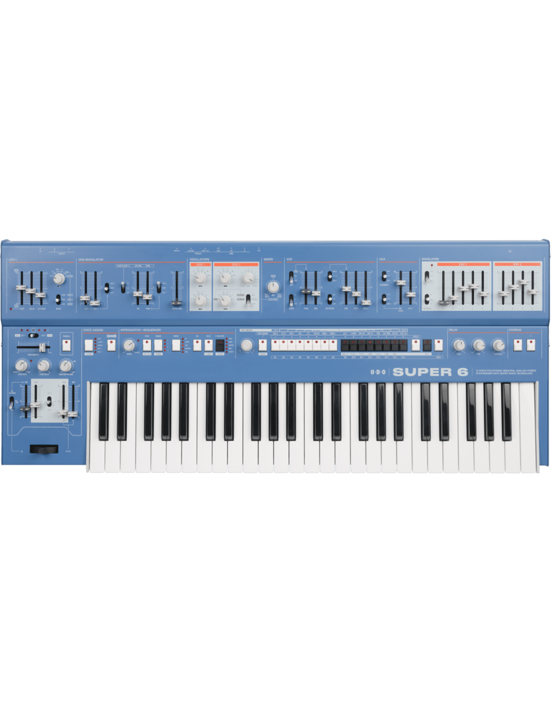 The Super 6 Blue is a digital analog hybrid synthesizer from Udo Audio. It is equipped with 2 digital oscillators, a 24 dB analog low-pass filter with resonance, a static high-pass filter, a selectable overdrive stage, an analog VCA, 2 ADSR envelopes, an LFO with an extended frequency range (0.05 Hz - 20 kHz) and keyboard tracking for FM sounds, delay and chorus effects and an arpeggio and a 64-step sequencer with MIDI