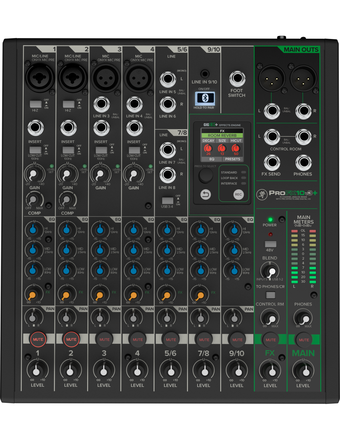 Switch between recording modes to record flat or effects, or use loopback mode to stream video games or play backing tracks without feedback. It is also possible to take your guests on podcasts via telephone via Bluetooth® on a dedicated channel. With simple connectivity, analog warmth and an enhanced FX engine, Mackie ProFX10V3+ is the perfect hub for your studio.