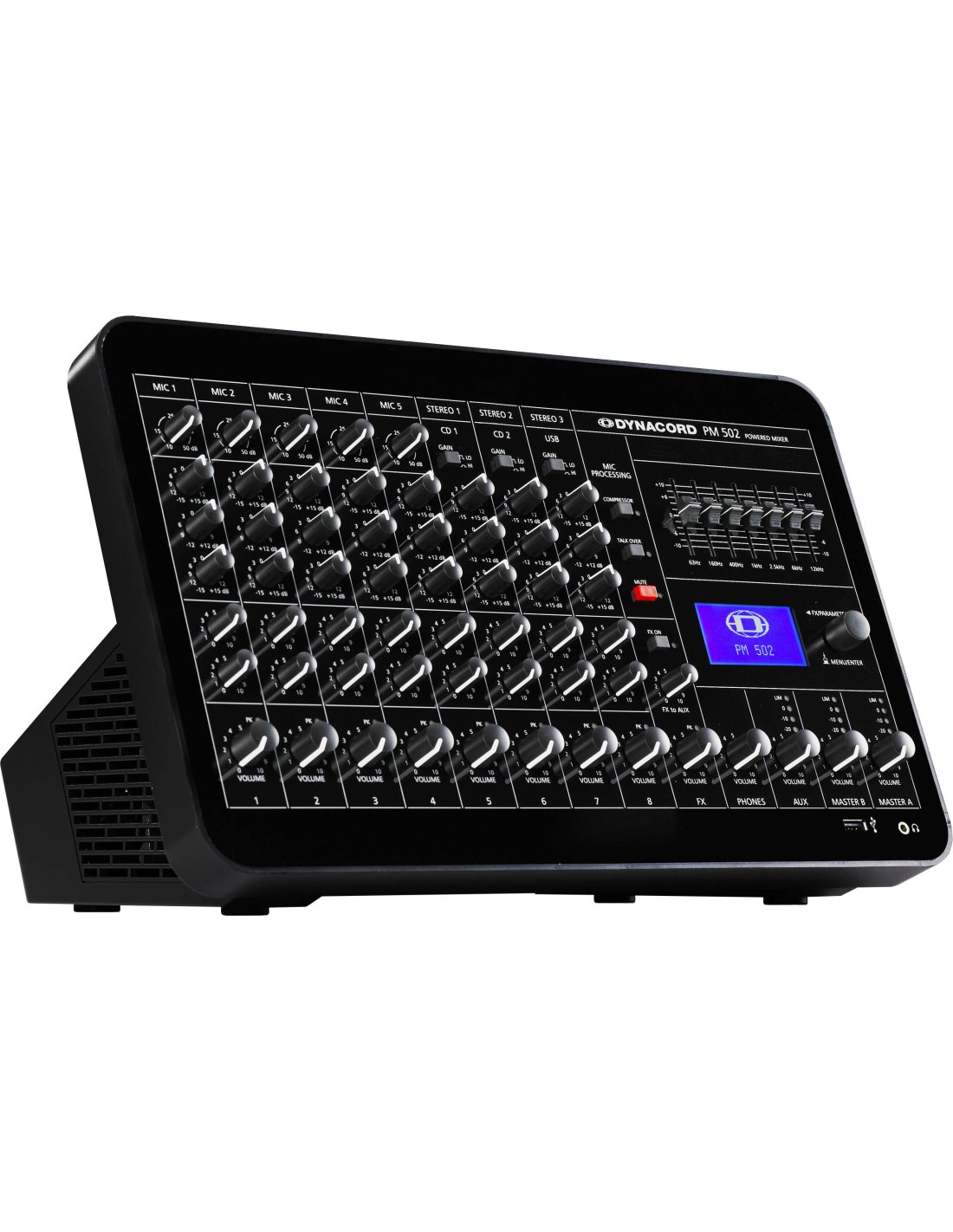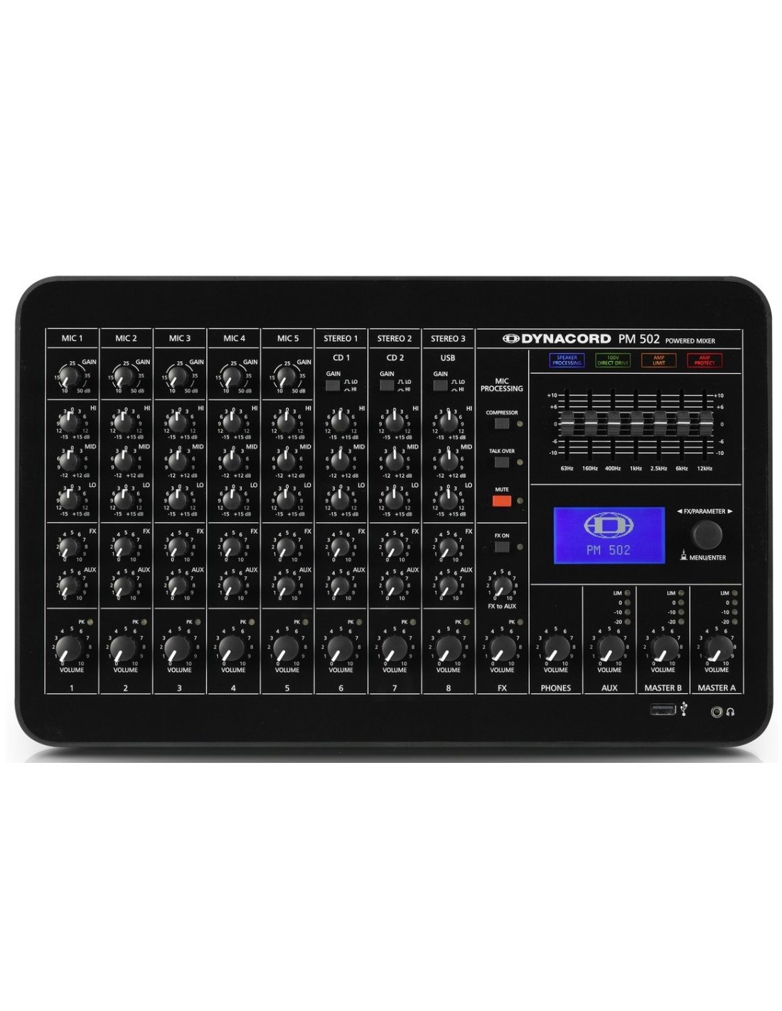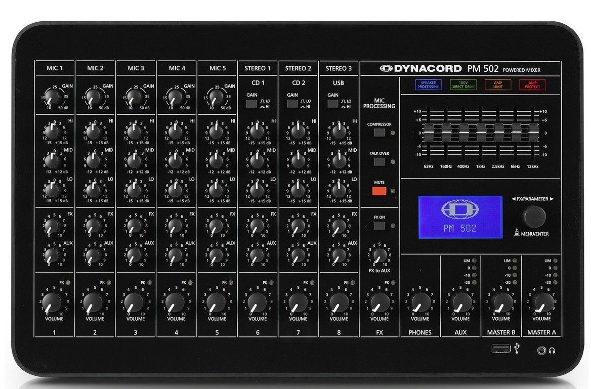 Mic/Line 5-channel self-amplified mixing console with compressor/limiter, talk-overy function, general 48 V DC Phantom power selection, 3 channels, integrated MP3 and WAV audio file player, 2in/2out digital audio interface with 24-bit AD/DA conversion and 32/44 sample rate. 1/48 kHz, 32 editable FX presets, 3 Master outputs with 7-band EQ, delay for Master-B (150msec/50 m), 2x 450W RMS amplifier module in class D at 4, power supply controlled (100 - 240V), direct output without transformer for 100V line, complete set of protections, load output connectivity for live and installations, optional rack mounting kit. 128 x 64 pixel LCD display. Energy consumption at 4 at maximum output power: 180W. Dimensions (H x W x D): 245 x 395 x 241.2 mm. Rackmount dimensions (H x W x D): 310.3 (7U) x 483 (19') x 177 mm. Weight: 4.9 kg