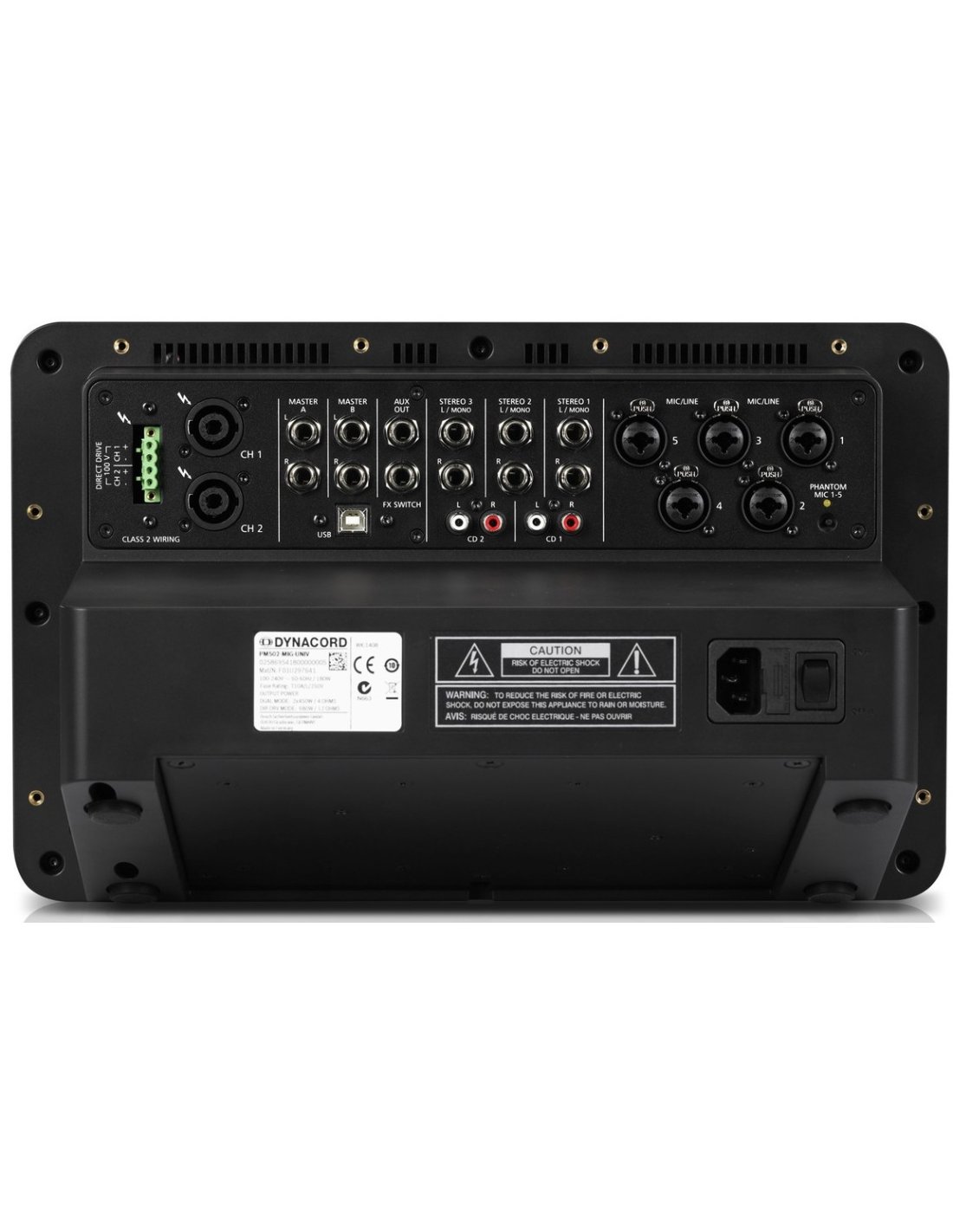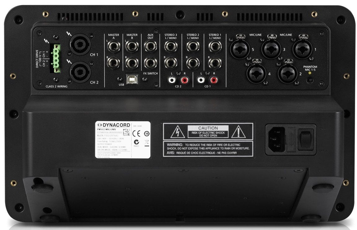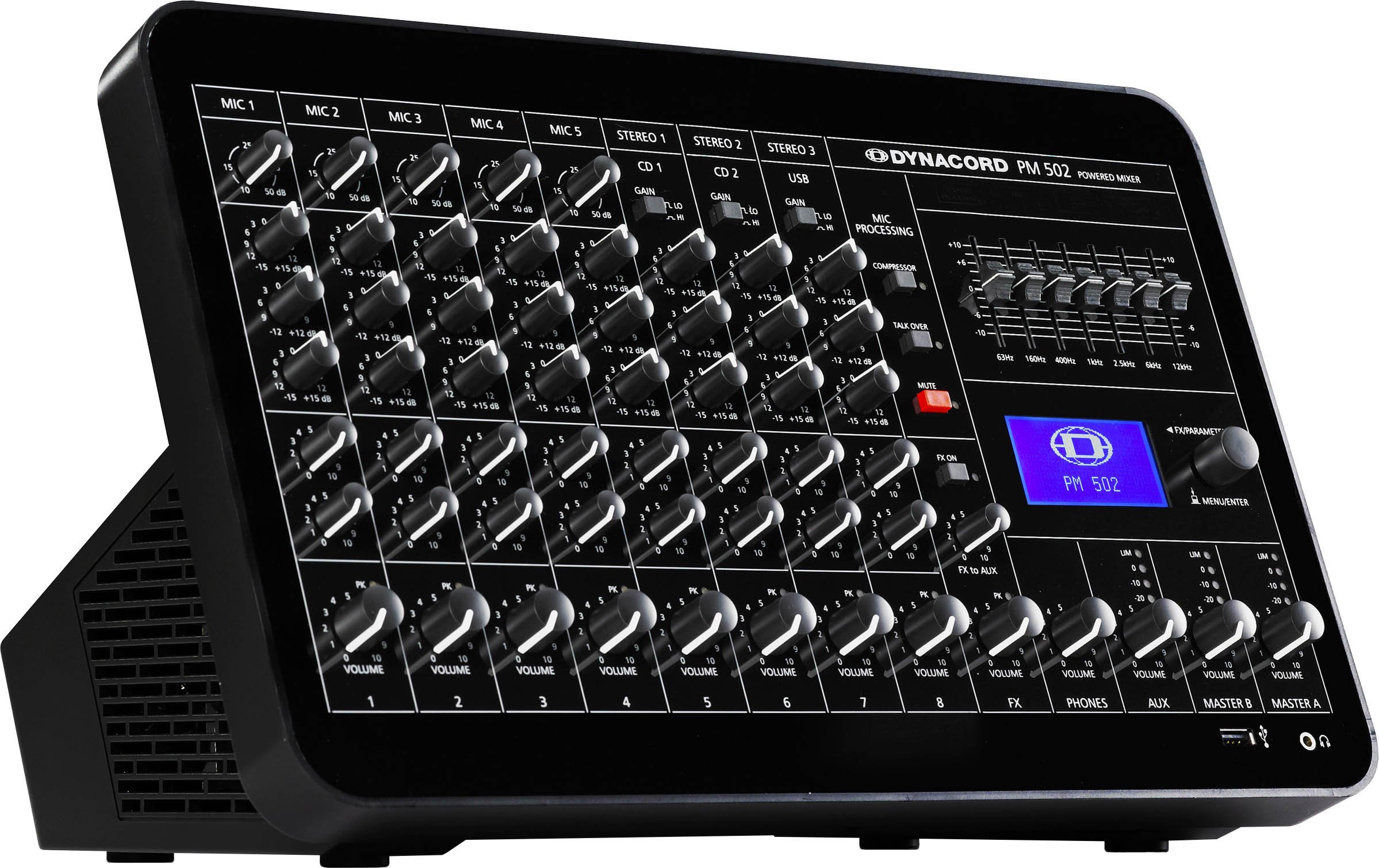 Mic/Line 5-channel self-amplified mixing console with compressor/limiter, talk-overy function, general 48 V DC Phantom power selection, 3 channels, integrated MP3 and WAV audio file player, 2in/2out digital audio interface with 24-bit AD/DA conversion and 32/44 sample rate. 1/48 kHz, 32 editable FX presets, 3 Master outputs with 7-band EQ, delay for Master-B (150msec/50 m), 2x 450W RMS amplifier module in class D at 4, power supply controlled (100 - 240V), direct output without transformer for 100V line, complete set of protections, load output connectivity for live and installations, optional rack mounting kit. 128 x 64 pixel LCD display. Energy consumption at 4 at maximum output power: 180W. Dimensions (H x W x D): 245 x 395 x 241.2 mm. Rackmount dimensions (H x W x D): 310.3 (7U) x 483 (19') x 177 mm. Weight: 4.9 kg