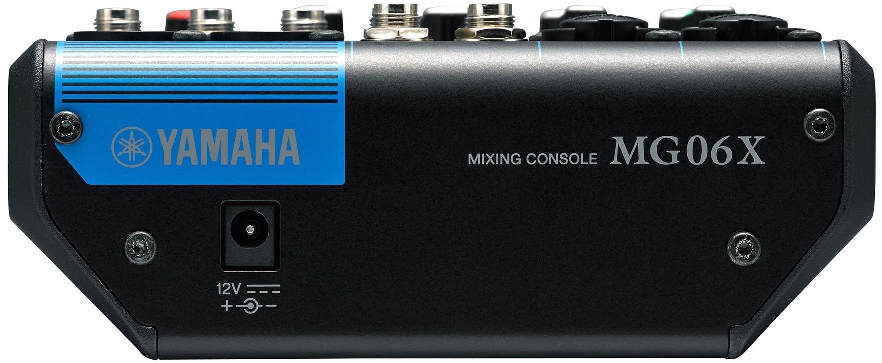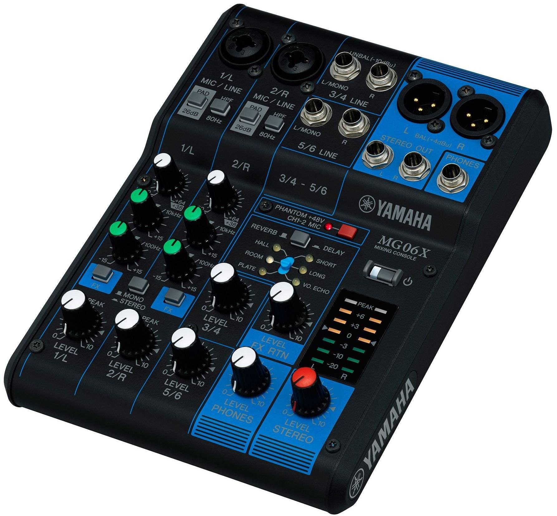 YAMAHA MG06X. Compact 6-channel mixer including 2 mono channels with 2 XLR/TRS combo microphone preamps, Mic/Line selector, 26Db pad, 80Hr High-pass filter, 2-band eq and gain control and 2 stereo channels with 6.3 mm TRS Jack inputs with volume control, 3 reverbs and 3 selectable SPX delays with FX Return level control. It features 4Dbu balanced output via XLR, stereo output on TRS jack, headphone output on 6.3 mm TRS jack with volume control,
