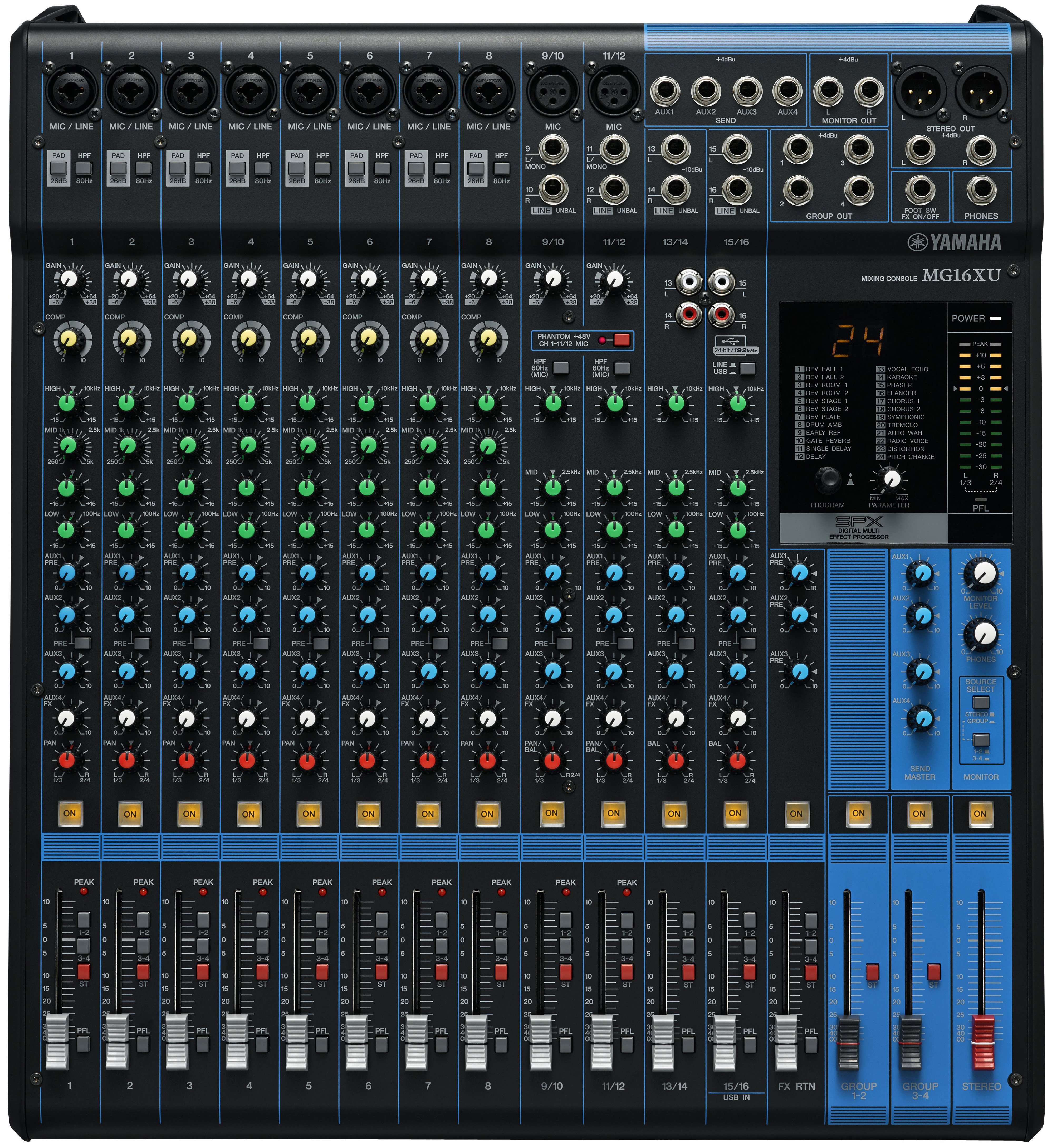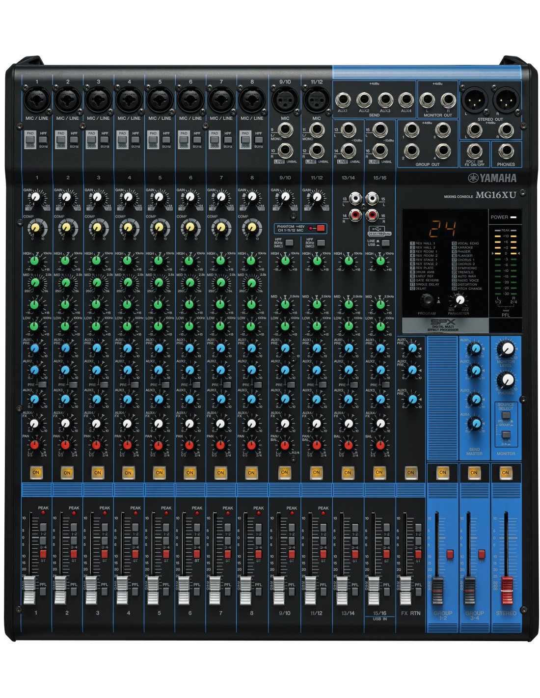 YAMAHA MG16XU. 16-channel USB mixer including 8 mono channels with 8 D-PRE microphone preamps through XLR/TRS combo connectors, Mic/Line selector, 26Db pad, 80Hz High-pass filter, 3-band eq with parametric averaging control, knob compressors and gain control, 4 stereo channels, the first 2 with 6.3 mm TRS and XLR Jack inputs and the other 2 with 6.3 mm TRS and RCA Jack inputs with volume control, 3-band eq, FX control on each channel, 24-bit/2192USB audio interface KHz 2In/2Out, SPX multi-effect processor with 24 digital effects selectable. It features 4Dbu balanced output via XLR, balanced output on TRS jack, monitor output on TRS jack, 4 aux send, 4 output groups, headphone output on 6.3 mm TRS jack with volume control, phantom power +48.