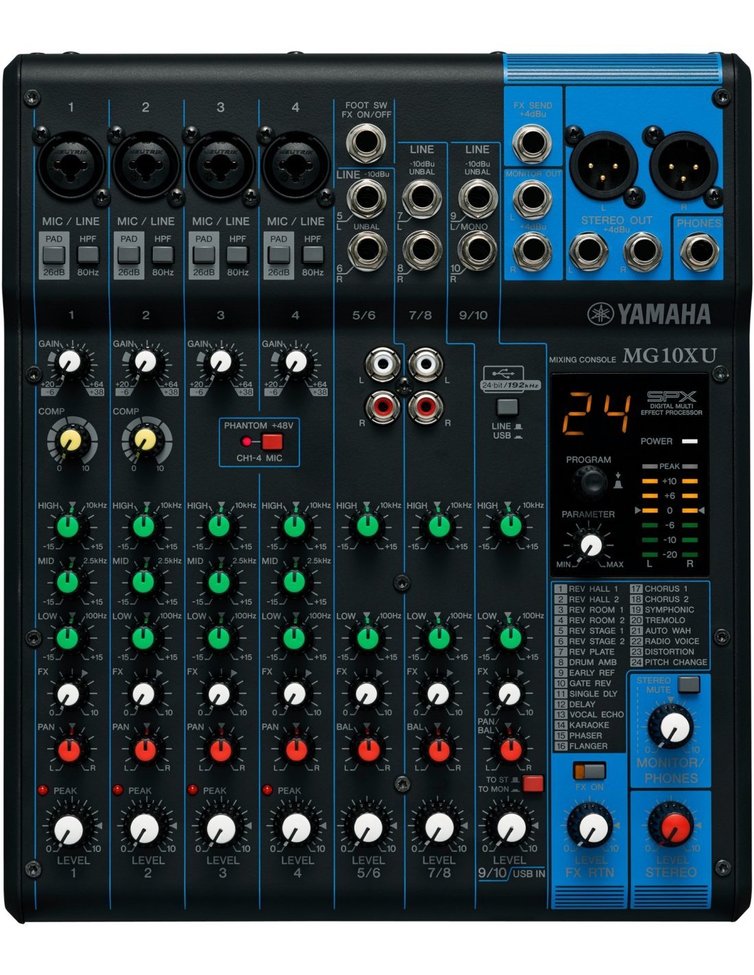 YAMAHA MG10XU. 10-channel USB mixer including 4 mono channels with 4 D-PRE microphone preamps through XLR/TRS combo connectors, Mic/Line selector, 26Db pad, 80Hz High-pass filter, 3-band eq, knob compressors on the first 2 channels and gain control, 3 stereo channels with 6.3 mm TRS and RCA jack inputs with volume control, 2-band eq, FX control on each channel, 24-bit/192kHz 2In/2Out USB audio interface, SPX multieffect processor with 24 selectable digital effects. It features 4Dbu balanced output via XLR, stereo output on TRS jack, monitor output on TRS jack, FX send, headphone output on 6.3 mm TRS jack with volume control,