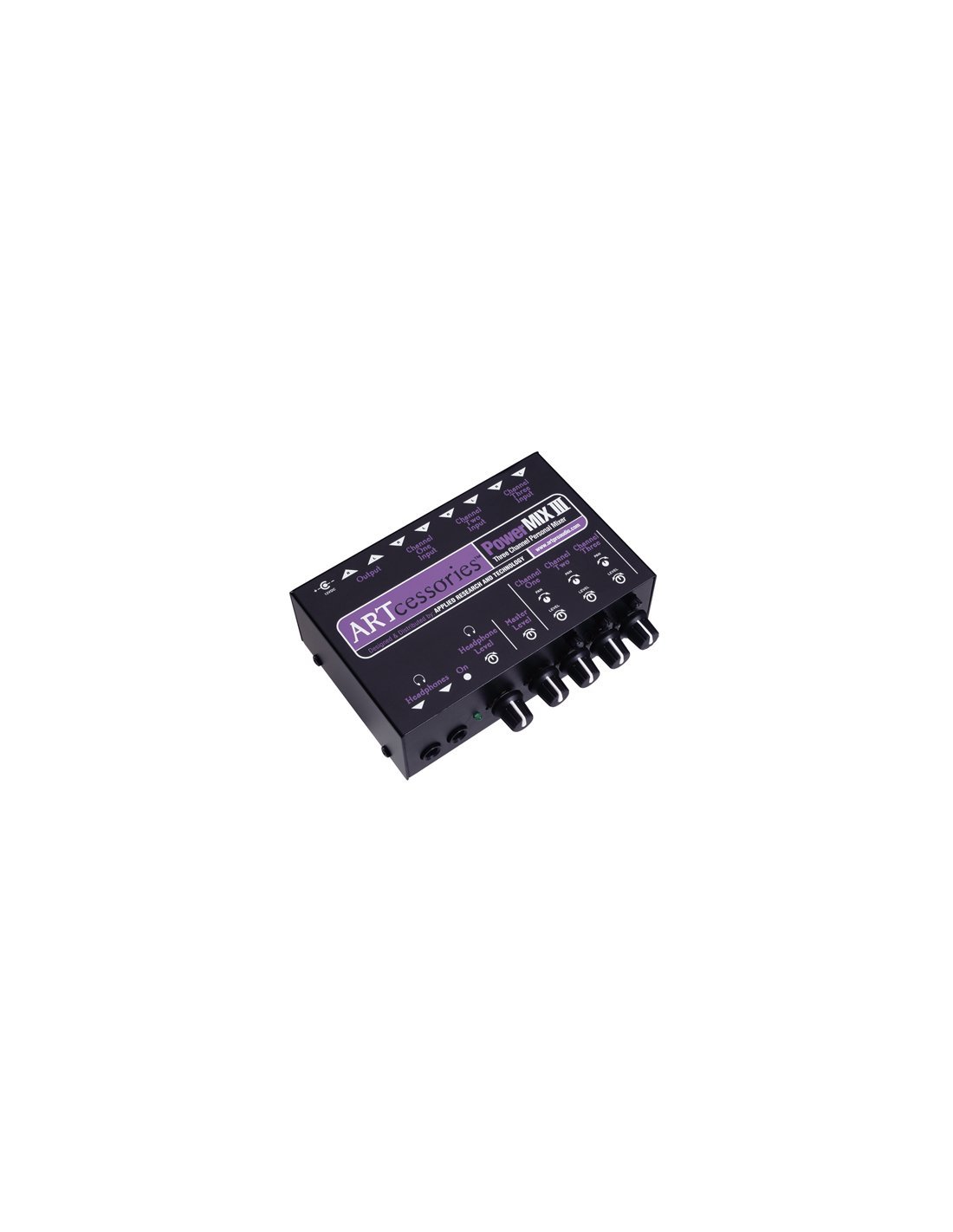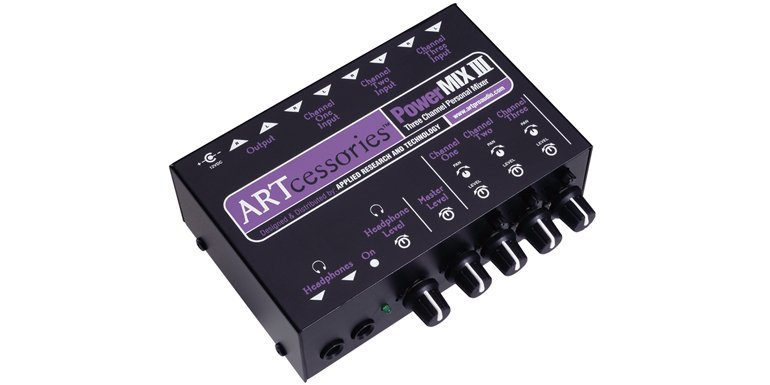 ART POWERMIX III is an extremely compact Stereo mixer that allows you to connect CD or MP3 Players, keyboards and the Line Out signal of a guitar or bass amp and send them to a Stereo output, or to a pair of identical Mono signals. There are 3 In channels (3 pairs of unbalanced 1/4 inch Jacks) that can also be used in a Mono configuration, each equipped with Level and Pan control. The Master Level adjusts the output level on an unbalanced 1/4 inch Jack pair. Thanks to the presence of a headphone output with dedicated volume control, ART POWERMIX III is also perfect for practicing at home on your favorite basics.