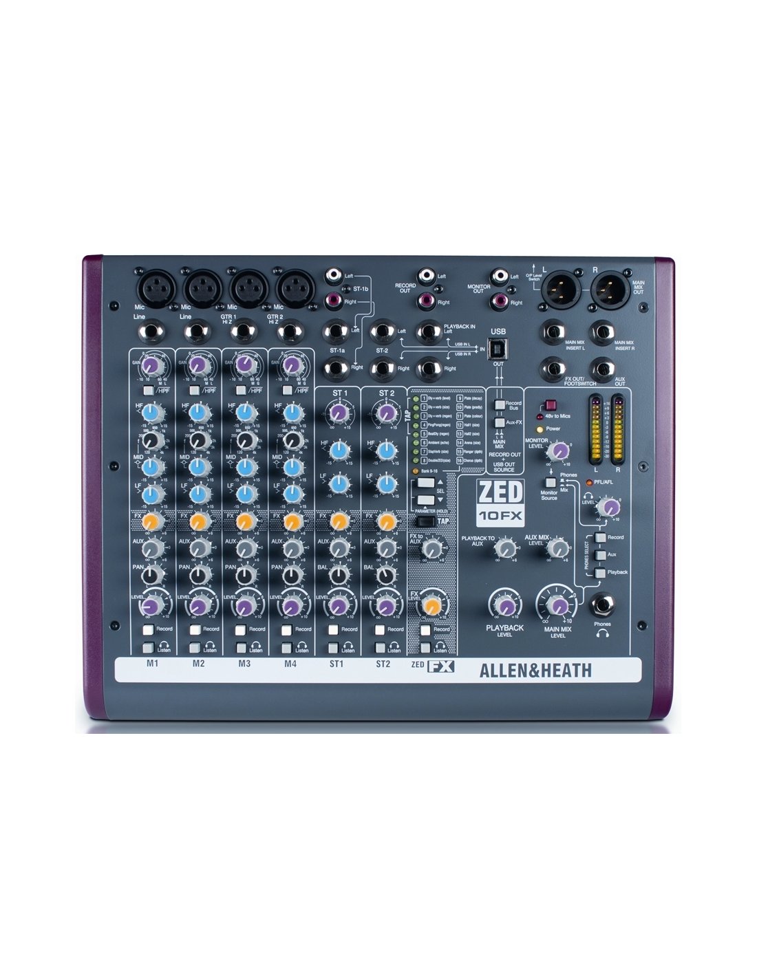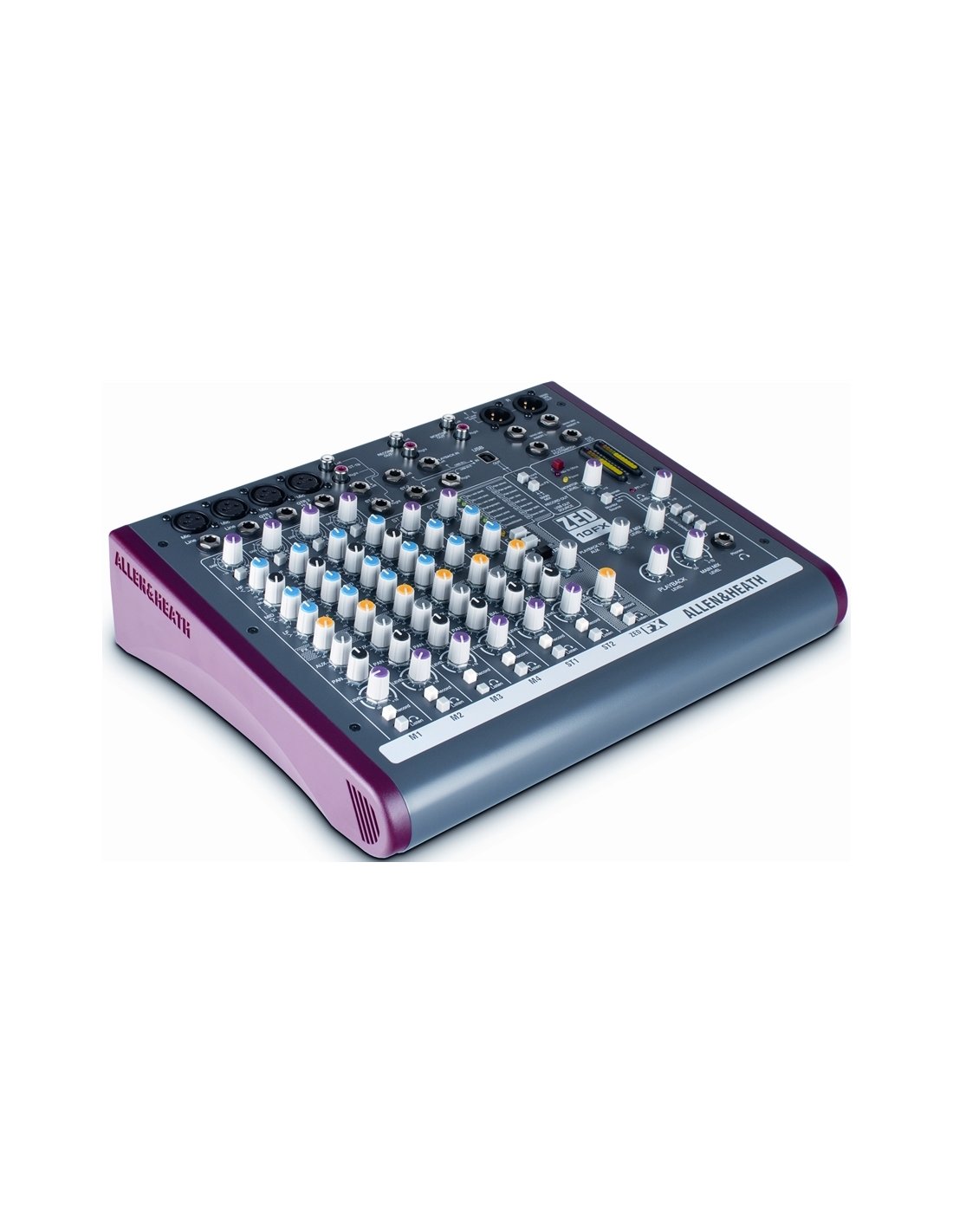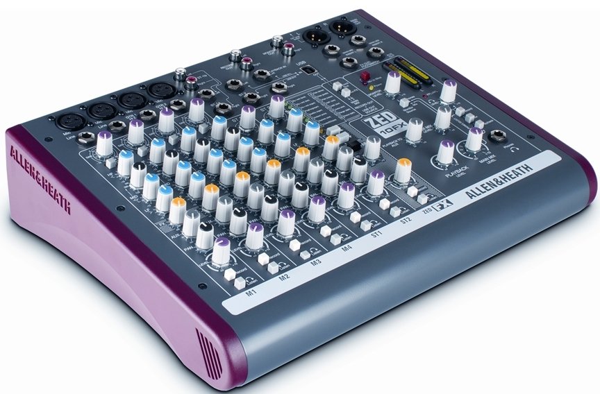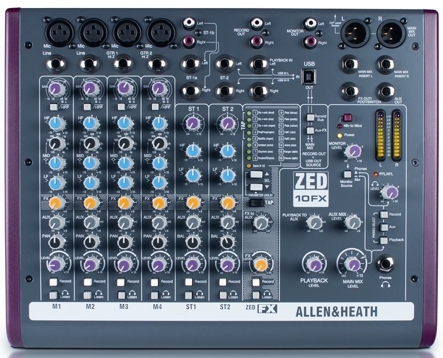 ALLEN & HEATH ZED 10FX is a 10-channel USB mixer with effects and USB connectivity. Technical features include 4 mono channels on XLR and Line connectors via Jack with microphone preamps, 3-band Eq with adjustable frequency mids, Pan, Level, FX controls and selectable high pass filter, 3 stereo channels on 6.3 mm L/R jack connectors with 2-band Eq, 2 Stereo Inputs for CD and MP3 players. It also has an integrated effects processor with 16 selectable digital effects, 2 Aux (1 Pre-Fader and 1 Post-Fader