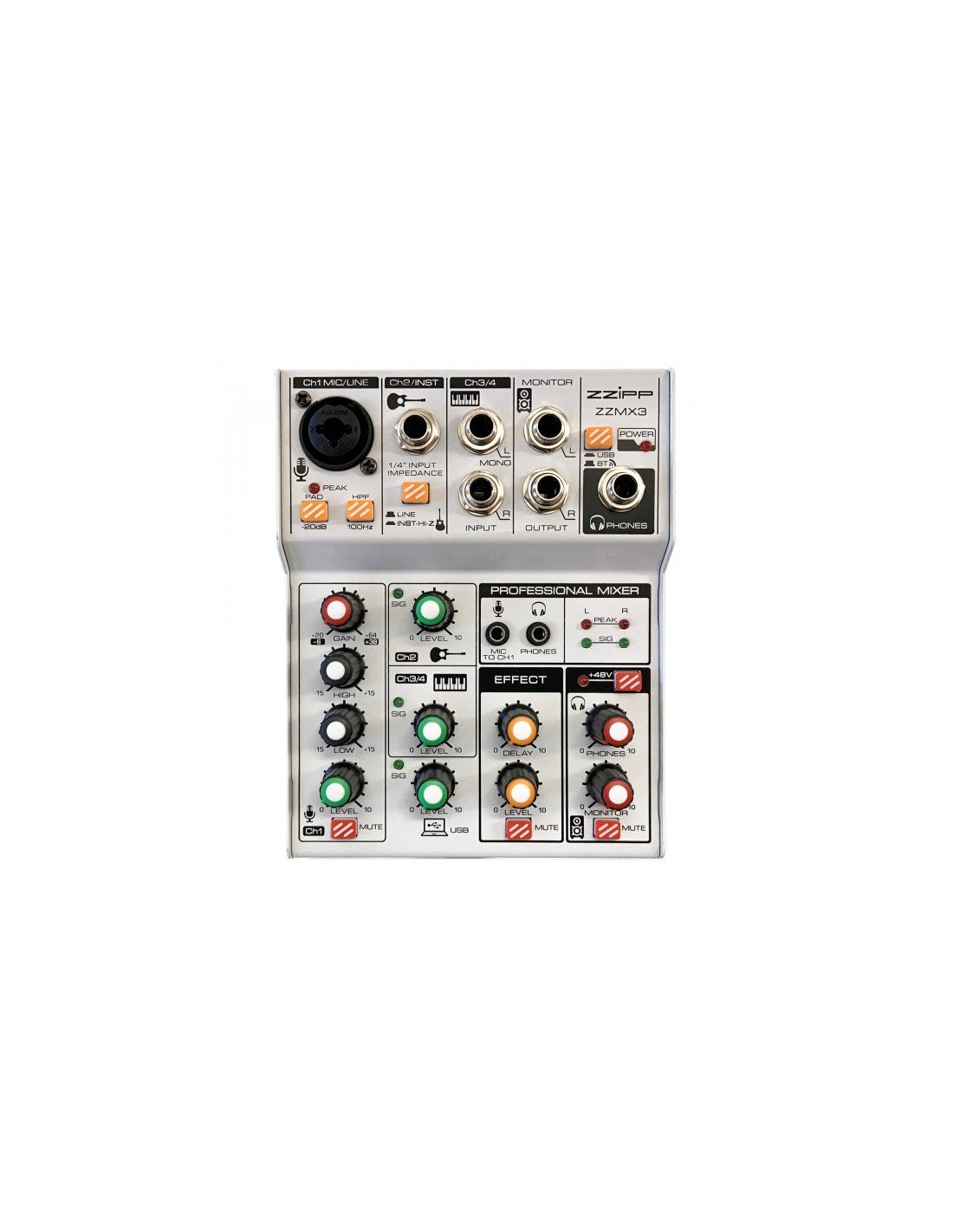 ZZIPP ZZMX3 is a small 3-channel passive mixer ideal for conferences and podcasters. ZZMX3 has an integrated USB sound card, a MIC/LINE input with adjustment of high and low tones, high pass filter with 100Hz cutoff, volume and Mute button, LINE/INSTRUMENT input with independent volume, Pad -20dB, USB/BLUETOOTH input with selector and volume,