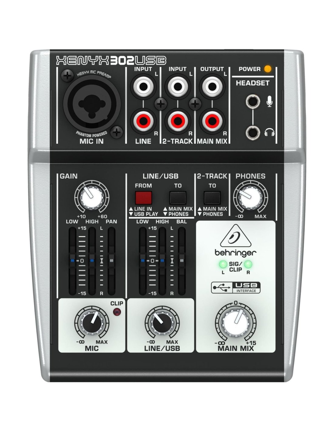 BEHRINGER XENYX 302 USB. 5-input passive analog mixer powered by USB. Technical features include XENYX combo XLR/TRS microphone preamplifier with clip led, stereo line input via RCA, 2-track input via RCA, 2-band “British” graphic equalizer, USB audio interface, 15v phantom power, headphone