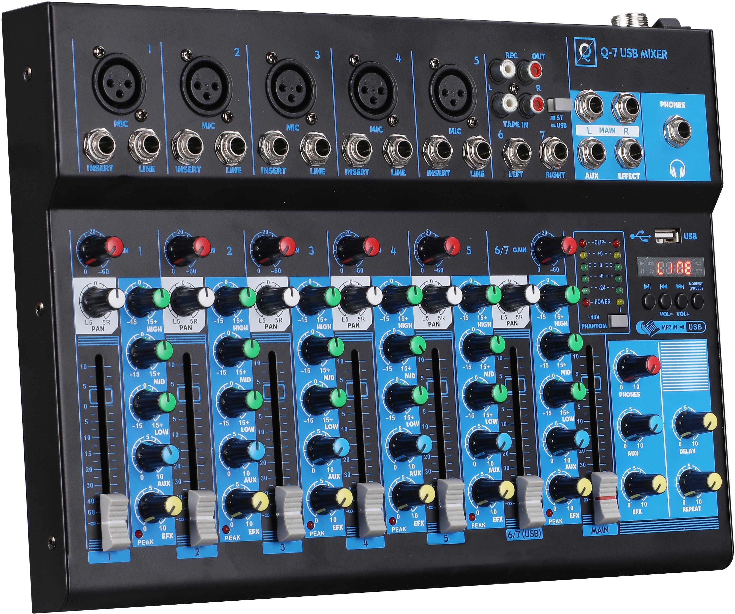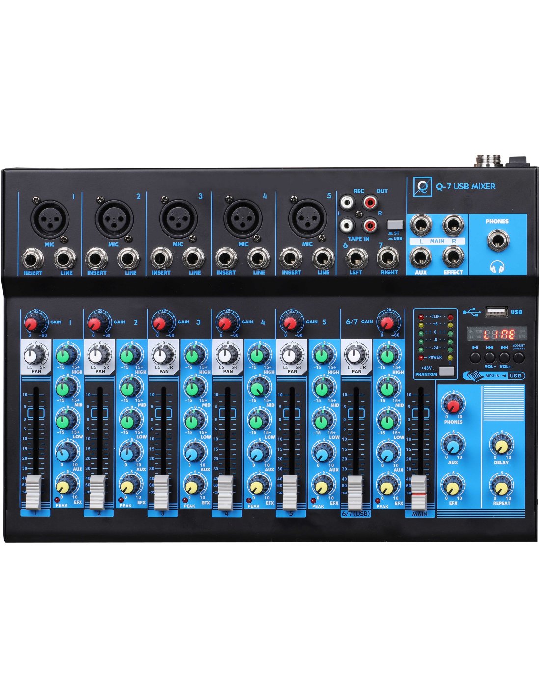 OQAN Q7 MK2 is a USB mixer with 7 channels, integrated MP3 player and Bluetooth connectivity. Technical features include 5 mono channels with XLR mic inputs and line/insert via 1/4" jack, gain control, 3-band eq, aux pan controls and effect volume, 1 stereo channel with L/R bal/unbal inputs via TRS and RCA jacks with gain control, 3-band eq, aux controls, pan and effect volume. It also has a multimedia player with USB flash drive slot, display and function keys, Stereo output via TRS
