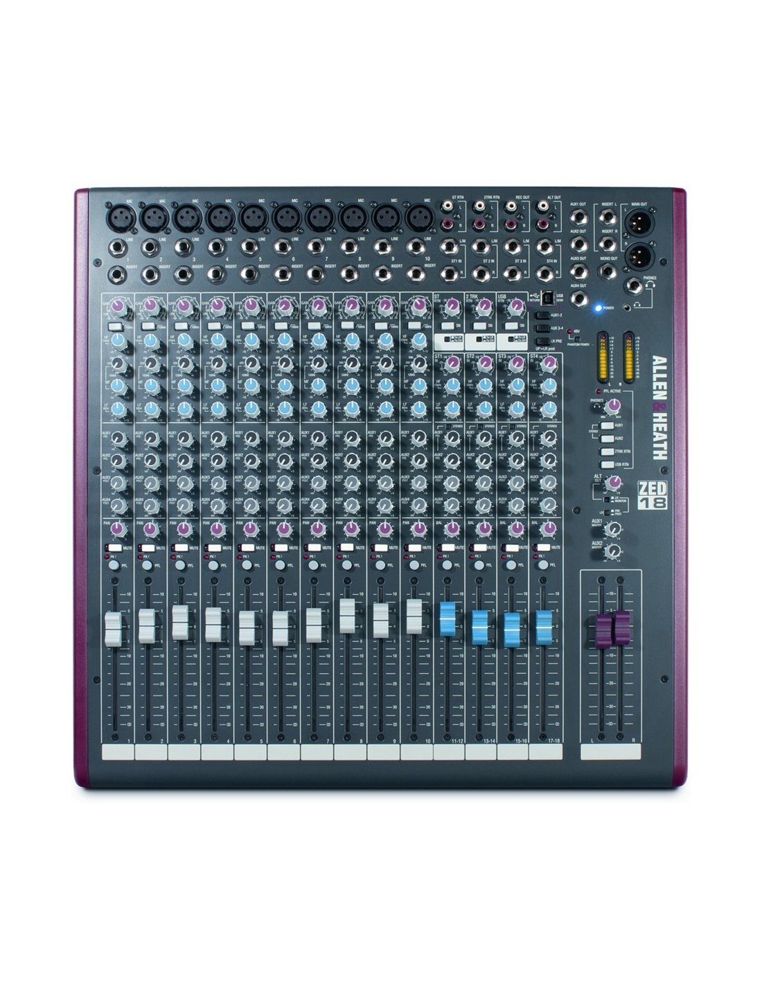 Like the other models in the series, the new ZED also incorporate a USB connection, with two-track delivery and return, for payback, recording and effects directly from a computer. The 10 mono channels use the acclaimed Allen&Heath dual-stage 'DuoPre' preamplifier, three-band MusiQ EQ, with semiparametric average, and 100mm faders. In a compact rack-mountable format. The stereo inputs have two-band EQ and inputs for an extra source, and there are 4 aux sends accessible from both mono and stereo channels