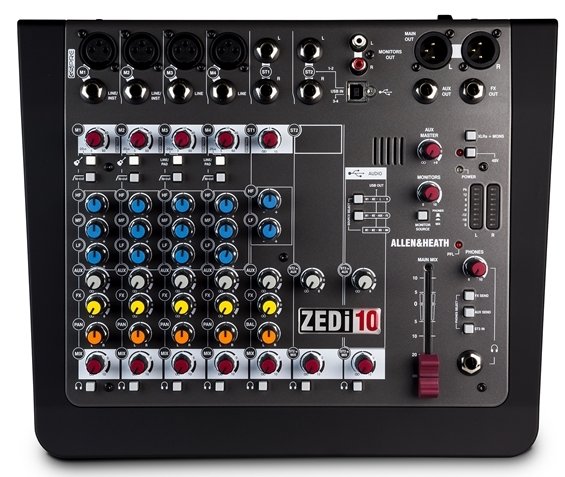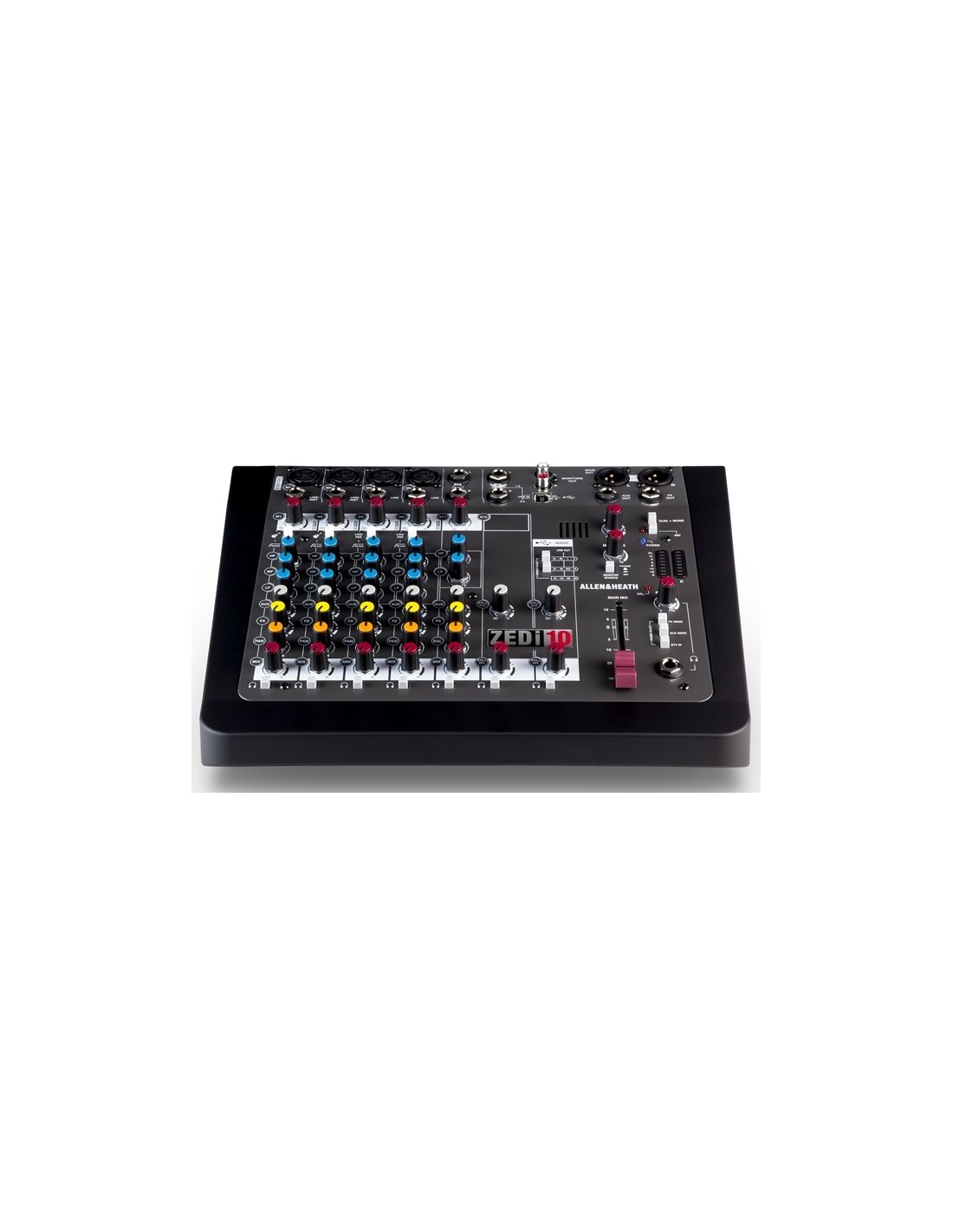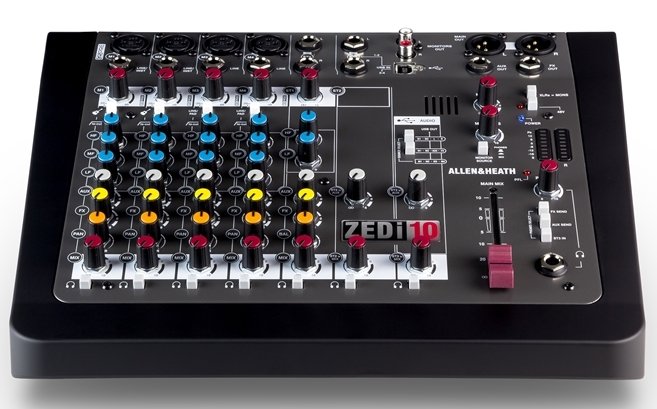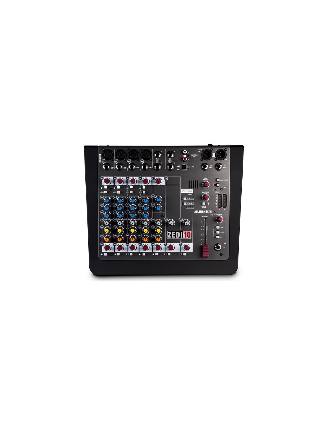 ALLEN & HEATH ZEDi 10 is a 6-channel analog mixer with integrated 4in/4out USB audio interface. Technical features include 4 mic/line inputs via XLR and TRS with GSPre preamplifiers and 2 high-impedance D.I. inputs on channels 1 and 2, 2 stereo inputs via TRS L/R jack sockets, 3-band eq on channels 1-4 and 2-band on channel 5, low cut filter. Equipped with balanced main outputs via XLR, monitor output via RCA and aux and Fx outputs via 1/4 jack. It includes the Cubase LE music production software and the Cubasis LE app