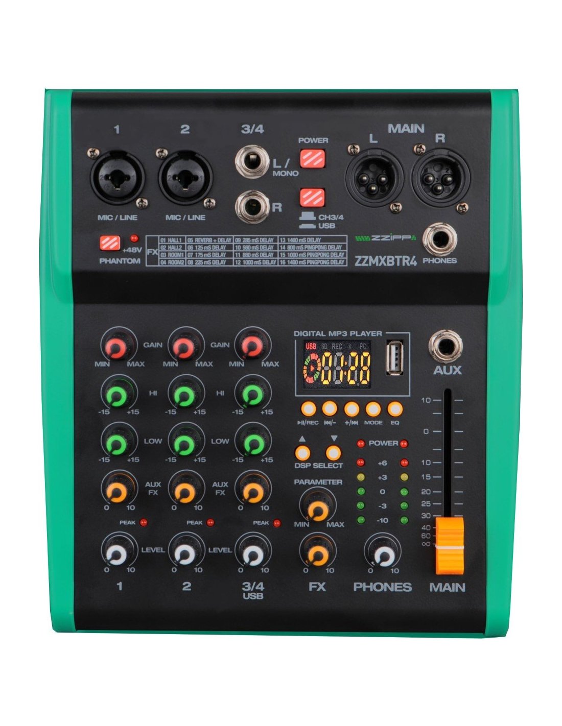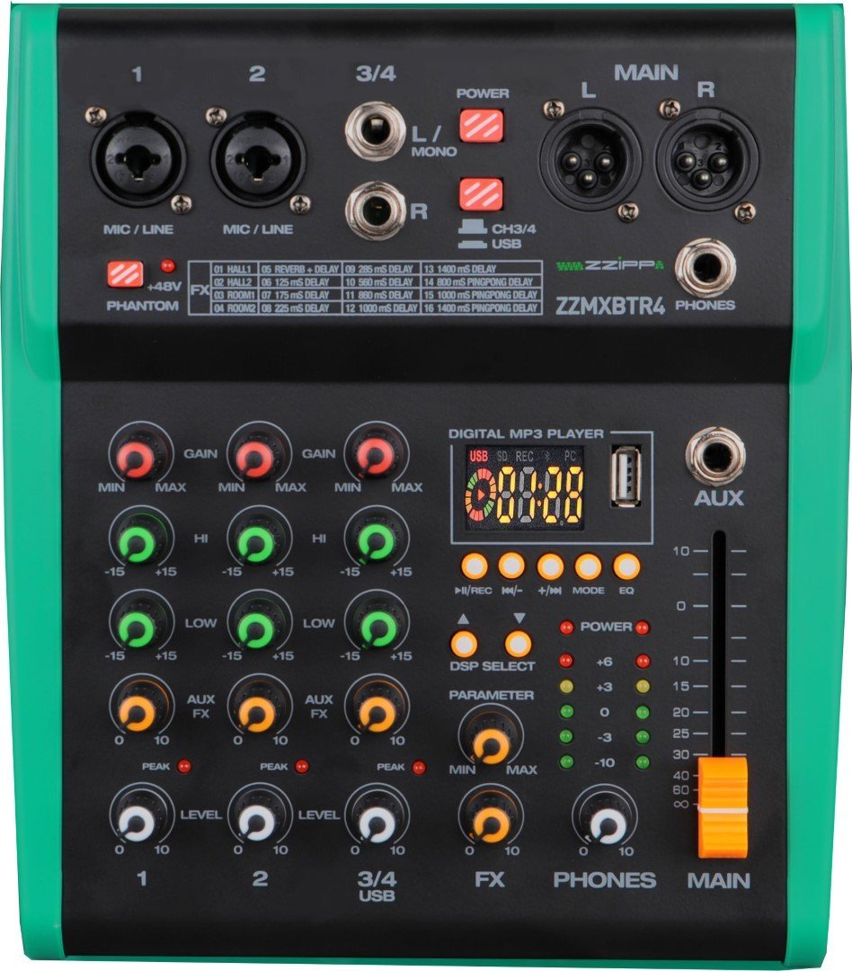 ZIPP ZZMXBTR4. Compact 4-channel mixer with integrated mp3 player, Bluetooth connectivity and USB audio interface. Technical features include 2 Mic/Line input channels via XLR/TRS combo and 1 stereo channel on dual jack input with 2-band eq, FX, gain and level control, integrated DSP with 16 digital effects, MP3 media player with USB slot and Bluetooth streaming and LCD display with function keys. It has balanced output through 2 XLR-M connectors, aux input and headphone output through 6.3 mm jack