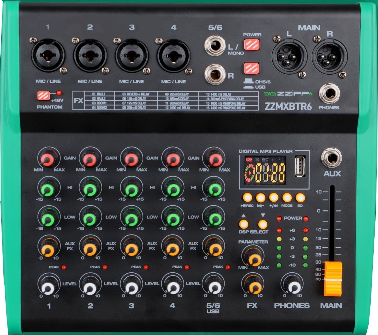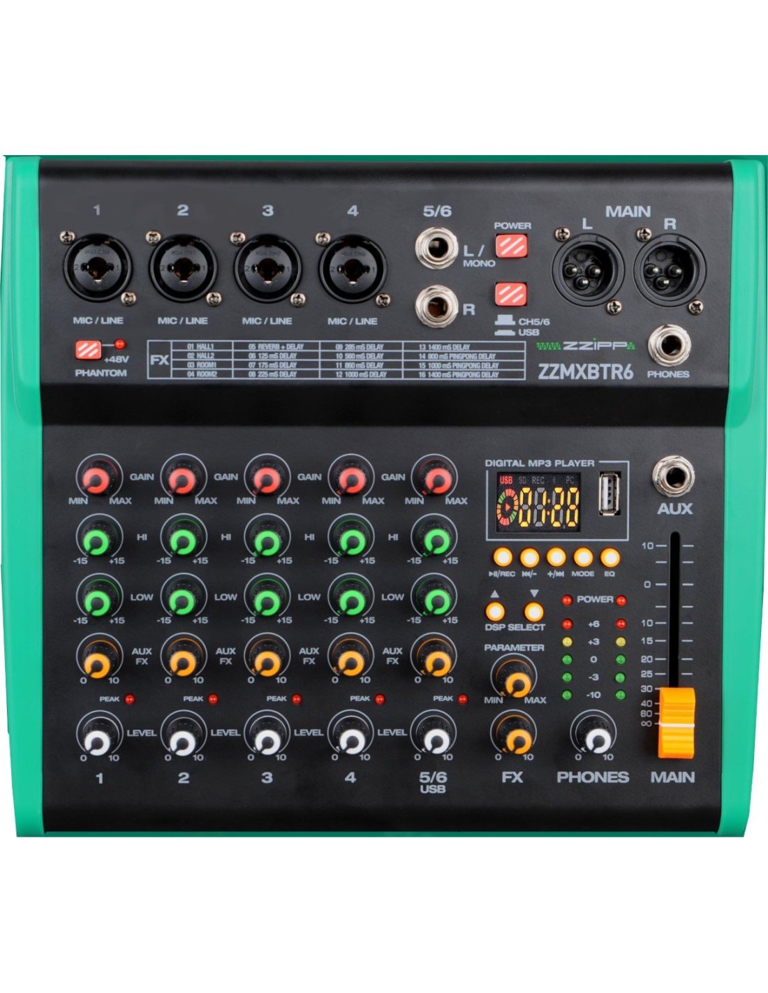 ZIPP ZZMXBTR6. 6-channel analog mixer with integrated DSP with 16 digital effects, Bluetooth connection, mp3 player and audio interface. Technical features include 4 mic/line channels via XLR/TRS combo, 1 stereo/line channel via TRS and USB connection, aux in TRS, main output via XLR. It has 2-band eq on each channel with gain controls, aux, MP3 player via USB and display