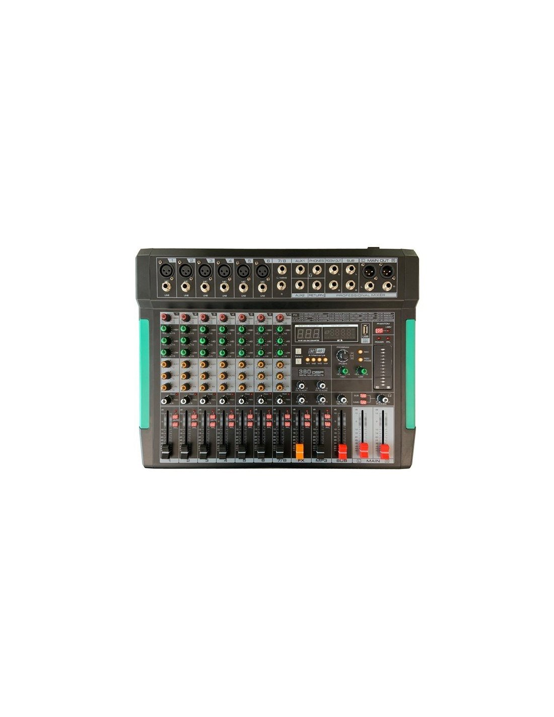ZIPP ZZMX8RBT. 8-channel analog mixer with 4-memory DSP with 380 integrated digital effects, Bluetooth connection, mp3 player and audio interface. Technical features include 6 mic/line channels via XLR microphone input, 1 stereo/line channel via TRS and USB connection, aux in via TRS with control on each input, main output via XLR, SUB/headphone/control room outputs via TRS. It has 3-band eq on each channel with gain controls, aux, MP3 player via USB