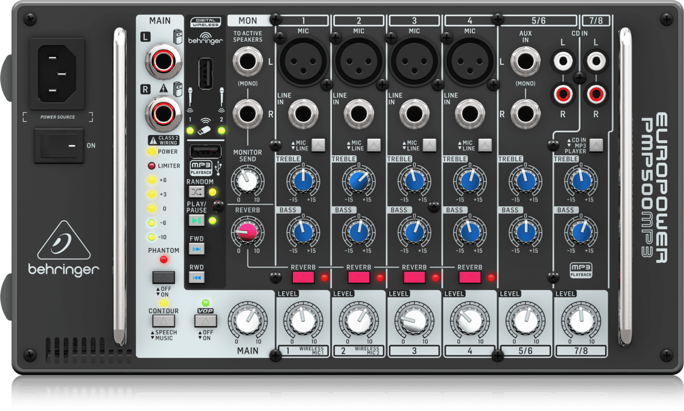 BEHRINGER PMP500MP3. 8-channel mixer with integrated MP3 player. Technical features include 4 XENYX microphone preamplifiers, 500W of power, 4 XLR/TRS mono inputs and 2 stereo inputs, including 1 on TRS and 1 on dual RCA, L/R outputs via TRS with output volume control, selectable +48v phantom power, 2-band Eq on each channel (Treble, Bass) with reverb button on the first 4 channels and separate control. It includes Voice Over Priority function, Wireless ready function via dedicated USB port, Music/speech selector for a differentiated Eq setting, MP3 player included with function keys