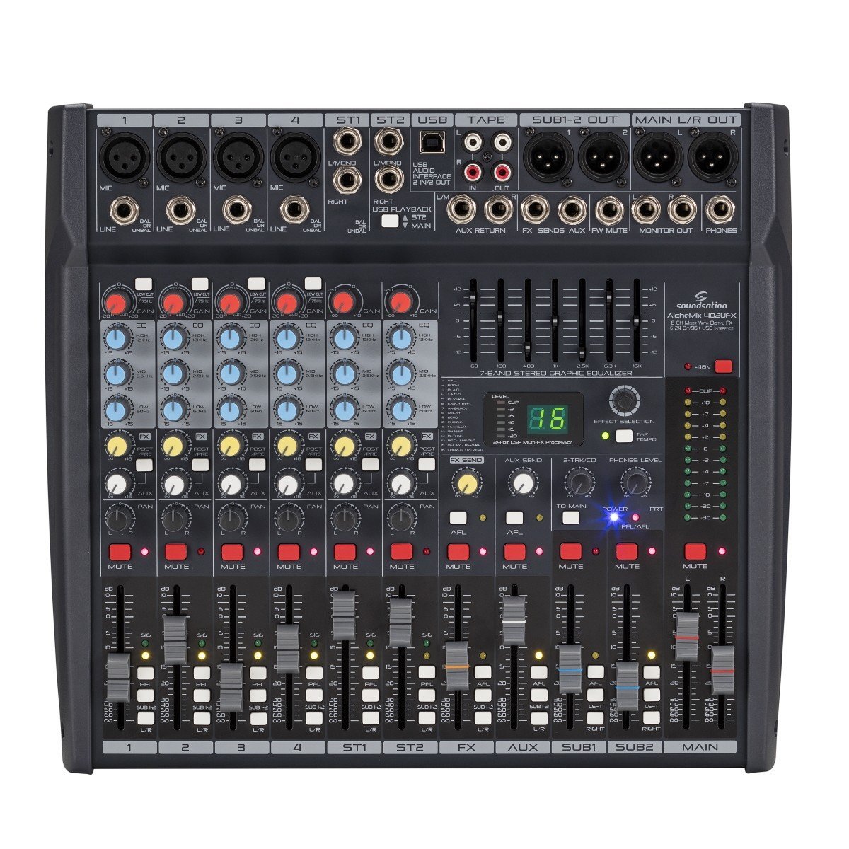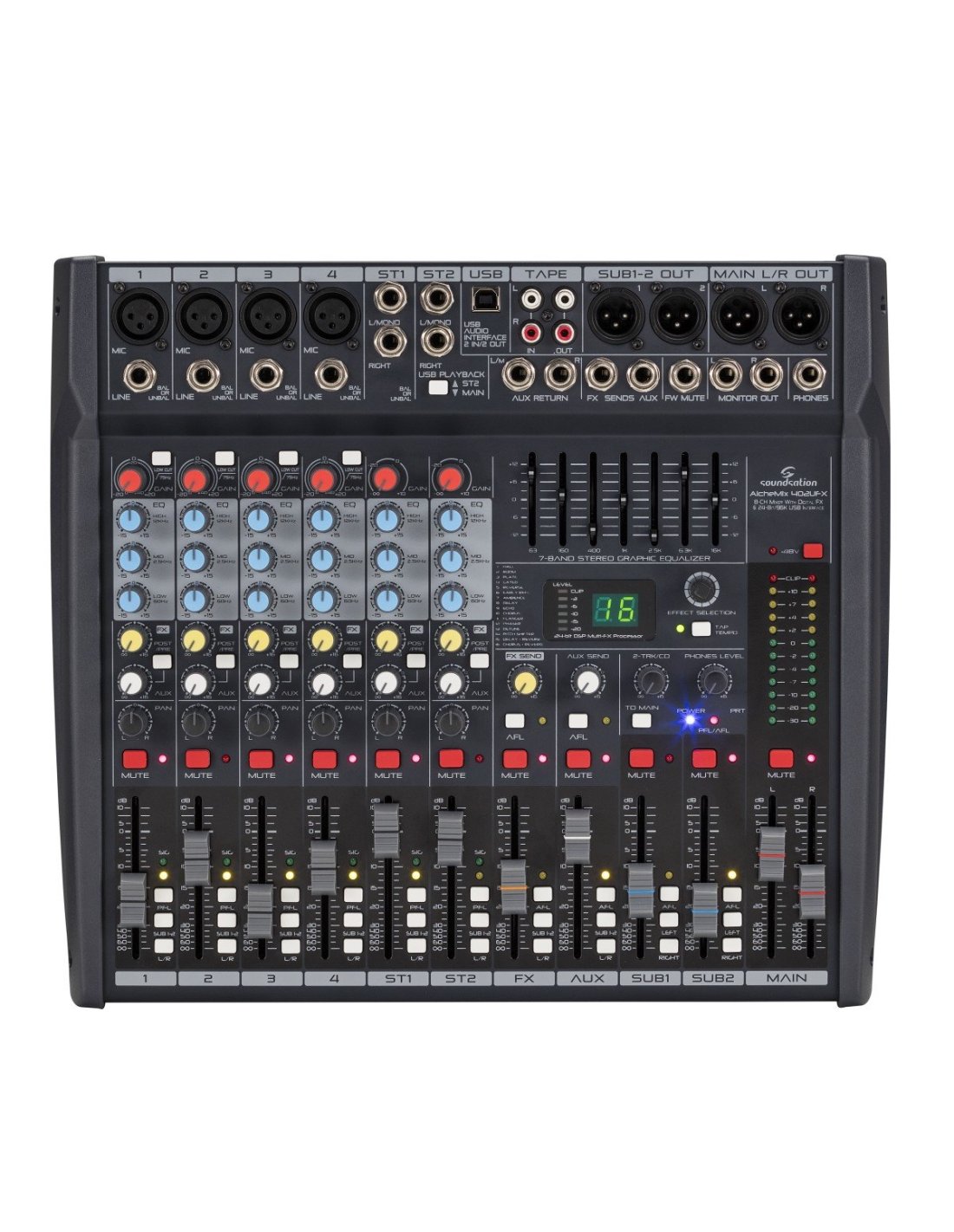 SOUNDSATION ALCHEMIX 402 UFX. 8-channel USB analog mixer with integrated 24-bit digital effects DSP and 2-In/2-Out USB Stereo audio interface. Technical features include 4 mono channels with 4 microphone preamplifiers via XLR, line input via TRS, 2 stereo channels with TRS mono/L/R input, 3-band equalizer, low cut filters, volume, gain and effect control on all channels. It also features 7-Band graphic EQ with precision filters on the main bus, DSP with 16 digital effects, main outputs via balanced XLR and TRS, Sub output via XLR, Tape output via