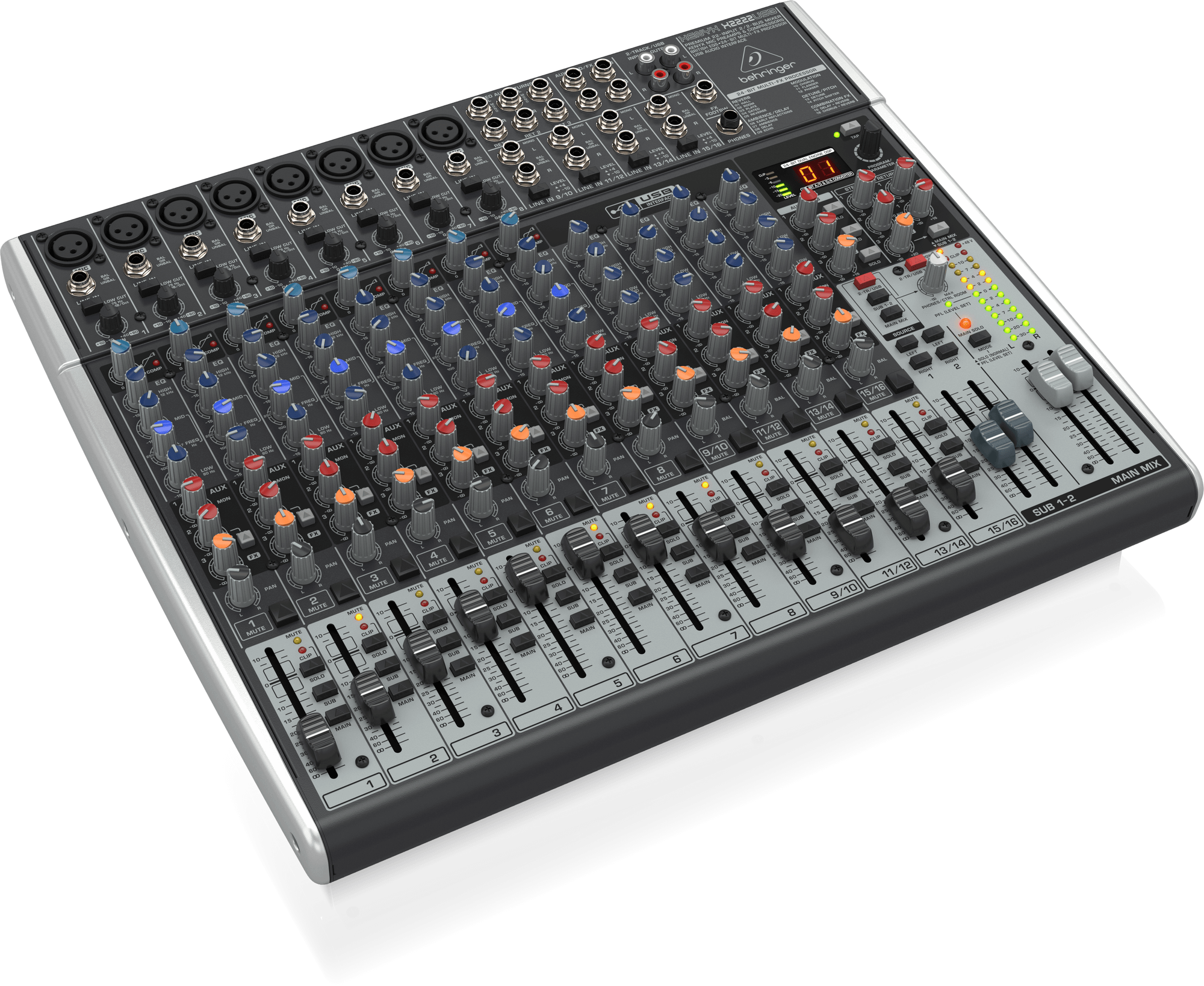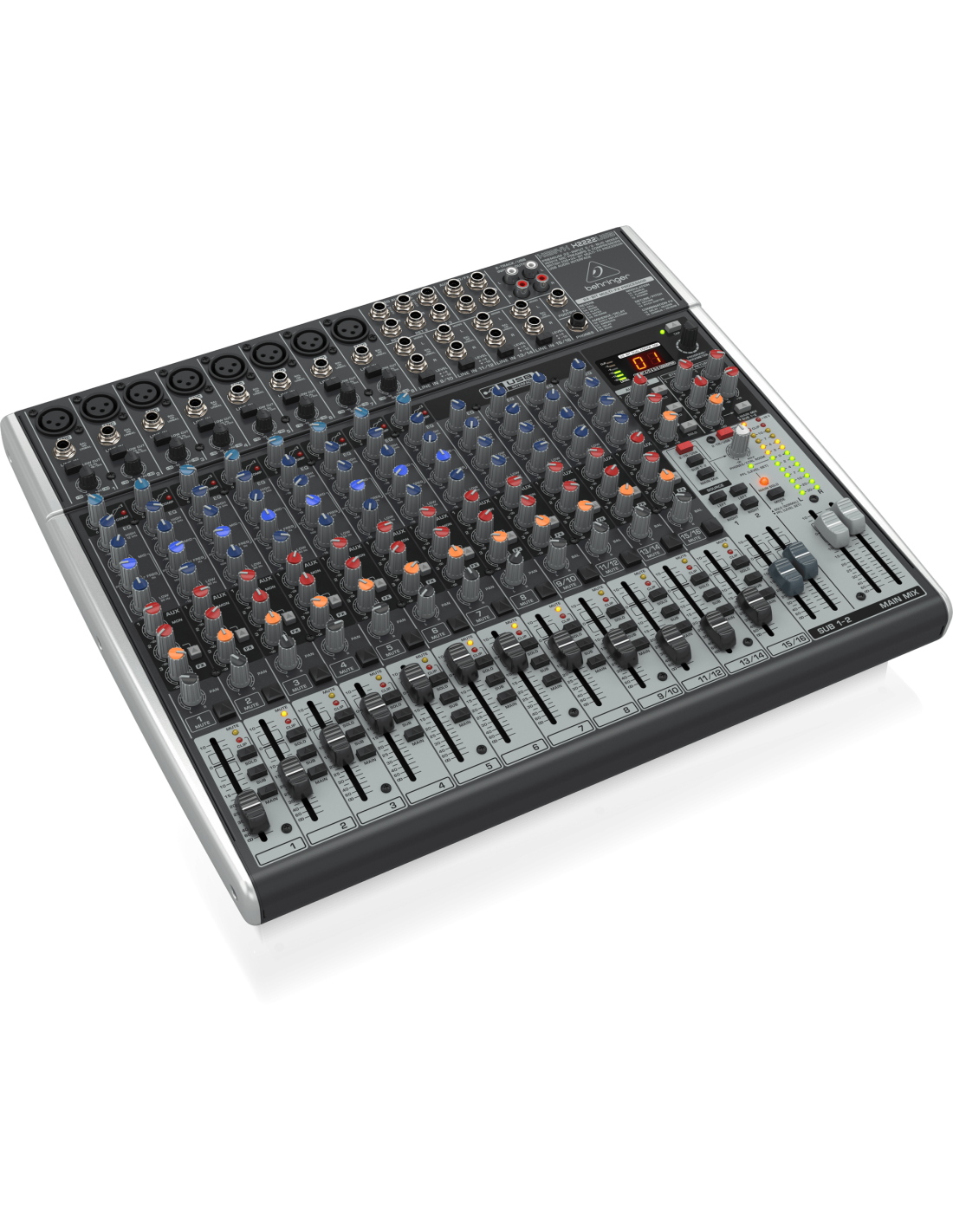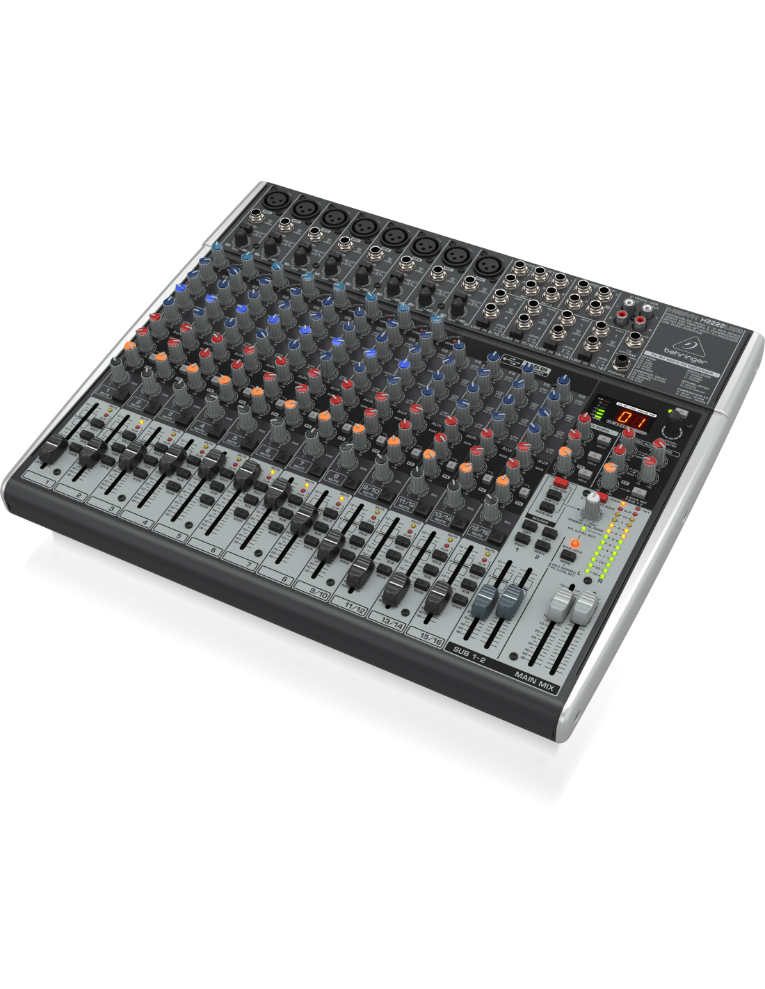 8 XENYX microphone preamplifiers with phantom power +48v Line inputs via TRS 3-band equalizer on each channel 8 one-knob compressors on microphone channels Klark Teknik effect processor 9-band graphic stereo equalizer with FBQ feedback detection system integrated USB audio interface XPQ 3d technology Voice Canceller function 3 Aux sends per channel 2 Aux return 2 subgroups with separate outputsMain outputs via balanced XLR and TRS Control room/headphone output via TRS DOWNLOAD THE GUIDE