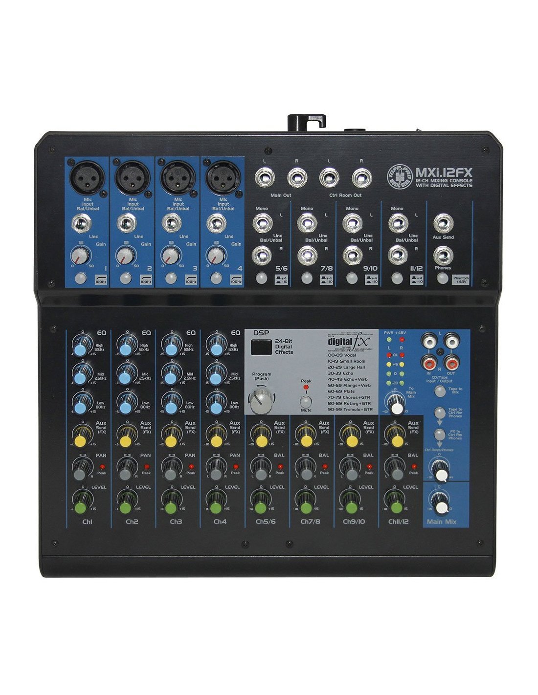 TOP BY MXI-12FX. Compact 12-channel mixer with 4 microphone inputs via XLR, 4 stereo line inputs via 6.3 mm L/R jack, 3-band equalizer on all input channels, integrated 24-bit digital multi-effect engine with 100 selectable effect presets, separate Mix and Control Room outputs, Tape inputs and outputs on RCA, 1 aux send per channel, headphone output,