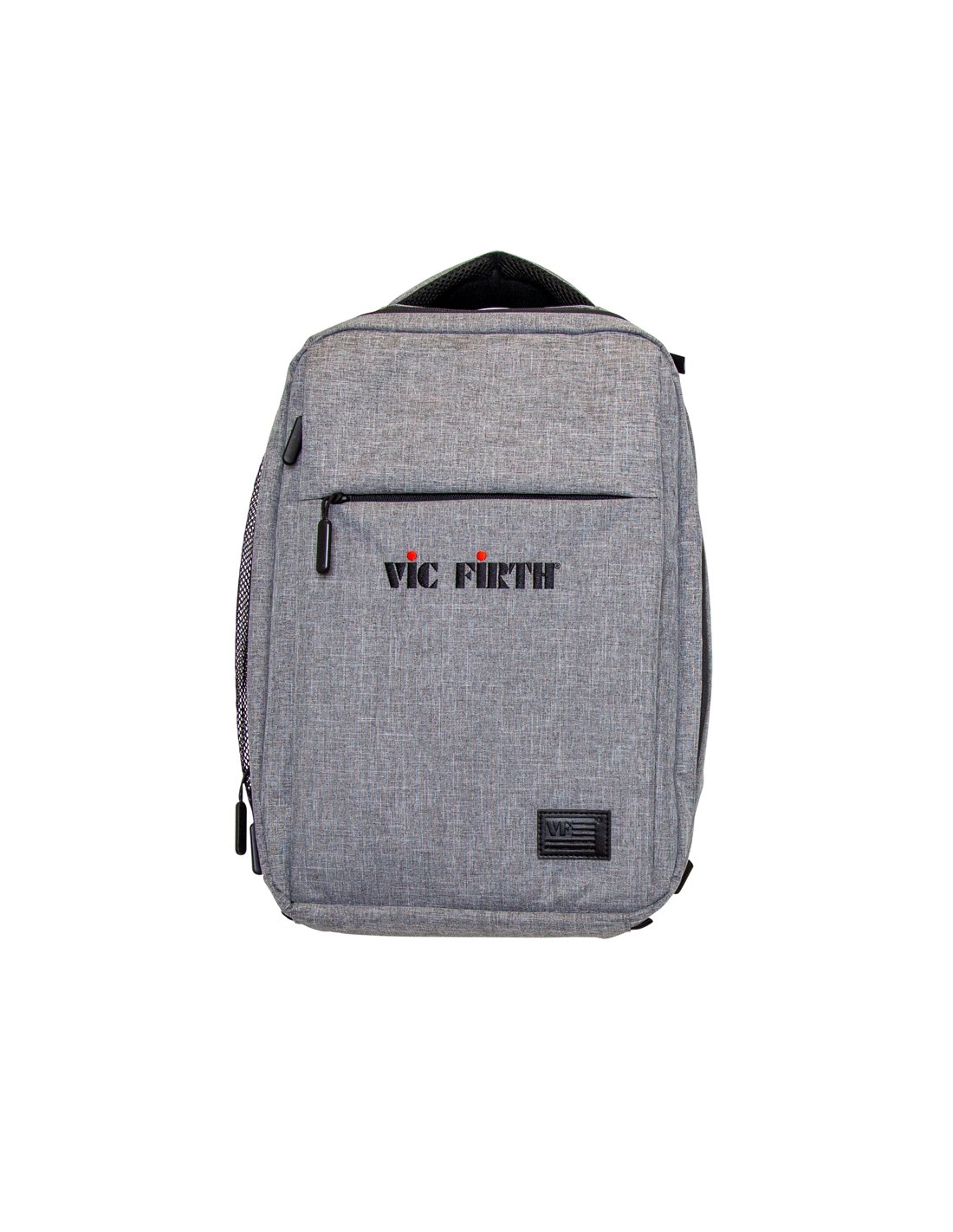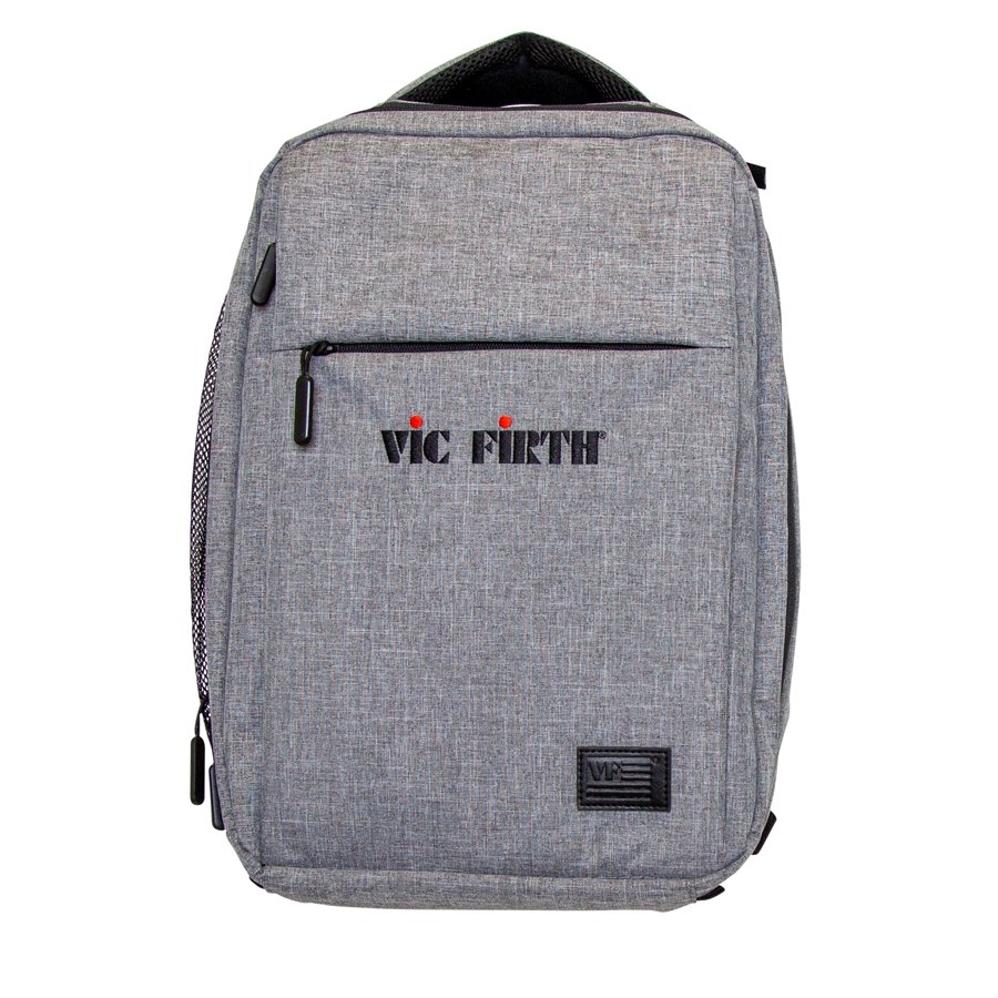 The Vic Firth PBKPK backpack - Vic Firth Gray Travel Backpack is Vic Firth's fashionable unisex travel backpack with functional details perfect for traveling drummers with a padded laptop and tablet pocket and a side mesh pocket for drumsticks.