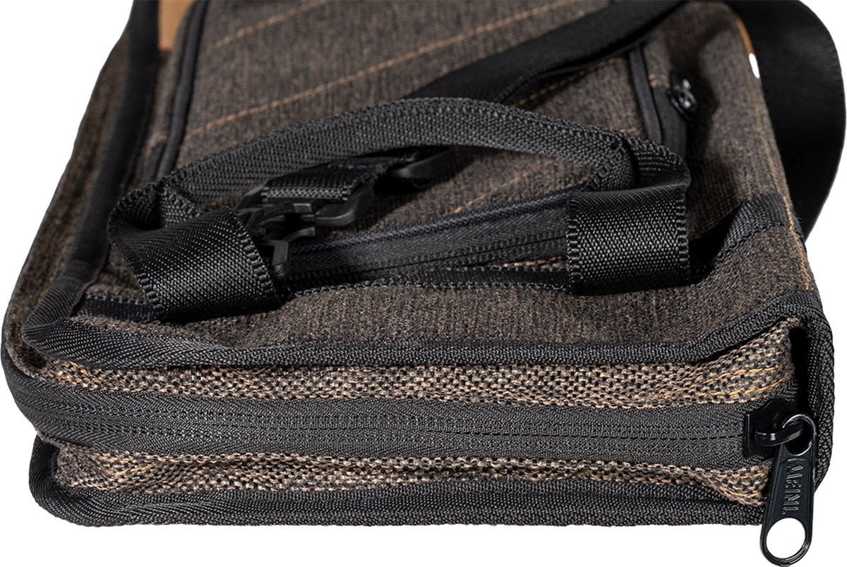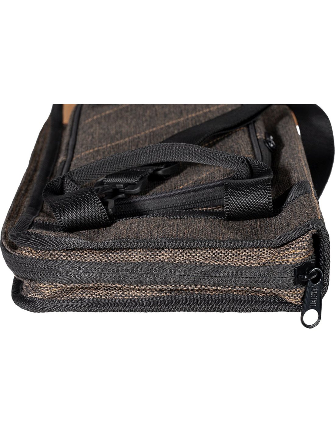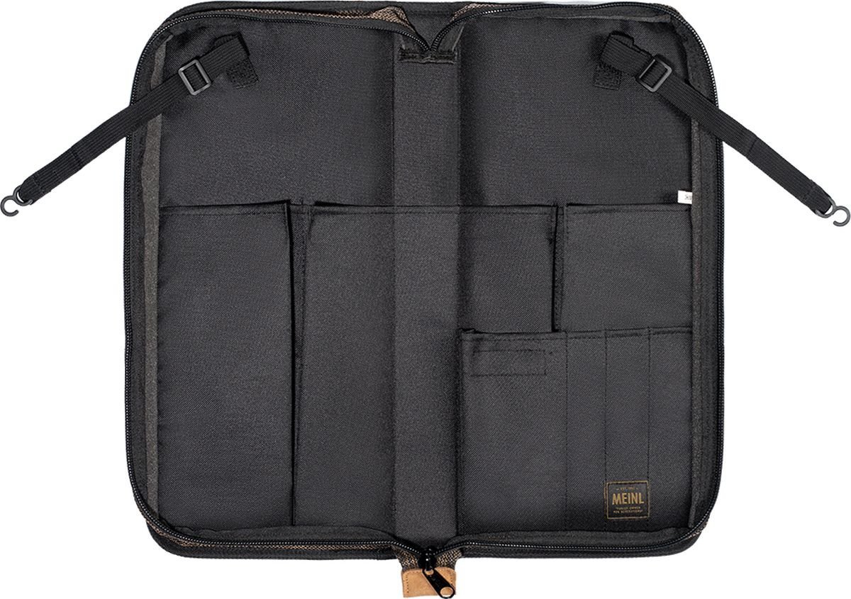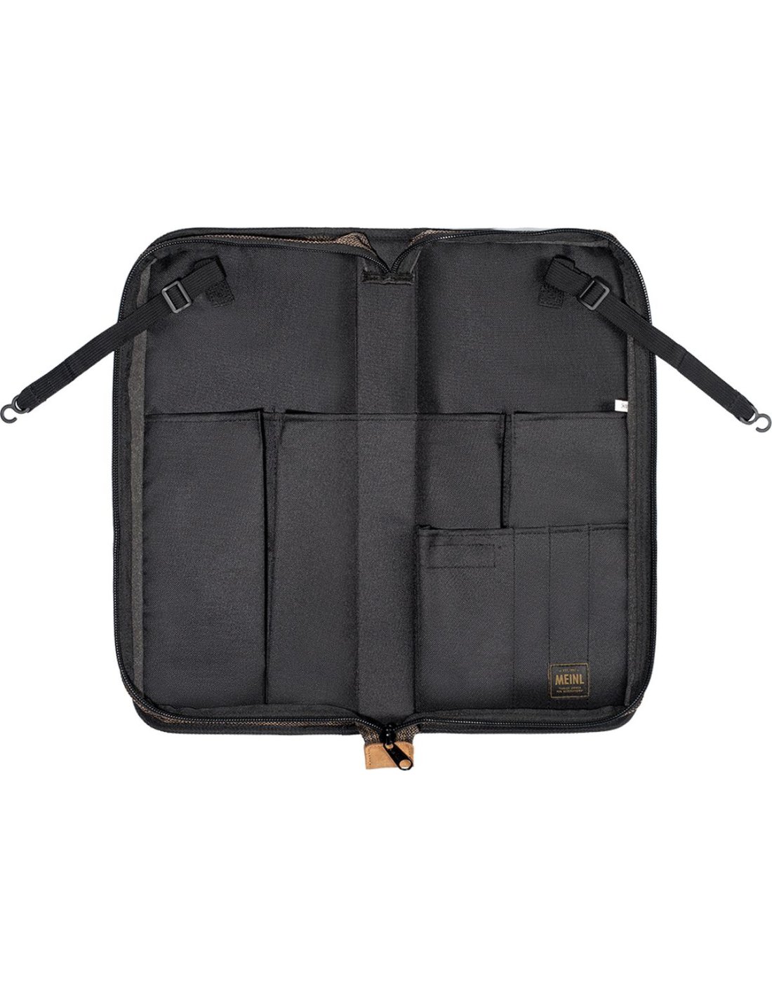 Our ultra durable 600D polyester outer fabric is reinforced with a PVC coating for added durability. It also has suede details on the bottom. Inside the main compartment there are five pockets for storing a large number of chopsticks, brushes, beaters and clubs (4 large bellows pockets and 1 additional pocket). In addition, there are four smaller accessory pockets to accommodate parts or sound effects. This bag is equipped with adjustable length floor tom hooks and straps to keep it in the open position. For quick access, the large outer pocket is sized for common accessories or tools. An adjustable/removable shoulder strap allows you to comfortably carry this bag to concerts or to the studio.