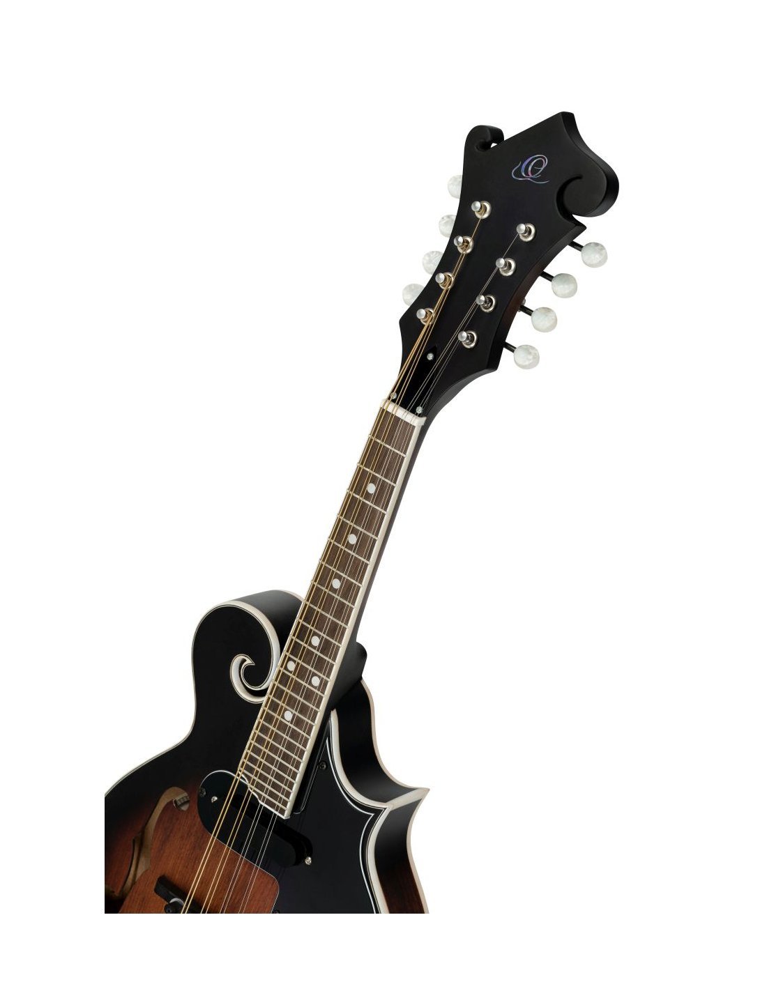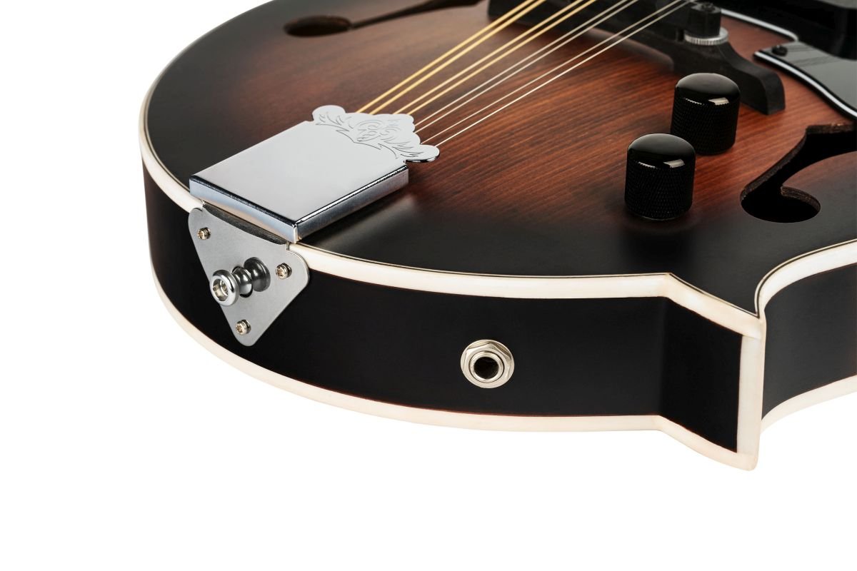 'Amplified F-Style Satin Whiskey Burst Mandolin. The Americana series blends traditional looks with modern features, just like its musical roots. Finishes such as Distressed Satin Whiskey Burst or Distressed Satin Denim emphasize its origin. In the Americana series you can find the typical instruments for blues, bluegrass and folk. Mandolins have the very popular Florentine shape with a snail shape on the body and an additional snail shape on the head plate. Spruce top, whiskey burst satin finish Maple back and sides, satin whiskey burst finish Maple handle, whiskey burst satin finish Rosewood keyboard Single coil with tone and volume control, passive 22 frets Style F Scale 350mm/13.78" Head Width: 28mm Ortega2023 '