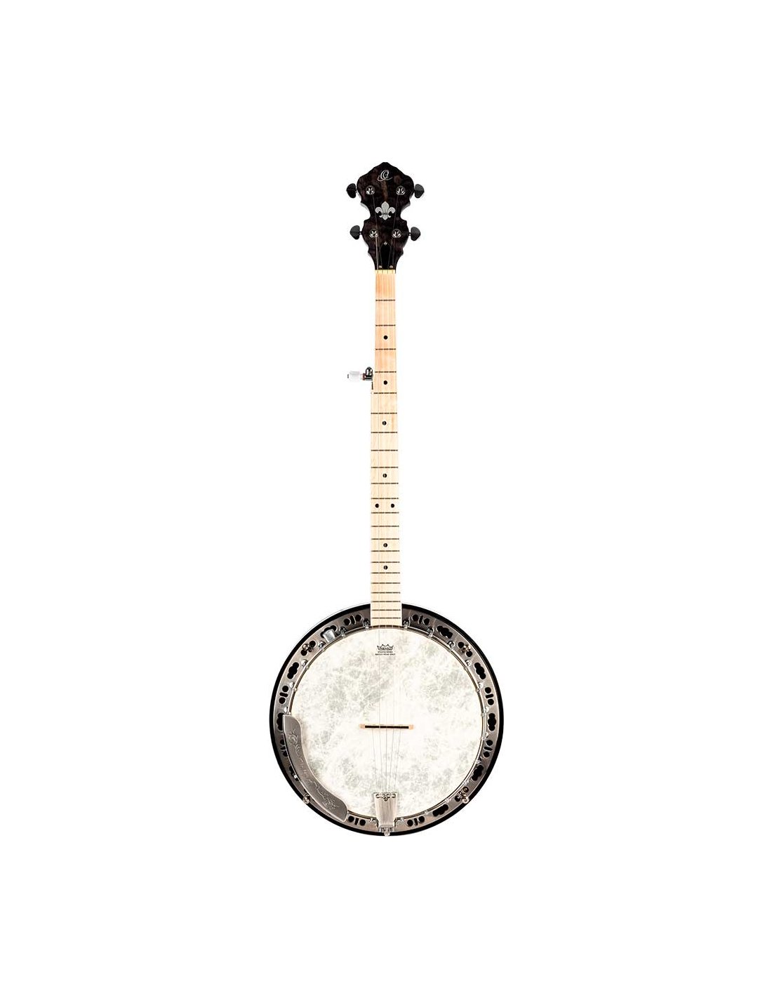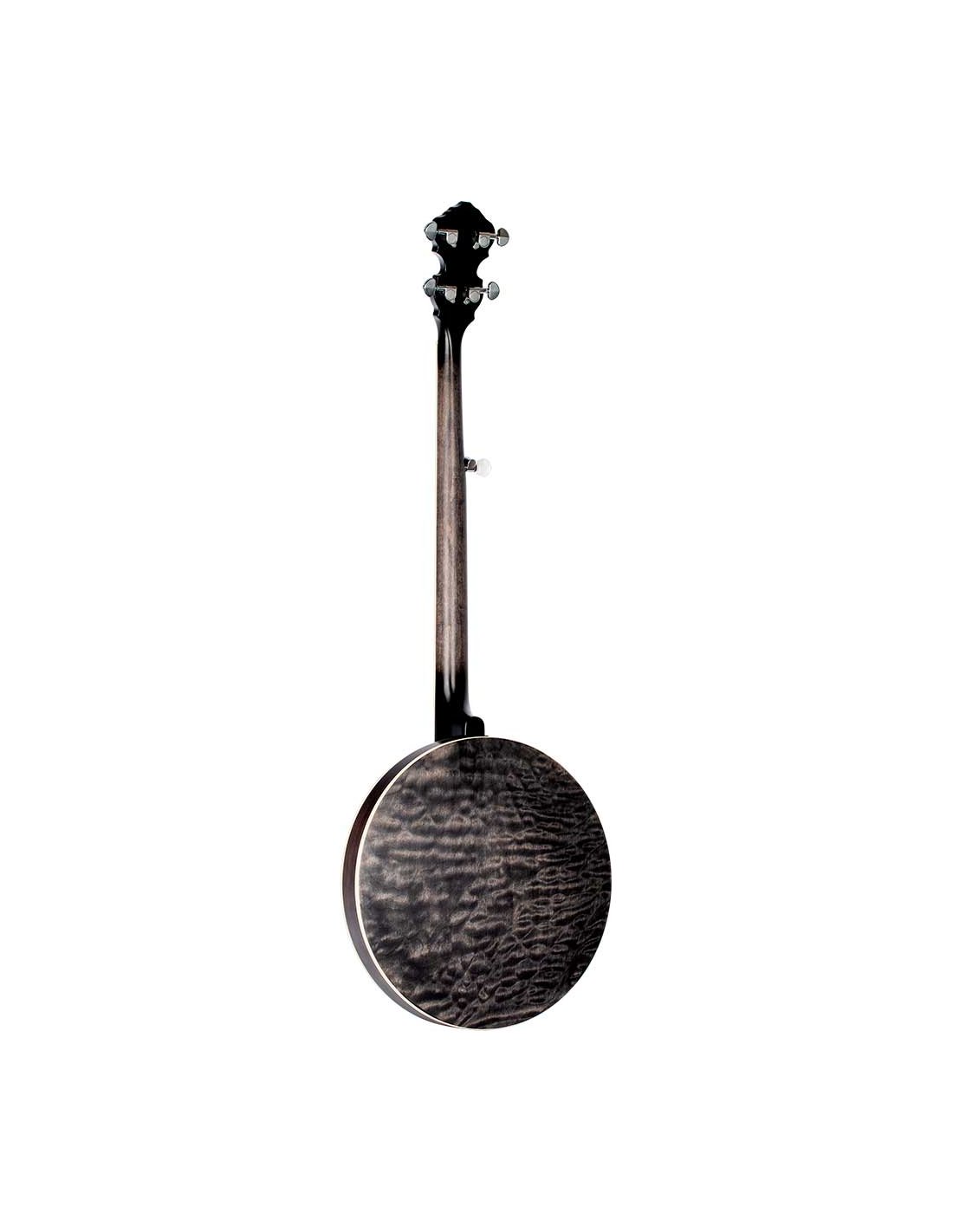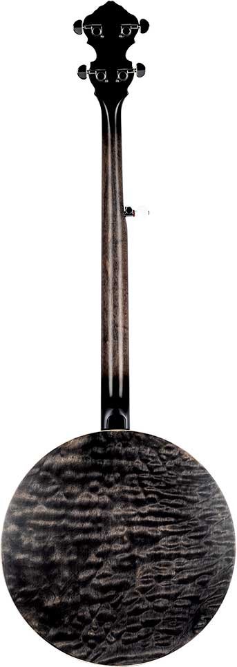 OBJE400TCO Falcon Series 5-String Electrified Banjo. Transparent Charcoal transparent color. Quilted maple resonator. Semi-glossy finish Extra solid maple handle Maple keyboard. Brass ring with 24 tensioners. Polished nickel hardware Remo Fiberkin style patch. Passive electronics with pickup and volume control. Deluxe case included.