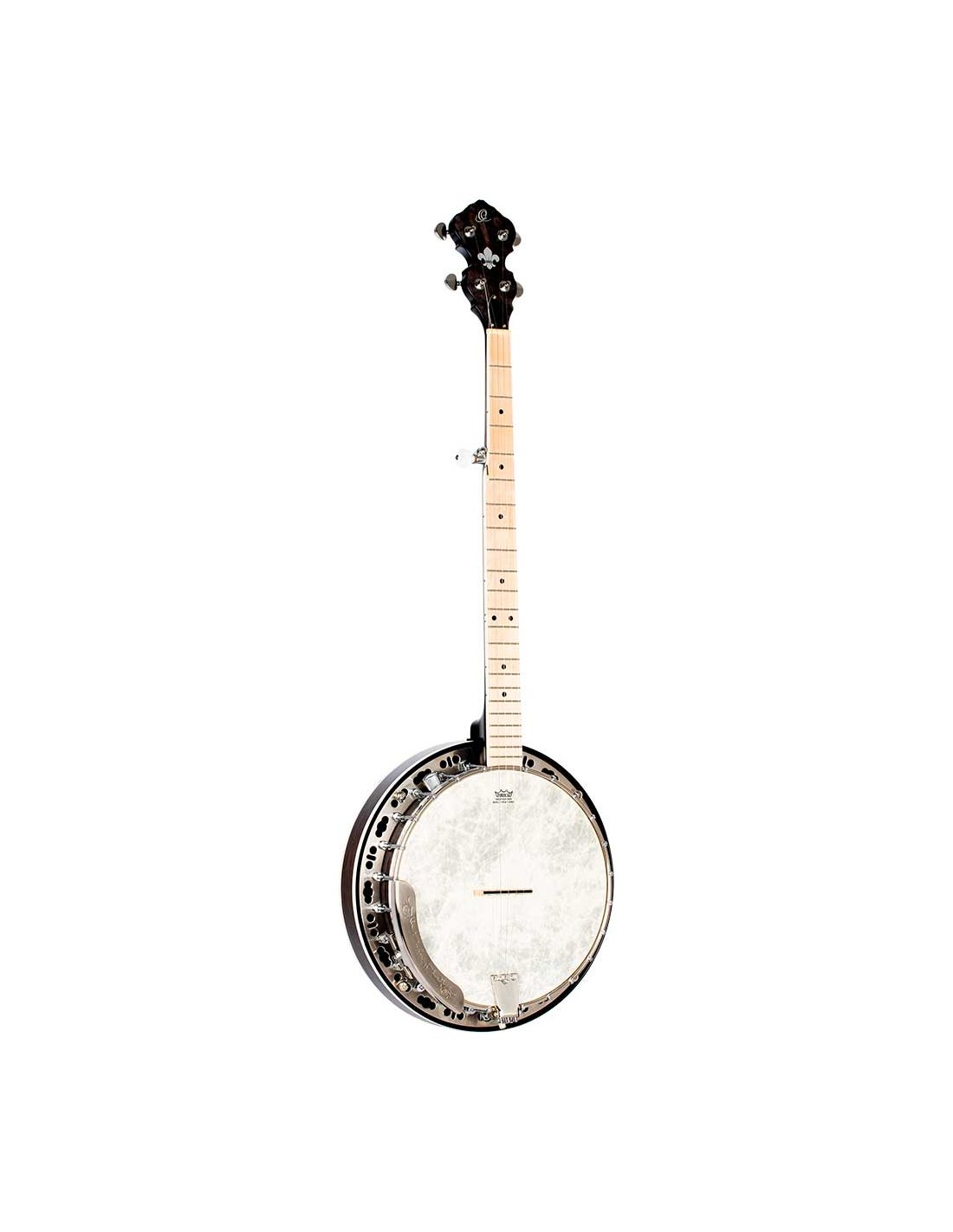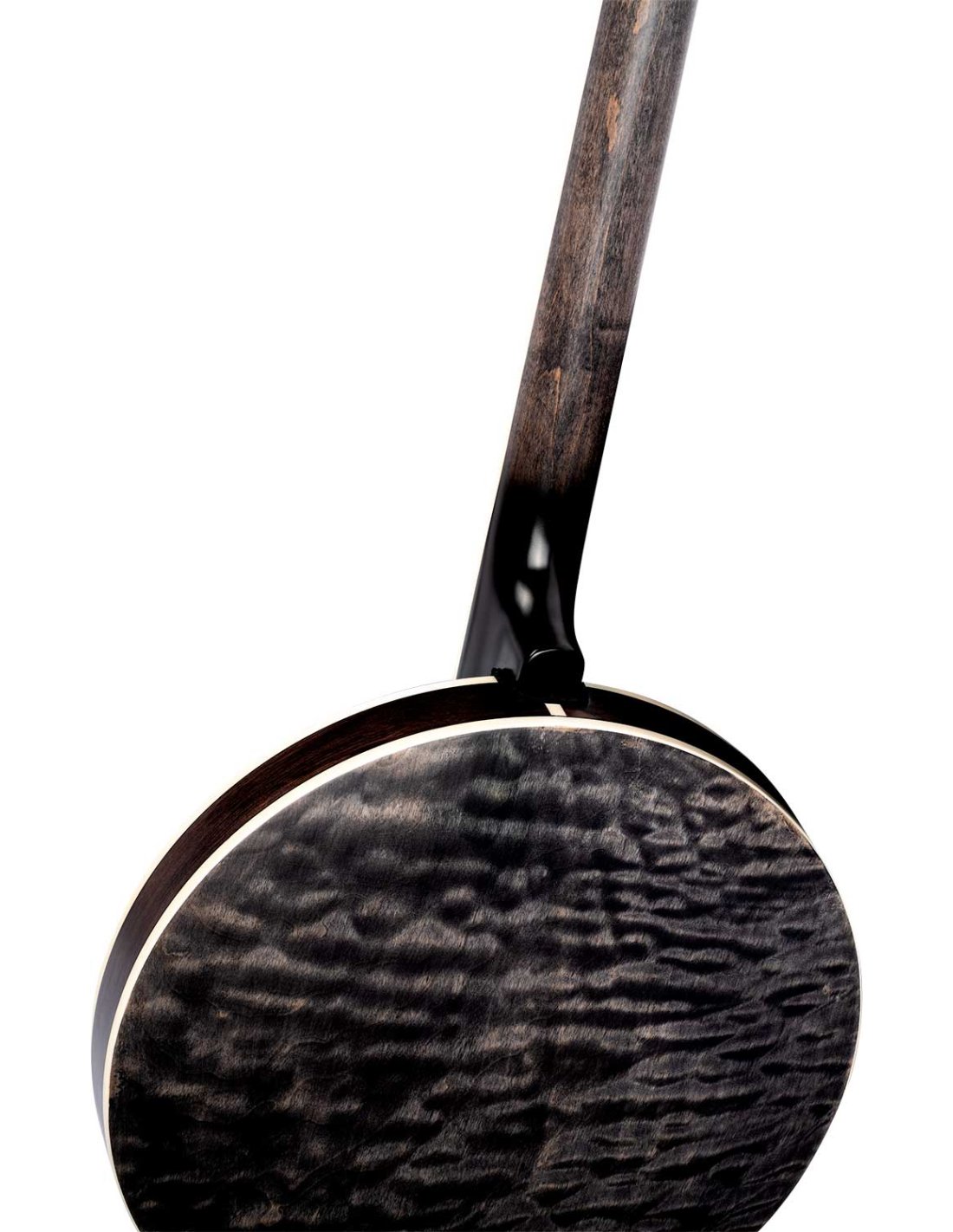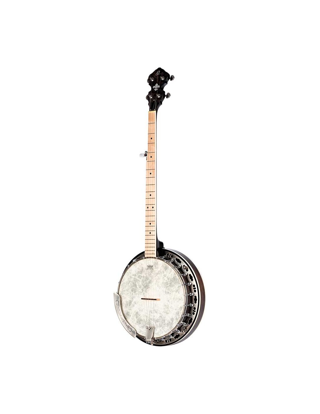 OBJE400TCO Falcon Series 5-String Electrified Banjo. Transparent Charcoal transparent color. Quilted maple resonator. Semi-glossy finish Extra solid maple handle Maple keyboard. Brass ring with 24 tensioners. Polished nickel hardware Remo Fiberkin style patch. Passive electronics with pickup and volume control. Deluxe case included.