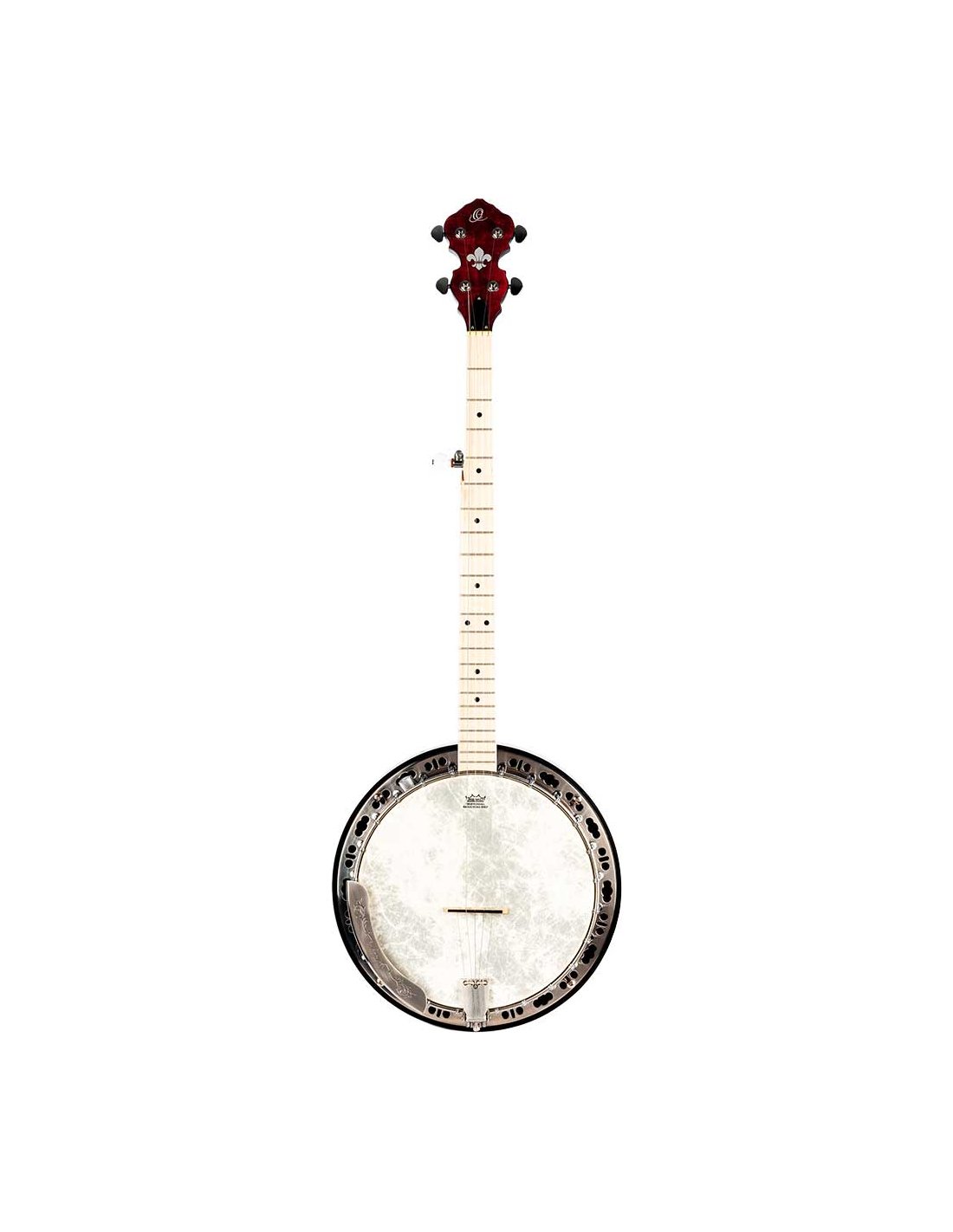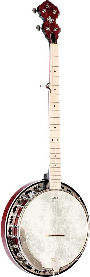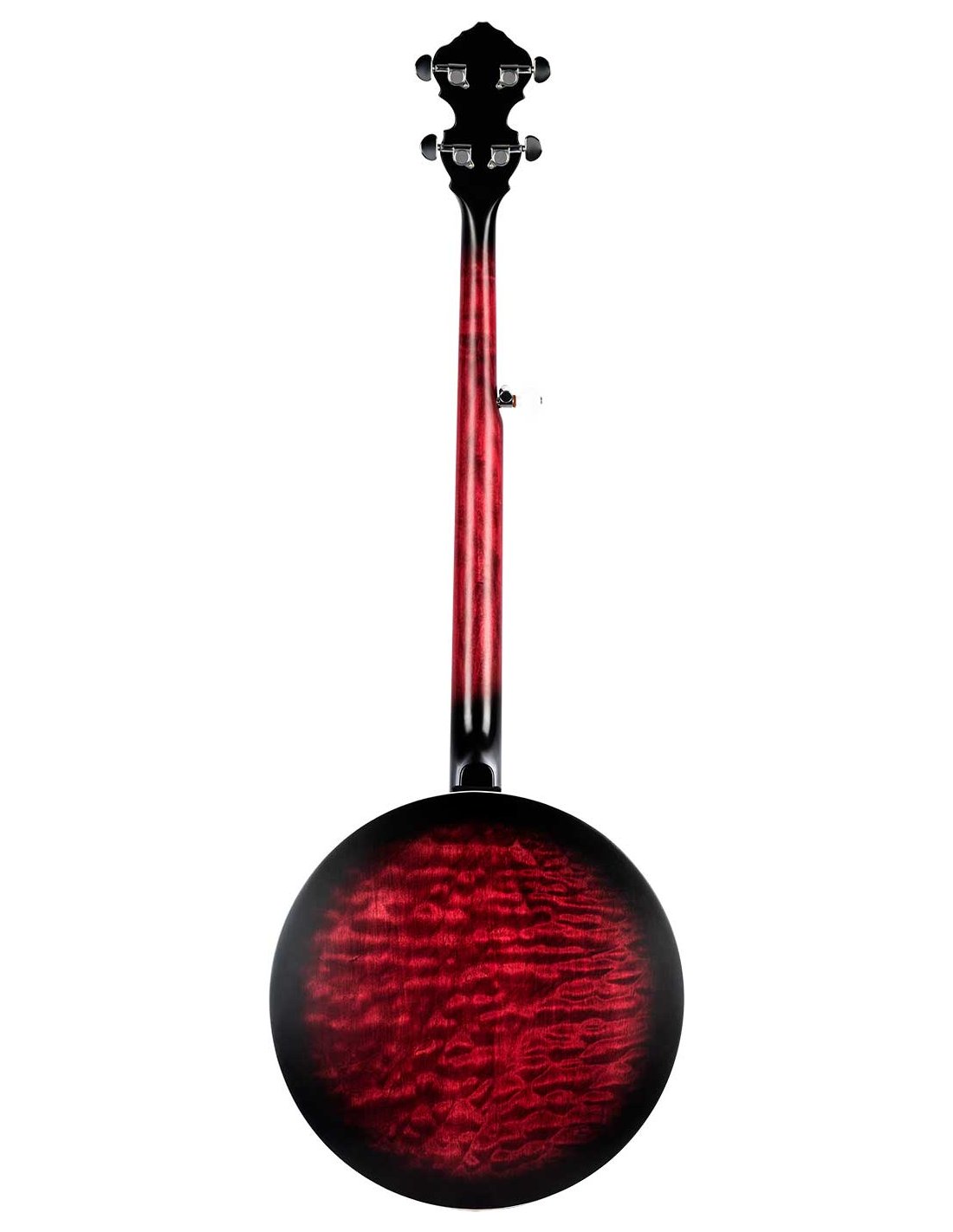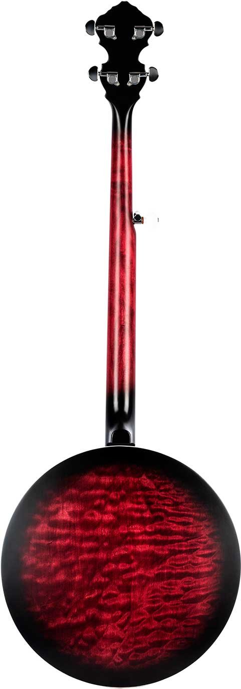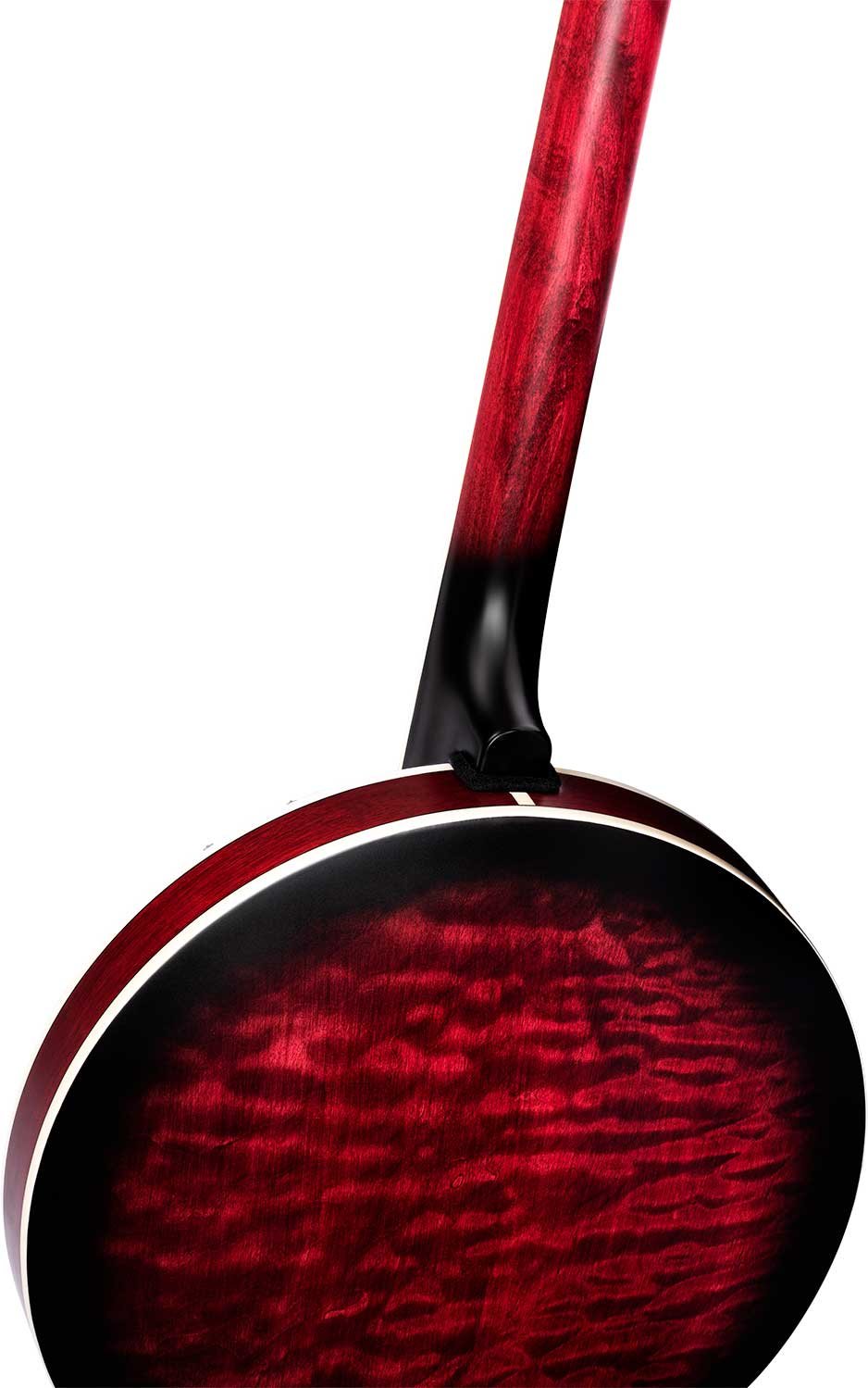 OBJE400TFR Falcon Series 5-String Electrified Banjo. Transparent Red Fade color. Quilted maple resonator. Semi-glossy finish Extra solid maple handle Maple keyboard. Brass ring with 24 tensioners. Polished nickel hardware Remo Fiberkin style patch. Passive electronics with pickup and volume control. Deluxe case included.