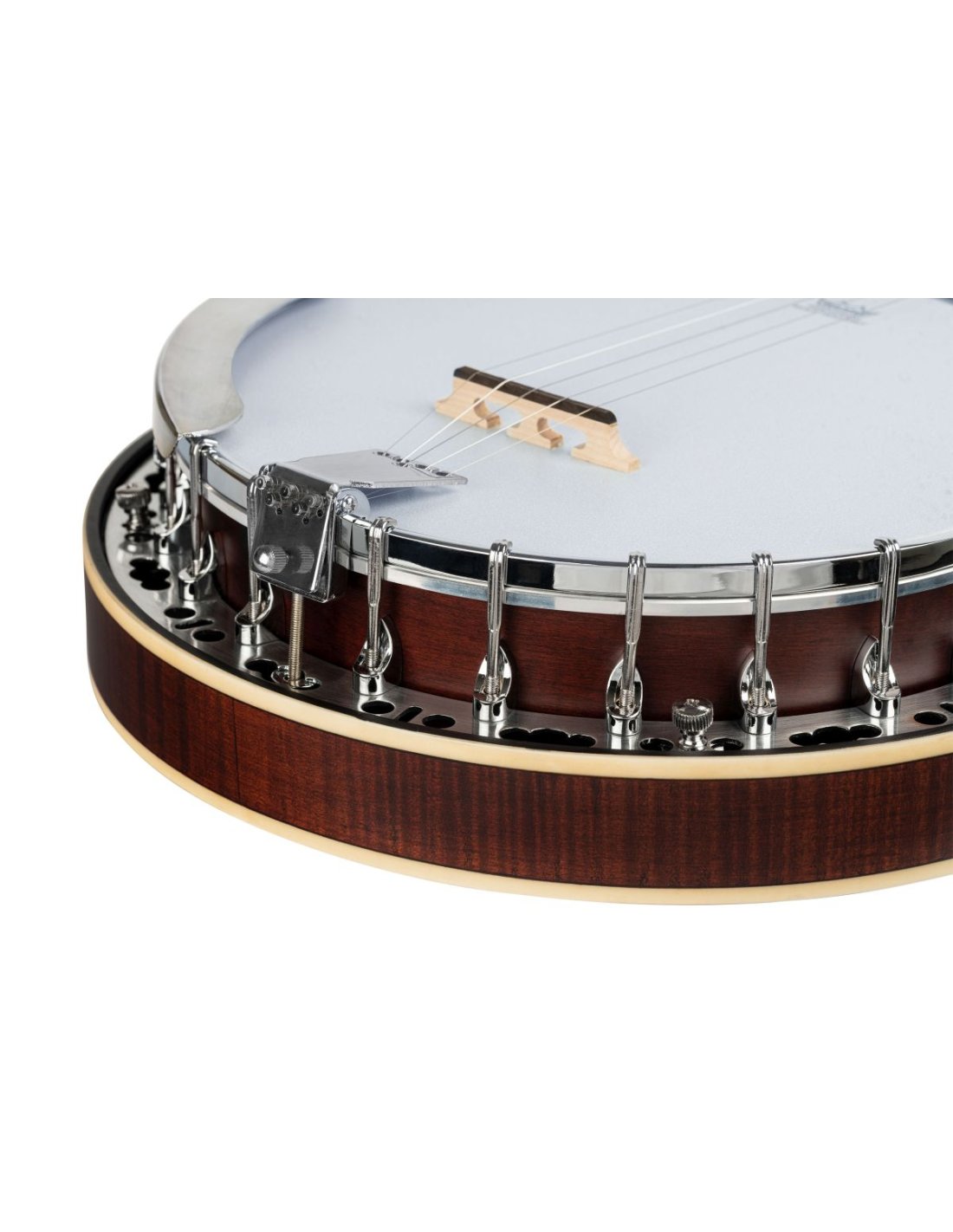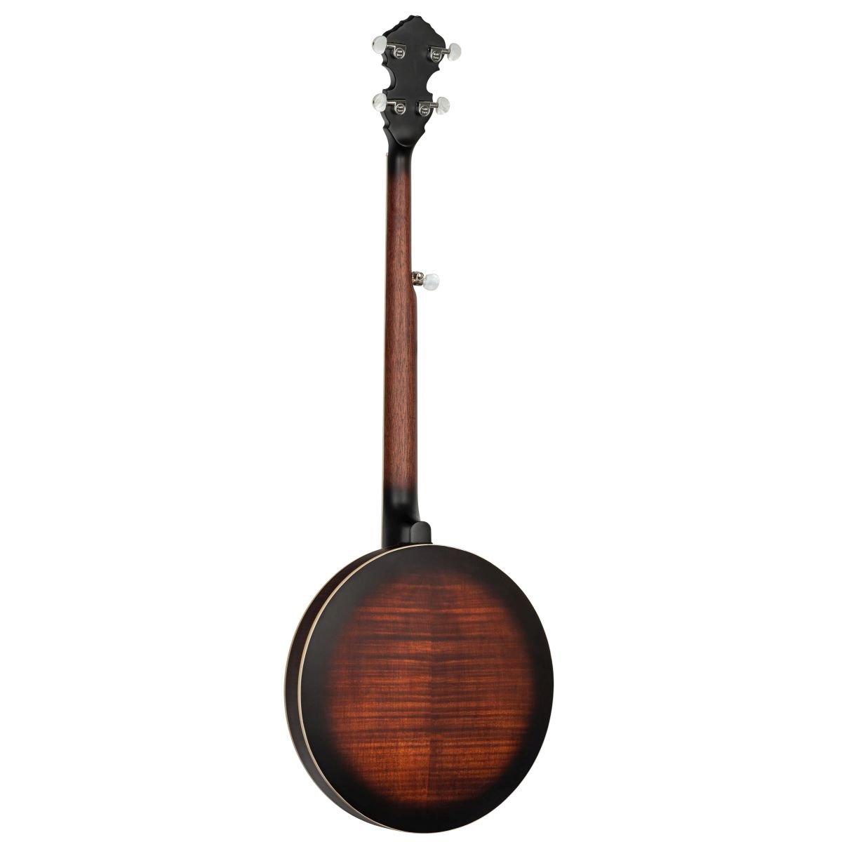 'Flamed Maple/Mahogany Satin Whiskey Burst 5-String Banjo. The Americana series blends traditional looks with modern features, just like its musical roots. Finishes such as Distressed Satin Whiskey Burst or Distressed Satin Denim emphasize its origin. In the Americana series you can find the typical instruments for blues, bluegrass and folk. Banjos have modern features and a classic look. 5-string banjo Mahogany neck, whiskey burst satin finish Rosewood fingerboard Flamed maple back, satin whiskey burst finish Mahogany bands, satin finish whiskey burst 24 brackets hardware chrome Remo leather, sandblasted Armrest chrome Maple/ebony bridge Head width: 31mm/1.22" Keys: 22 Ortega2023 '