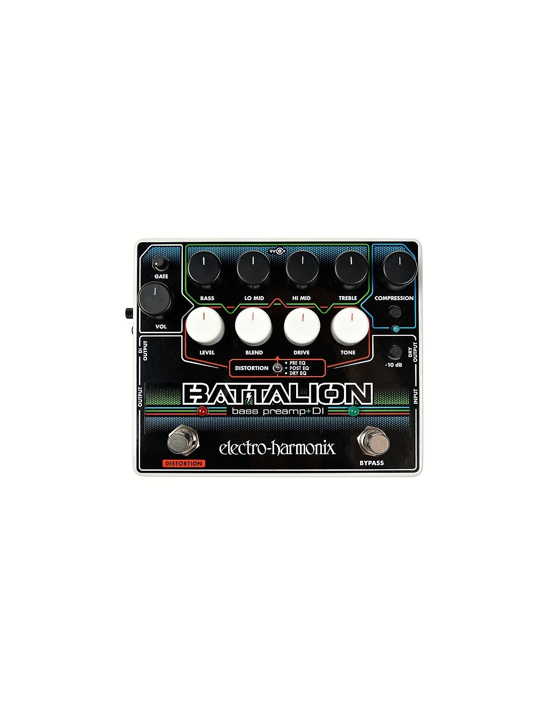 Electro Harmonix Battalion Bass Preamp + DI bass pedal. The Electro Harmonix Battalion Bass Preamp + DI is a preamp + DI that offers powerful abilities to create your own sound. Included features include a four-band equalizer, a MOSFET distortion section with three signal path options, a compressor, a noise gate,
