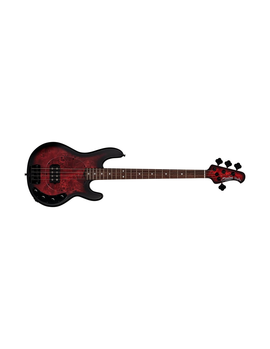 Lo Stingray Ray 34 PB Dark Scarlet Burst Satin è il basso elettrico 4 corde della serie "Stingray" di casa Sterling by Music Man. Presenta corpo in Nyatoh, top in Radica di Pioppo, manico in Acero Roasted e tastiera in Palissandro, 1 pickup Alnico humbucker alimentato da un preamp attivo con controlli di Volume ed eq a 3 bande.
