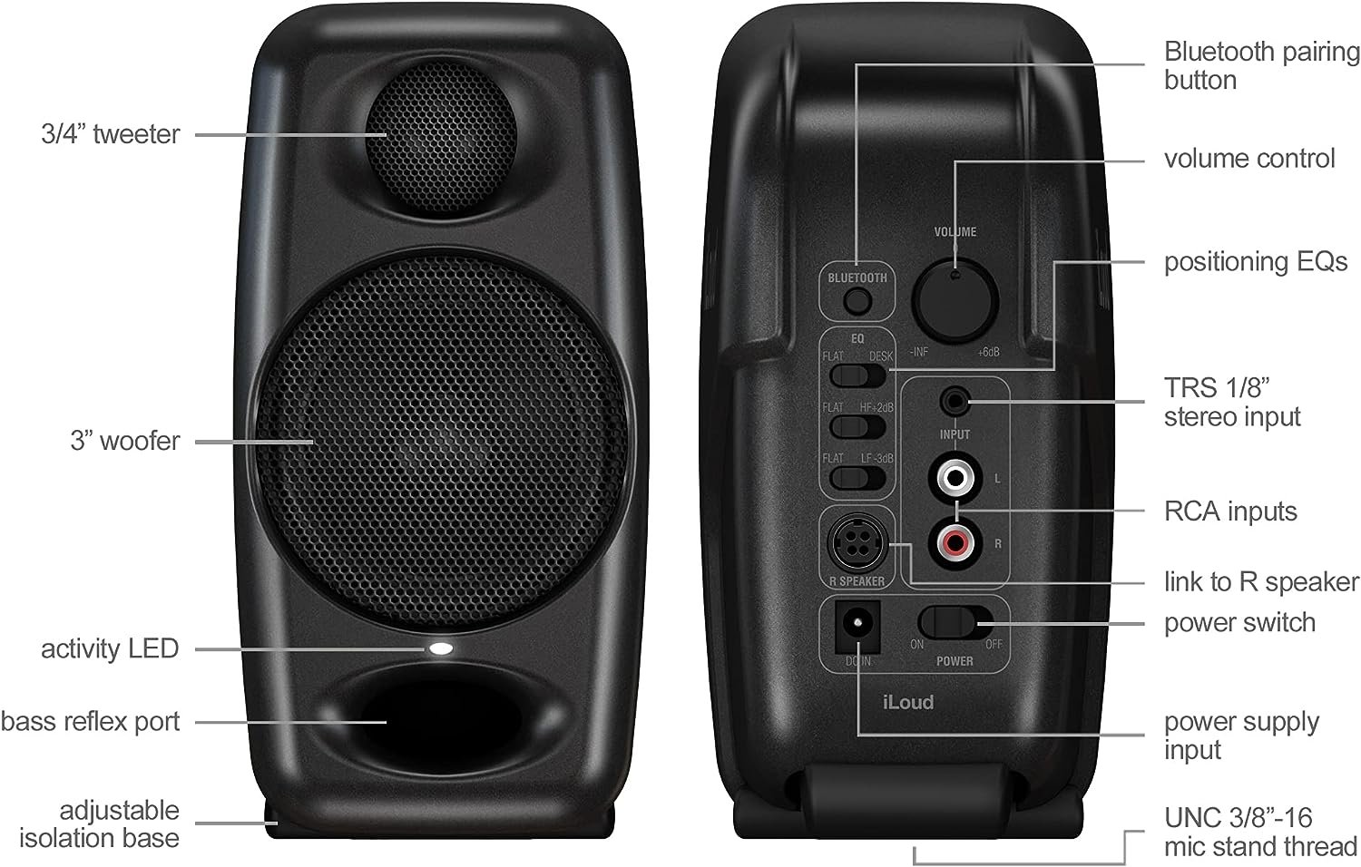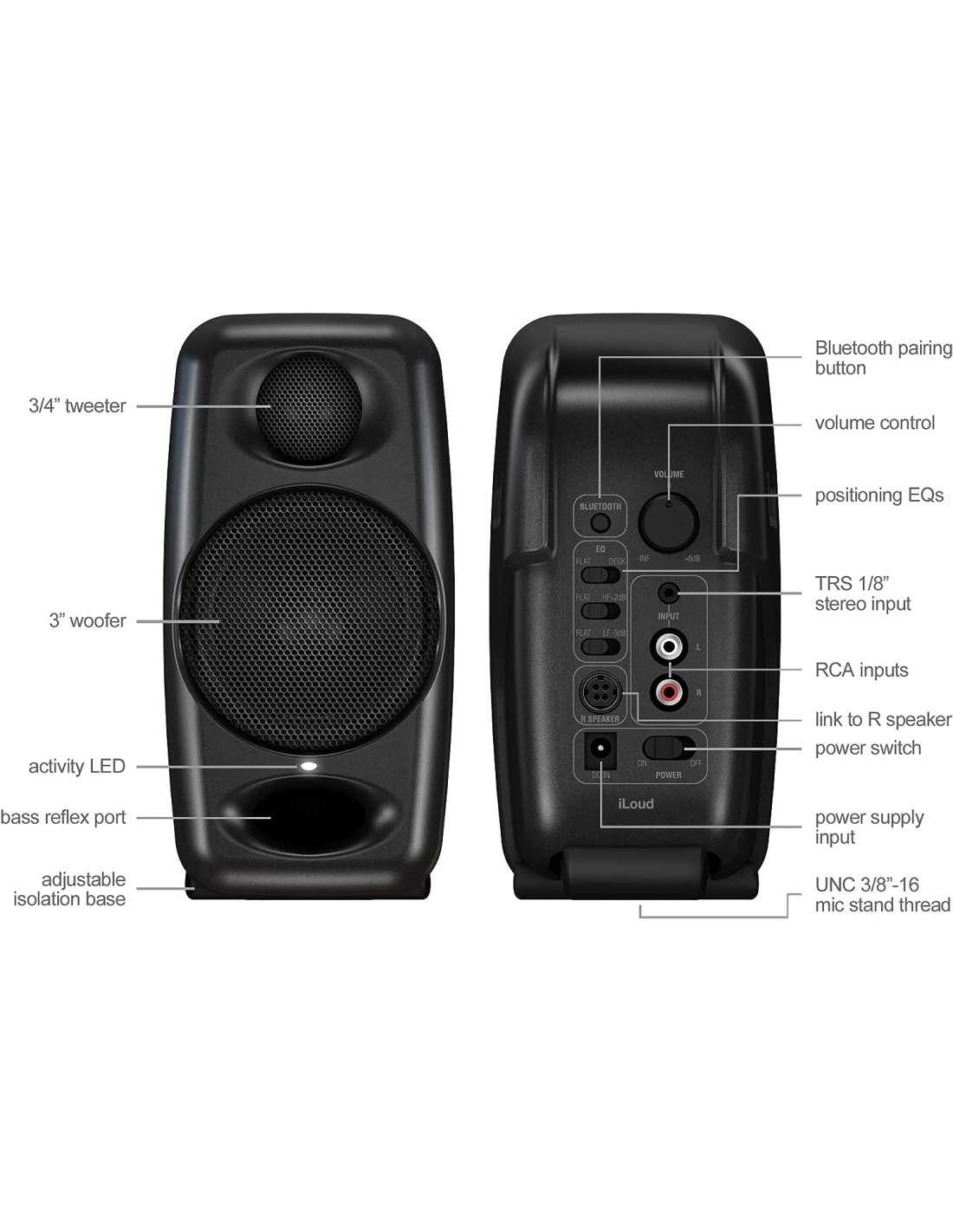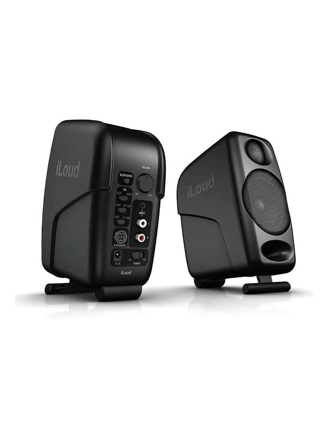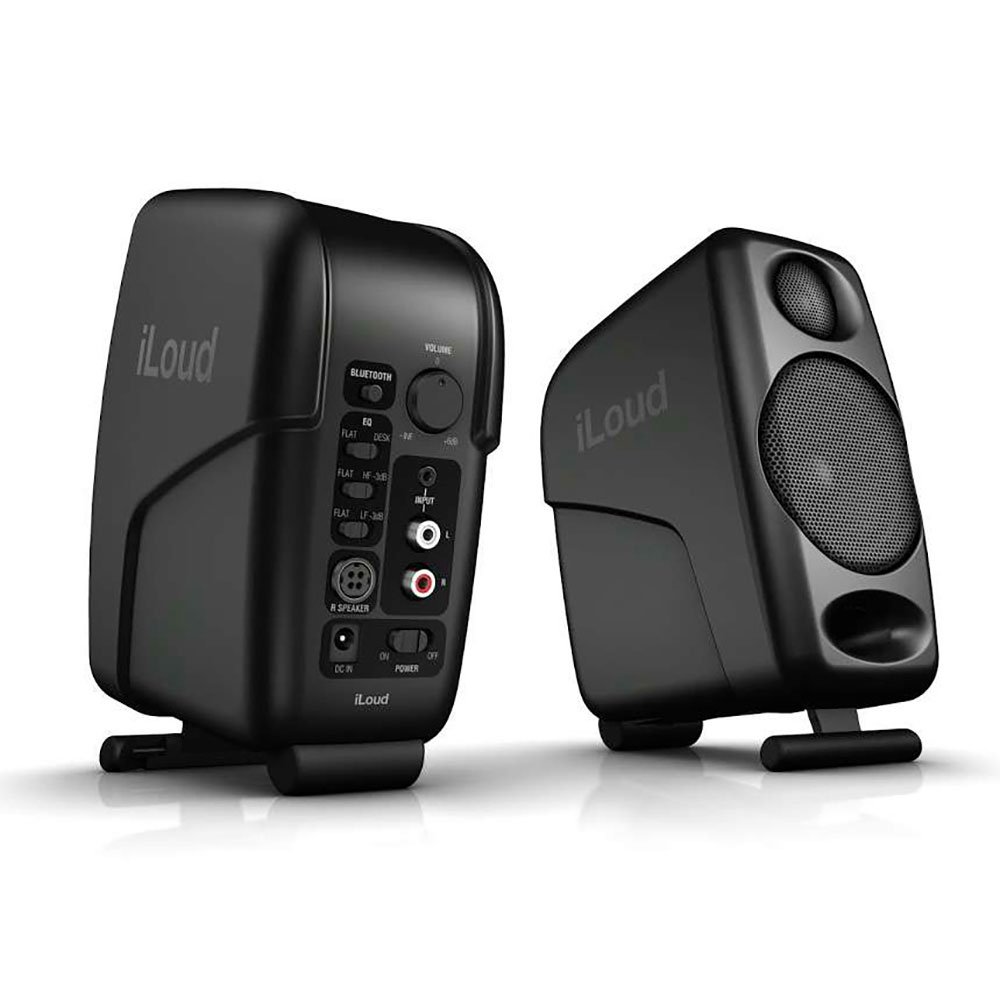 IK MULTIMEDIA iLOUD MICRO. Pair of biamplified two-way monitors with a total power of 50W, 4 class D amplifiers, 3/4" neodymium tweeter, 3" woofer, frequency response from 45Hz to 20kHz, front bass reflex, Max SPL at 1 meter 104dB, EQ to adapt the frequency response, Bluetooth connection, 1/8" AUX input and stereo RCA