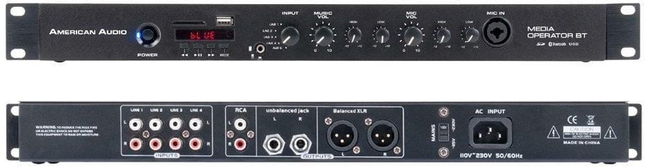 AMERICAN AUDIO MEDIA OPERATOR BT is an MP3 and Bluetooth player, designed for installations where easy music control is necessary (e.g. restaurants, gyms, shopping malls, etc.). Technical features include digital reproduction from SD cards or from memories and USB drives, full MP3 playback control, microphone input (XLR/1/4" combo), general volume control, 3 line outputs, track duration display, track search buttons, LCD display, individual high/low EQ adjustment, high/low EQ adjustment for MIC input, MIC volume control and Master. The unit can be connected directly to amplified speakers, to an amplifier or to a mixer through the balanced XLR, Jack 1/4" or RCA Stereo outputs
