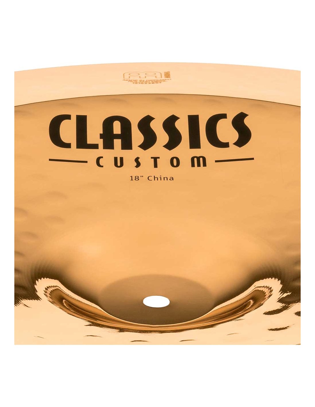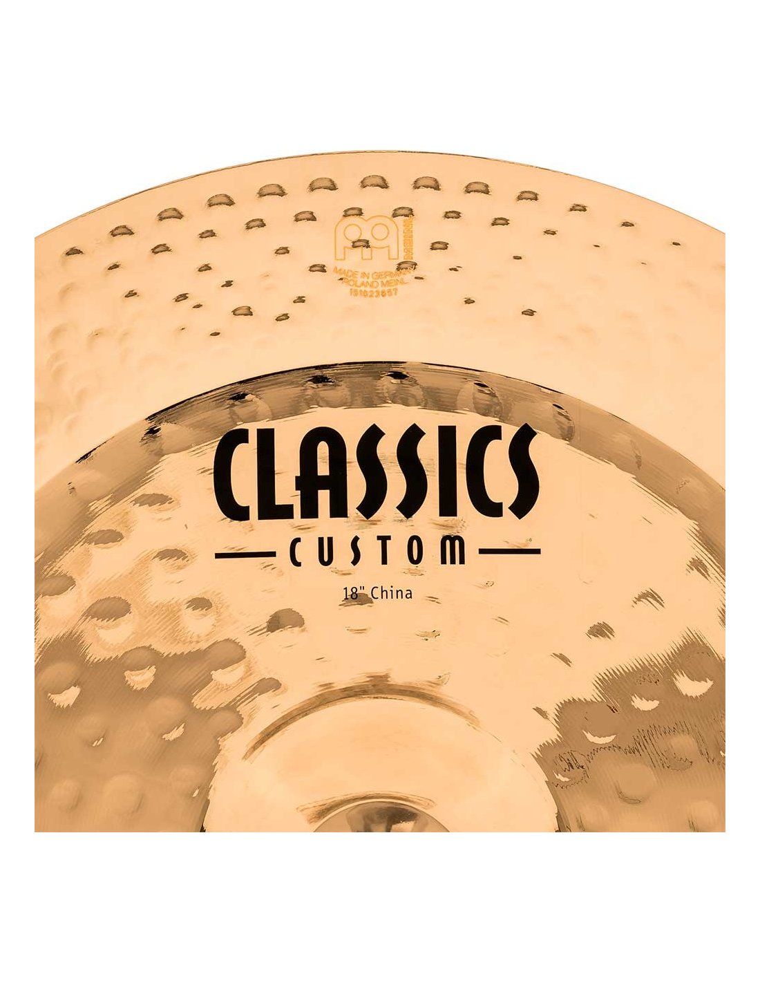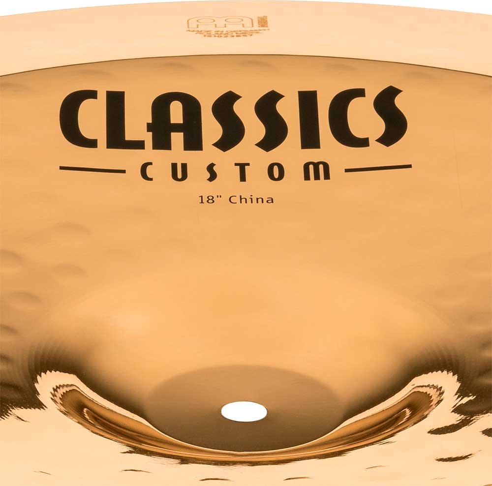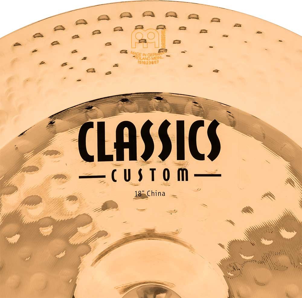 'China 18', Classics Custom Series. The Classics Custom series cymbals are mechanically produced in Germany with a B10 alloy. The process involves various techniques, both pressing and computerized hammering. In addition to this, they receive a glossy lacquer that gives them a spectacular glossy finish.