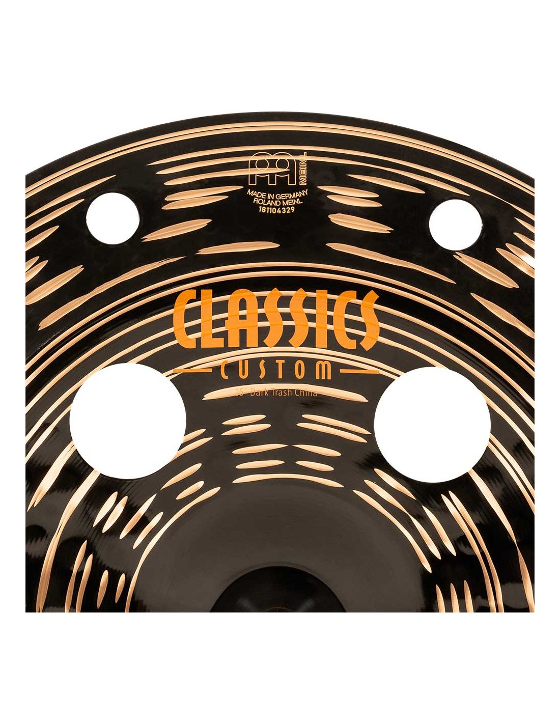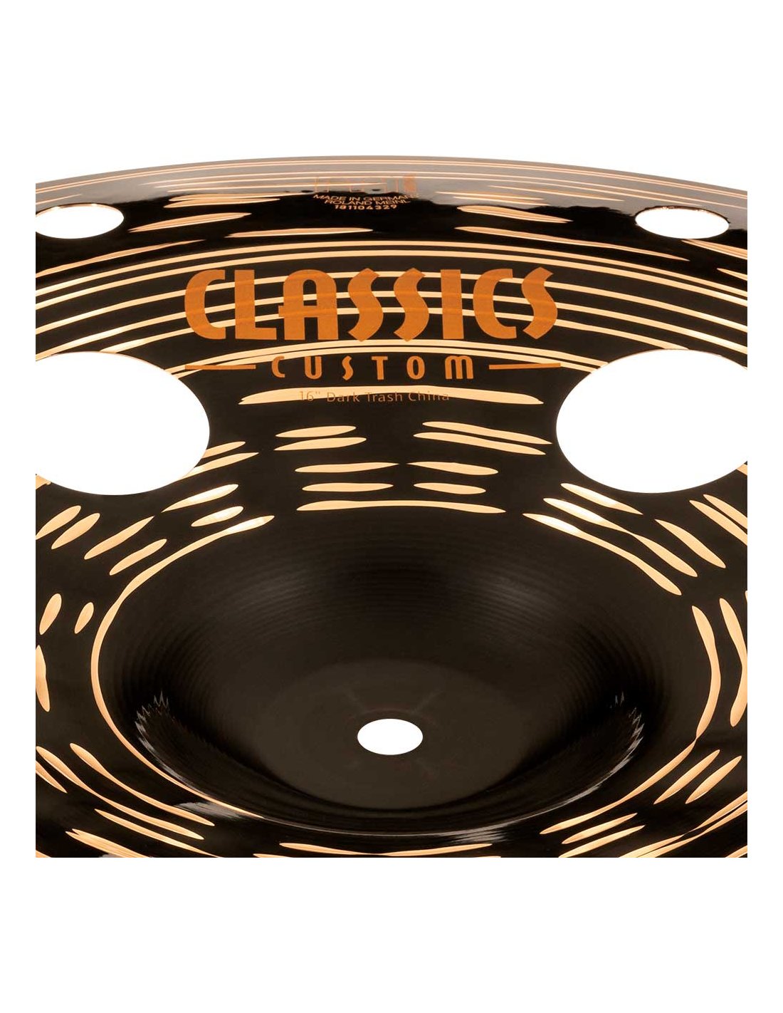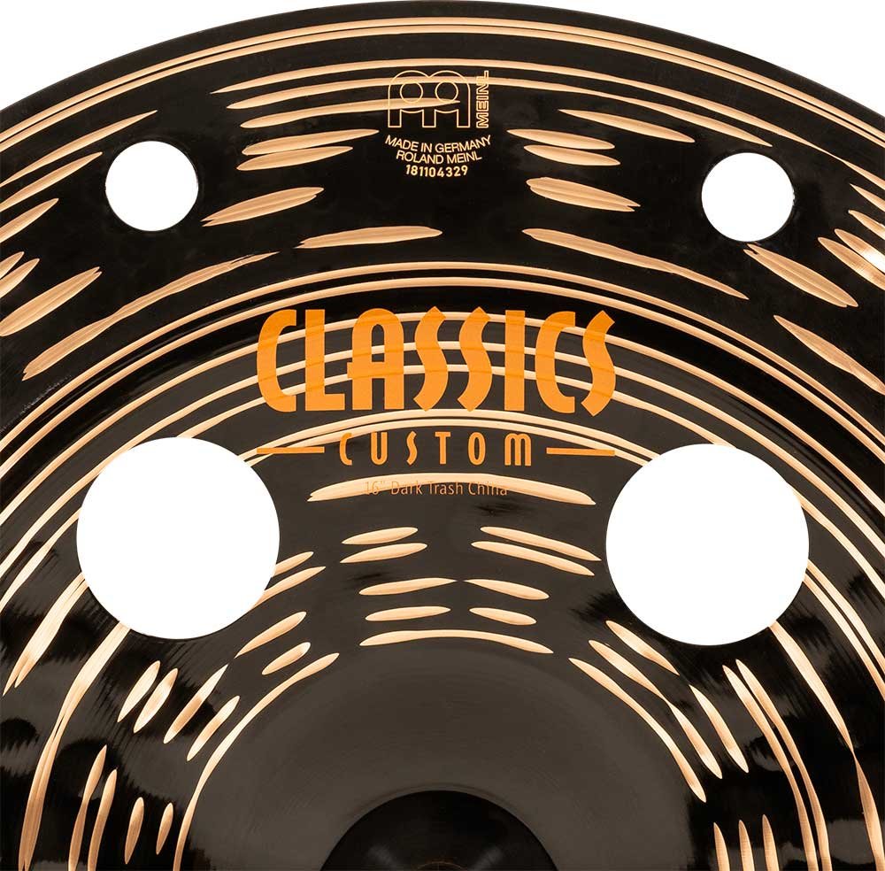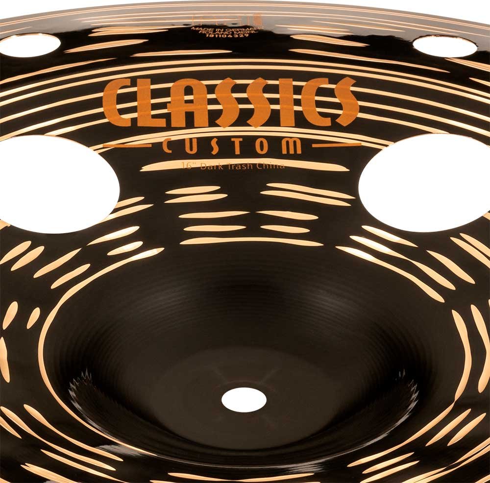 Trash China 16" Classics Custom Dark Series. The Classics Custom Dark series cymbals are mechanically produced in Germany with a B10 alloy. The process involves various techniques, both pressing and computerized hammering. In addition to this, they have a glossy black finish that gives them a spectacular appearance and a particular sound.