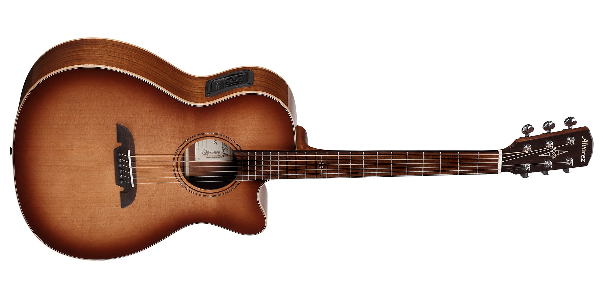 Electrified Missing Shoulder Acoustic Guitar.Construction: Dovetail Neck Joint. Scale: 25 1/2 (648 mm). Sound box: Folk/om missing shoulder. Chain: MST1 - Tapered X Bracing w/ Asymmetric Tone Bars. Bottom and Sides: Acacia AAA laminate. Binding: Flamed maple. Top: AA solid Red Cedar. Top finish: Shadowburst/Gloss. Handle: Mahogany, 50/50 Semi Gloss finish. Keyboard: Lauro Indiano/Rosewood. Nut: Bone - 44.45 mm (1 3/4). Keyboard inlay: Abalone Paua and mother-of-pearl, special inlay on the 12th fret. Mechanics: Alvarez Premium. Bridge: Lauro Indiano/Rosewood Bi-Level, bone saddle, PPS pegs. Electronics: LR Baggs StagePro EQ/Element Pick Up Series: Alvarez Artist Elite.