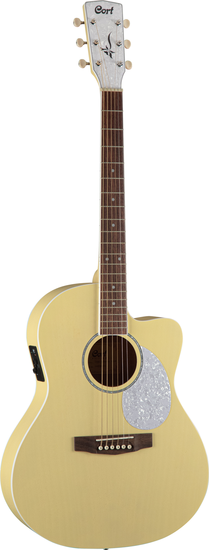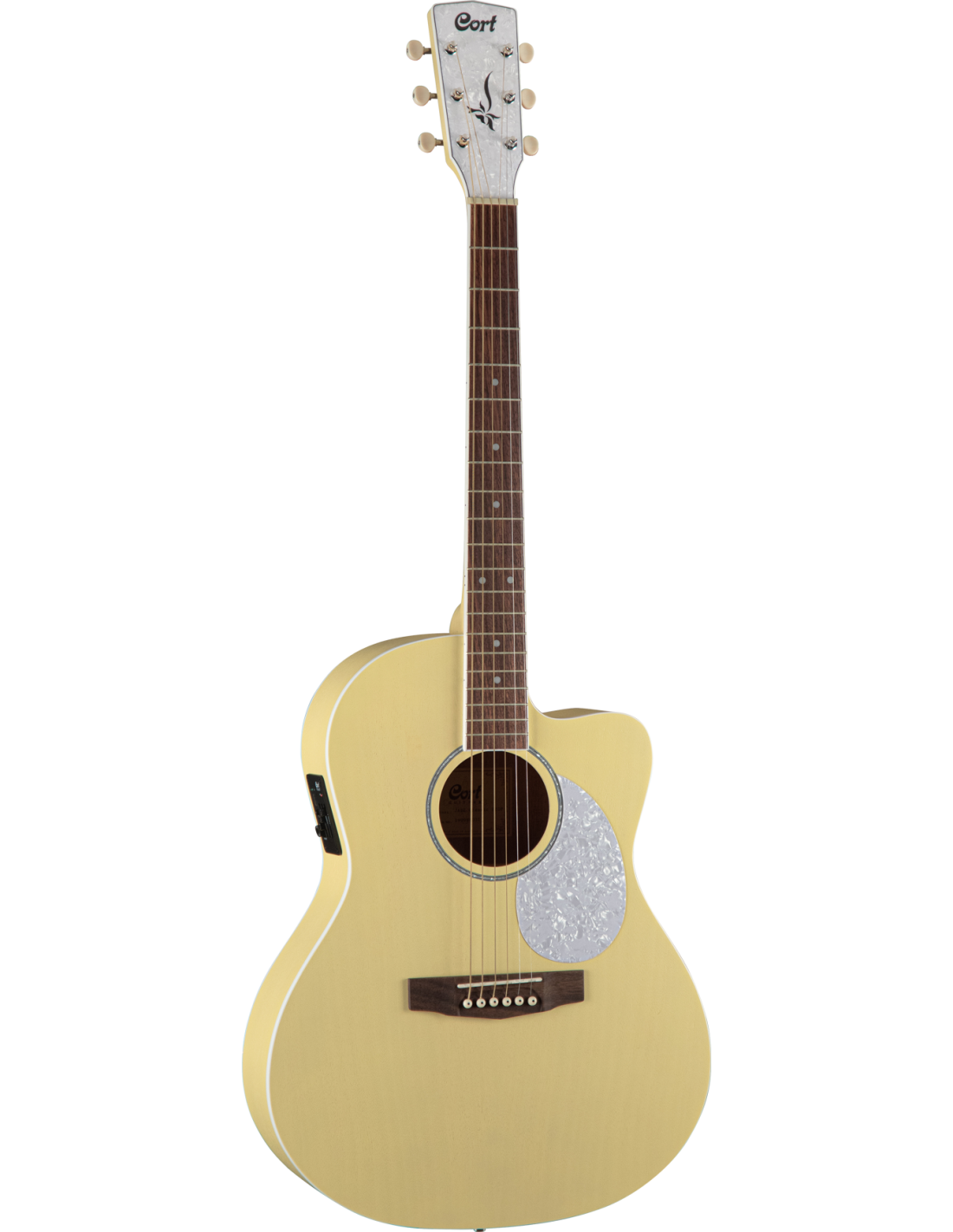 Chitarra elettroacustica Jade. Corpo interamente in mogano. Dimensioni compatte. Cutaay in stile veneziano. Meccaniche vintage a ingranaggio aperto. Preamplificatore Cort CE304T. Finitura Open Pore e colore Pastel Yellow in stile anni 50 con dettagli perlati.