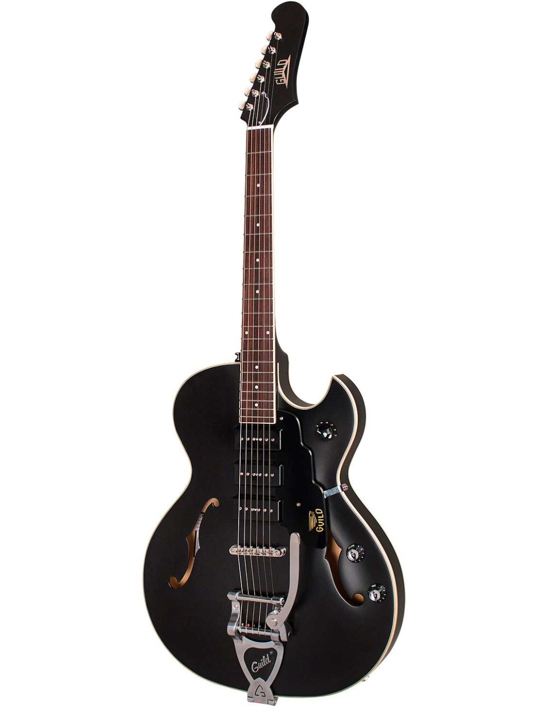 Here's a wild new contender for the role of pack leader: Starfire I Jet 90. Born in the wake of the iconic Guild models of the past and characterized by a rebellious attitude and a free spirit, Starfire I Jet 90 combines the classic Starfire I body with a rounded maple top and bottom with the vintage aesthetic highlighted by the two f of the board, and the original 6 in-line paddle. Three Franz P90 pickups anchored to a central block with mahogany tonal chambers allow this guitar to offer a perfect sound both when looking for the crisp, vintage timbre of jazz, and when we push on extreme overdrive. The six-position rotary switch allows the musician to choose their preferred P90 combination for each type of riff, with the very useful pins to indicate the position of the switch (in the Guild style of the 1950s). Starfire I Jet 90 is equipped with a Guild string locking Vibrato tremolo bridge and Tune-o-matic bridge for raids ranging from Rockabilly to Jazz. Finitatura Satin Black/poor box/Repackaged Item