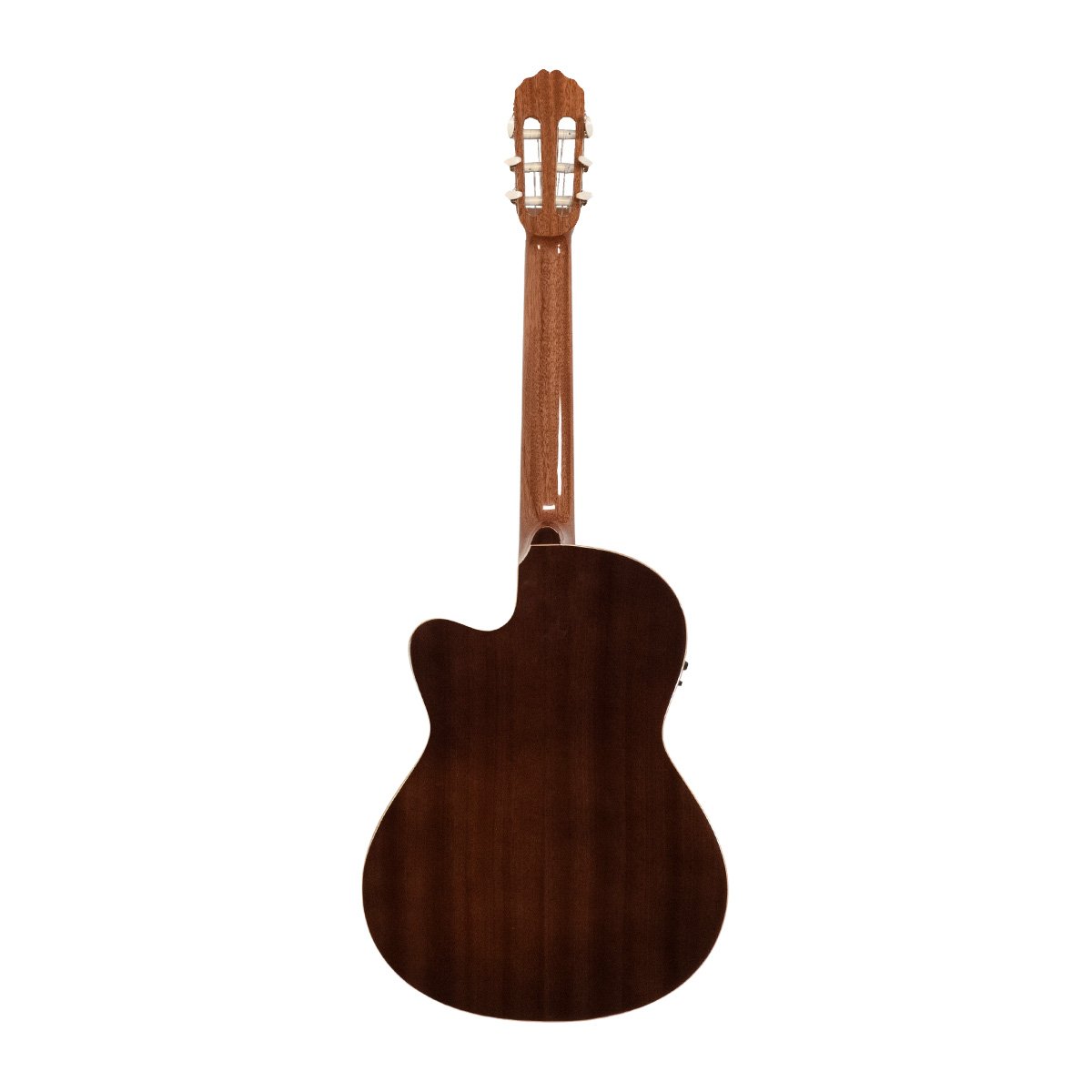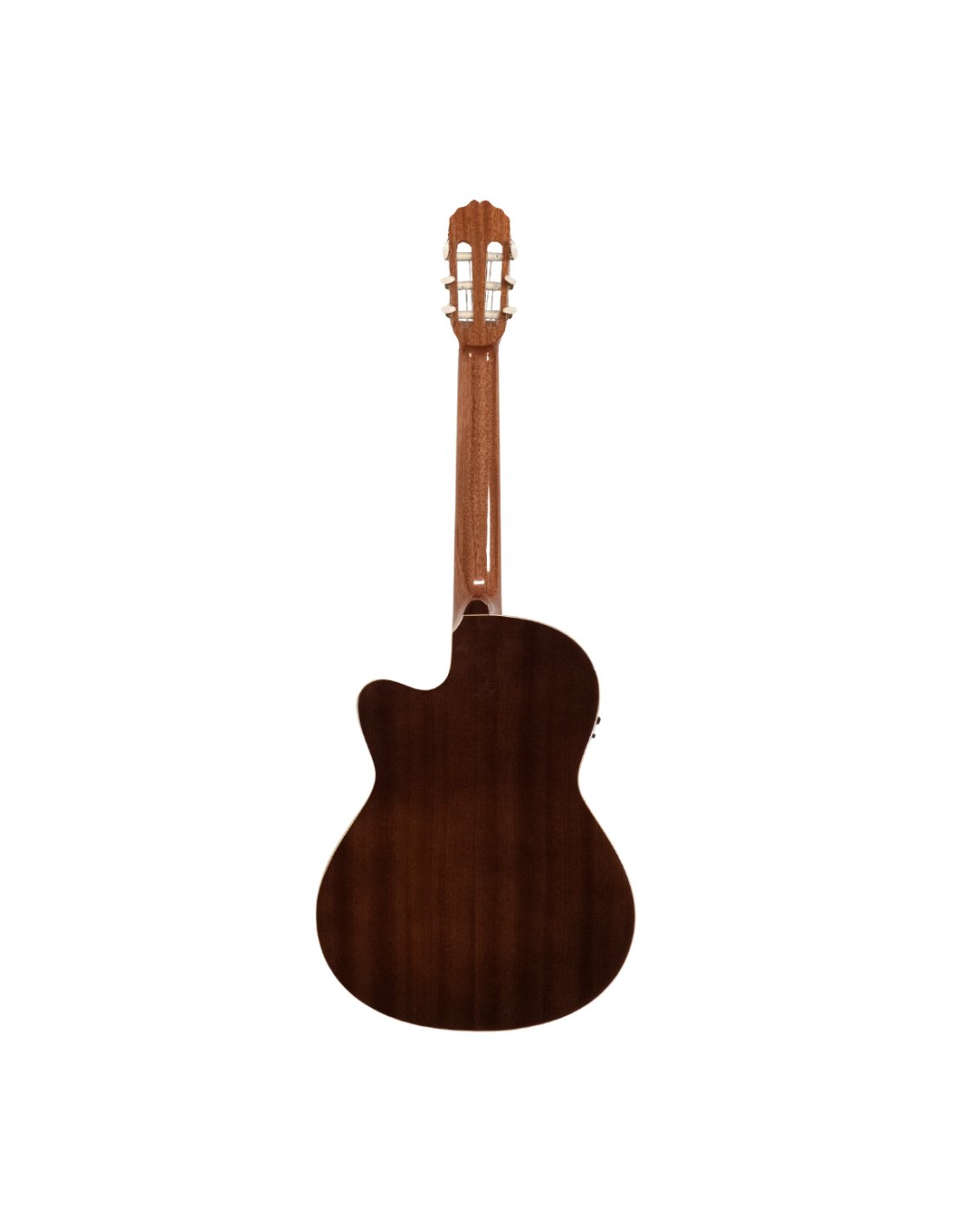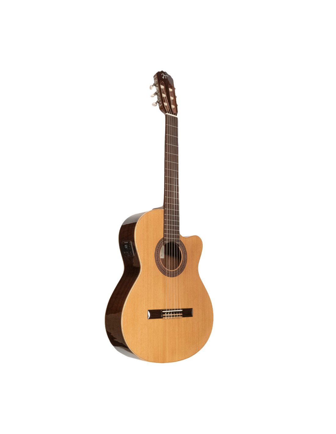 Electric classical guitar with cutaway. Solid cedar top. Mahogany sides and back. Mahogany handle Indian rosewood keyboard. 52mm bone nut. Nickel-plated mechanics. Maple binding in the top. 650 mm scale. Preamp Fishman classical II. Glossy finish
