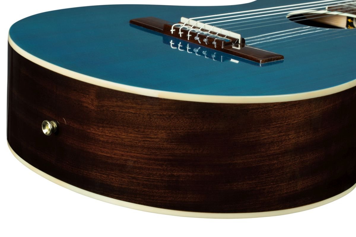 'The Ortega Guitars Ranger series is truly eye-catching thanks to its eye-catching glossy top. The colorful tops, available in black, ocean blue, t-red and platinum, beautifully complete the dark mahogany back and sides. The Ranger series by Ortega, the size of a salon, features a short staircase tree embellished with bar inlays. Each guitar also comes with a matching case for added convenience. Size: 4/4 - Living room. Nut width: 47 mm (1.85”). Scale: 630 mm (24.8”). Upper part: Stone, Ocean blue, Glossy finish Back and sides: Mahogany, Polished Style: Satin Nato with dark tint Fingerboard and bridge: Mahogany walnut plating Binding: upper and lower ivory ABS acoustic headstock Inlays on white pearl fingerboard Bridge: Ortega 12 holes Truss: 2-way Scale: Short 630 mm (24.80”) Nut width: 52 mm (2.05”) Includes a matching carrying bag ORTEGA2024'