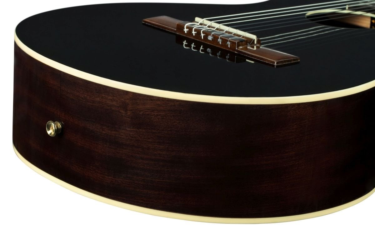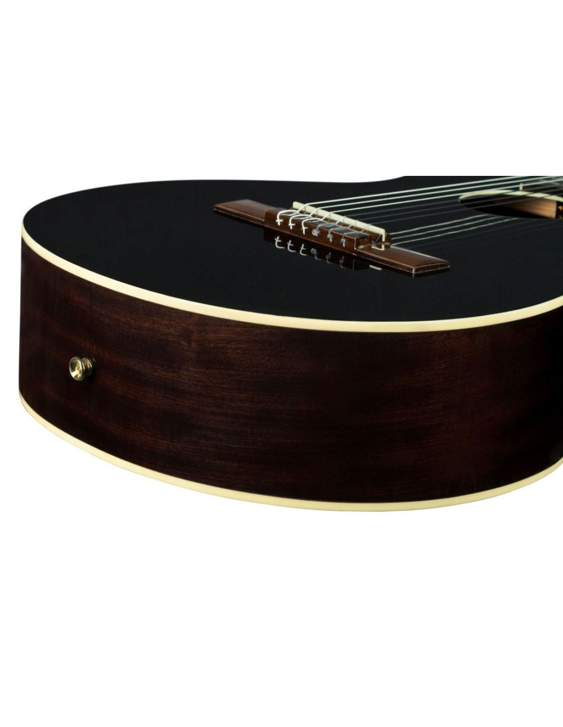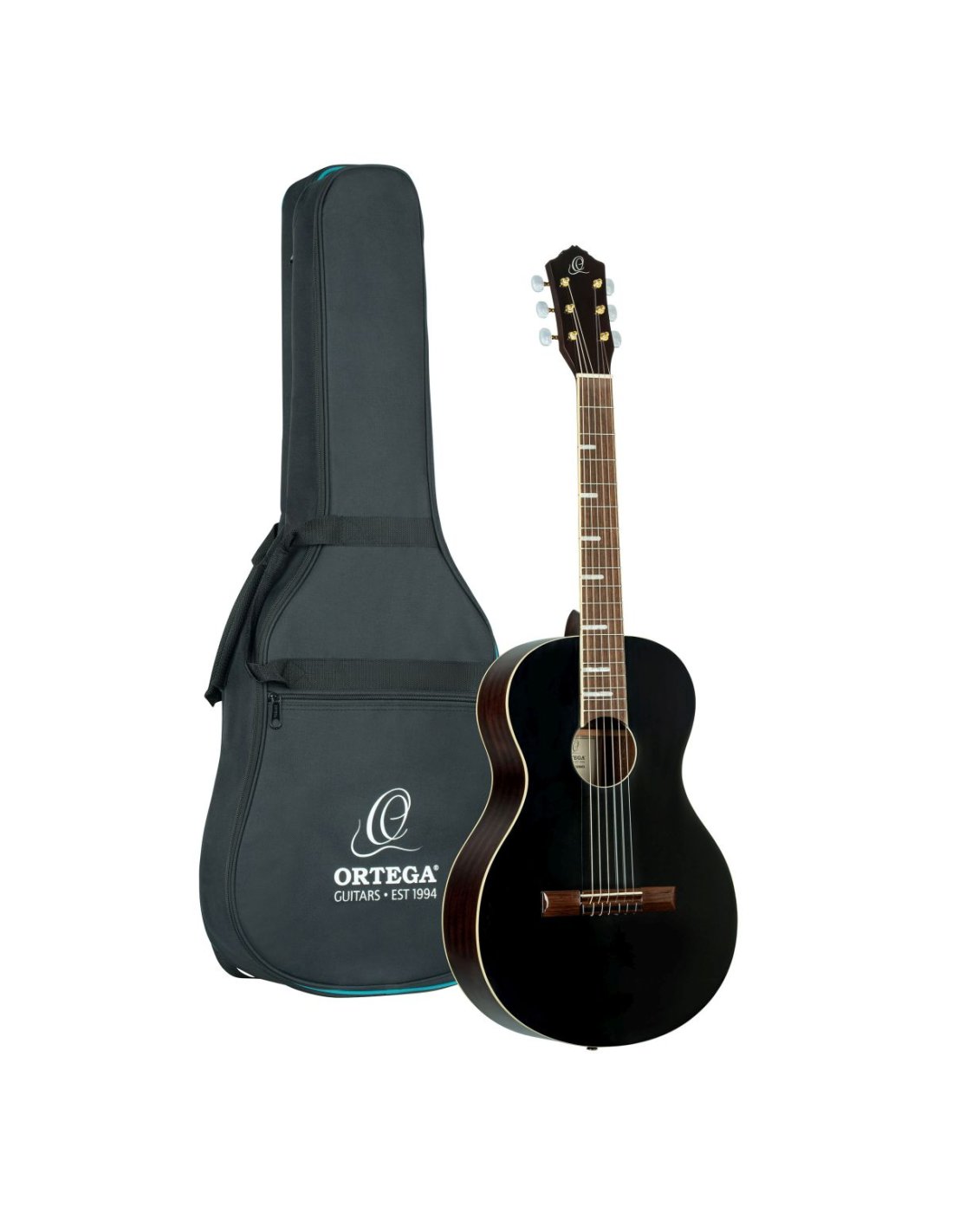 'The Ortega Guitars Ranger series is truly eye-catching thanks to its eye-catching glossy top. The colorful tops, available in black, ocean blue, t-red and platinum, beautifully complete the dark mahogany back and sides. The Ranger series by Ortega, the size of a salon, features a short staircase tree embellished with bar inlays. Each guitar also comes with a matching case for added convenience. Size: 4/4 - Living room. Nut width: 47 mm (1.85”). Scale: 630 mm (24.8”). Board: Spruce, black, glossy finish Back and sides: Mahogany, glossy Style: Satin Nato with dark tint Keyboard and bridge: Walnut headstock plating Mahogany binding: ABS upper and lower ivory Acoustic headstock Inlays on the white pearl keyboard Bridge: Ortega 12-hole trellis: 2-way Scale: Short 630 mm (24.80”) Nut width: 52 mm (2.05”) Matching carrying bag including ORTEGA2024'
