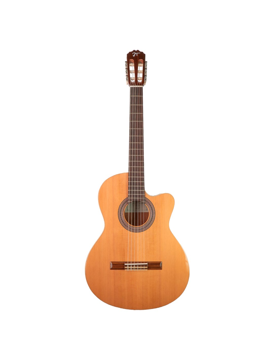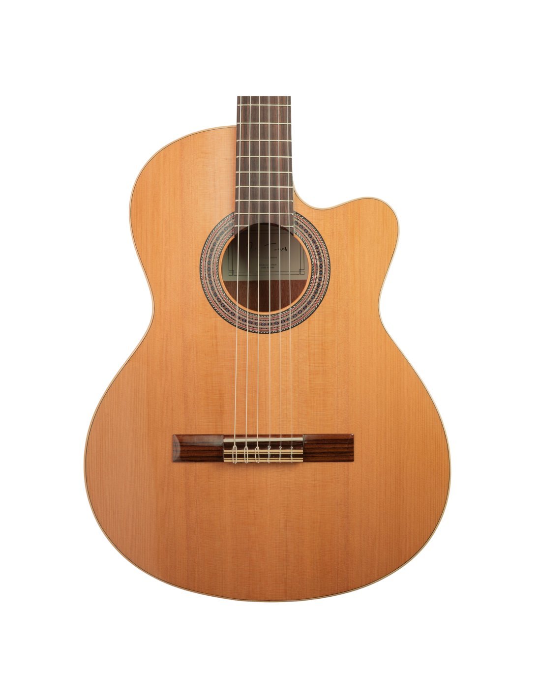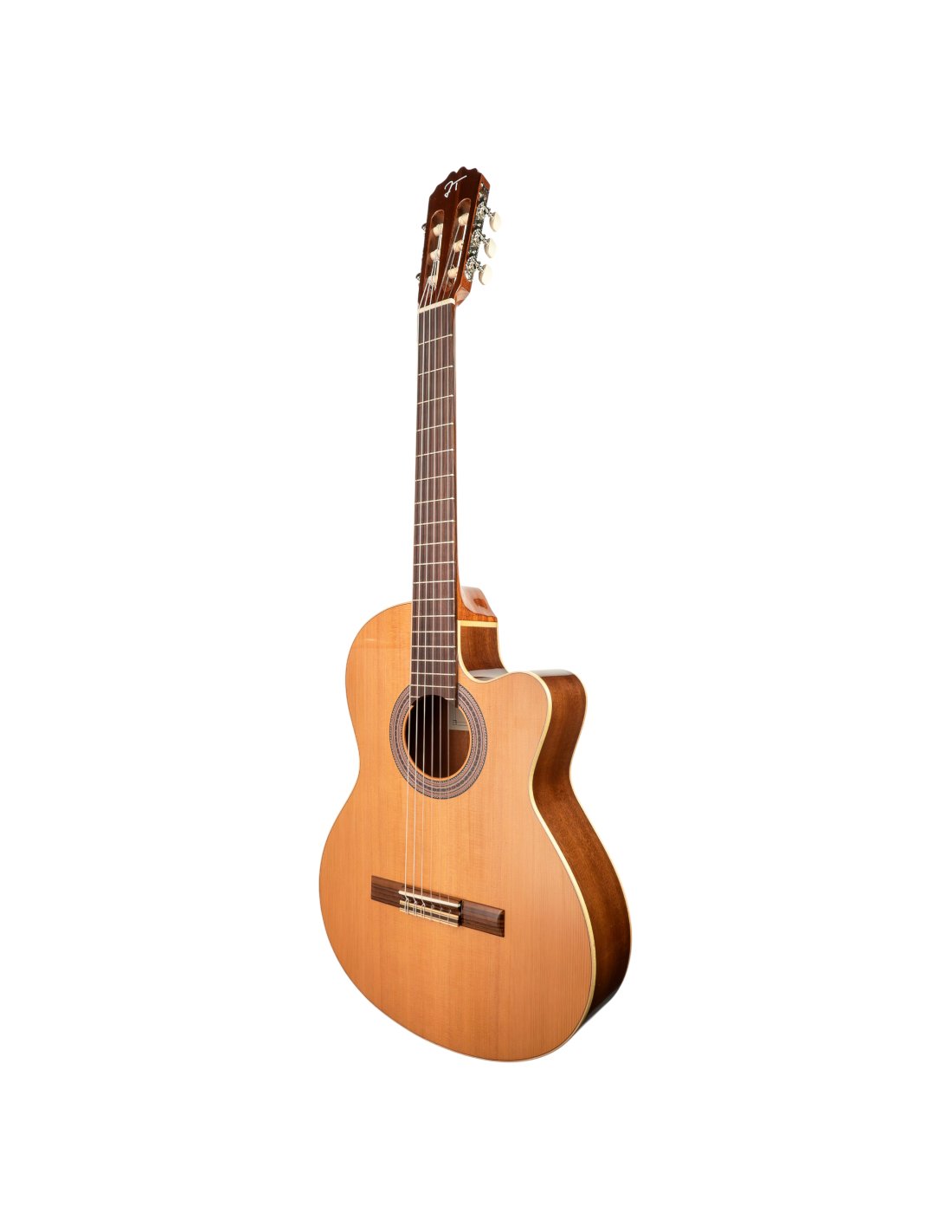 Electric classical guitar with crossover cutaway. Solid cedar top. Mahogany sides and back. Narrow mahogany handle. Indian rosewood keyboard. 48mm bone nut. Nickel-plated mechanics. Maple binding in the top. 650 mm scale. Preamp Fishman classical II. Glossy finish
