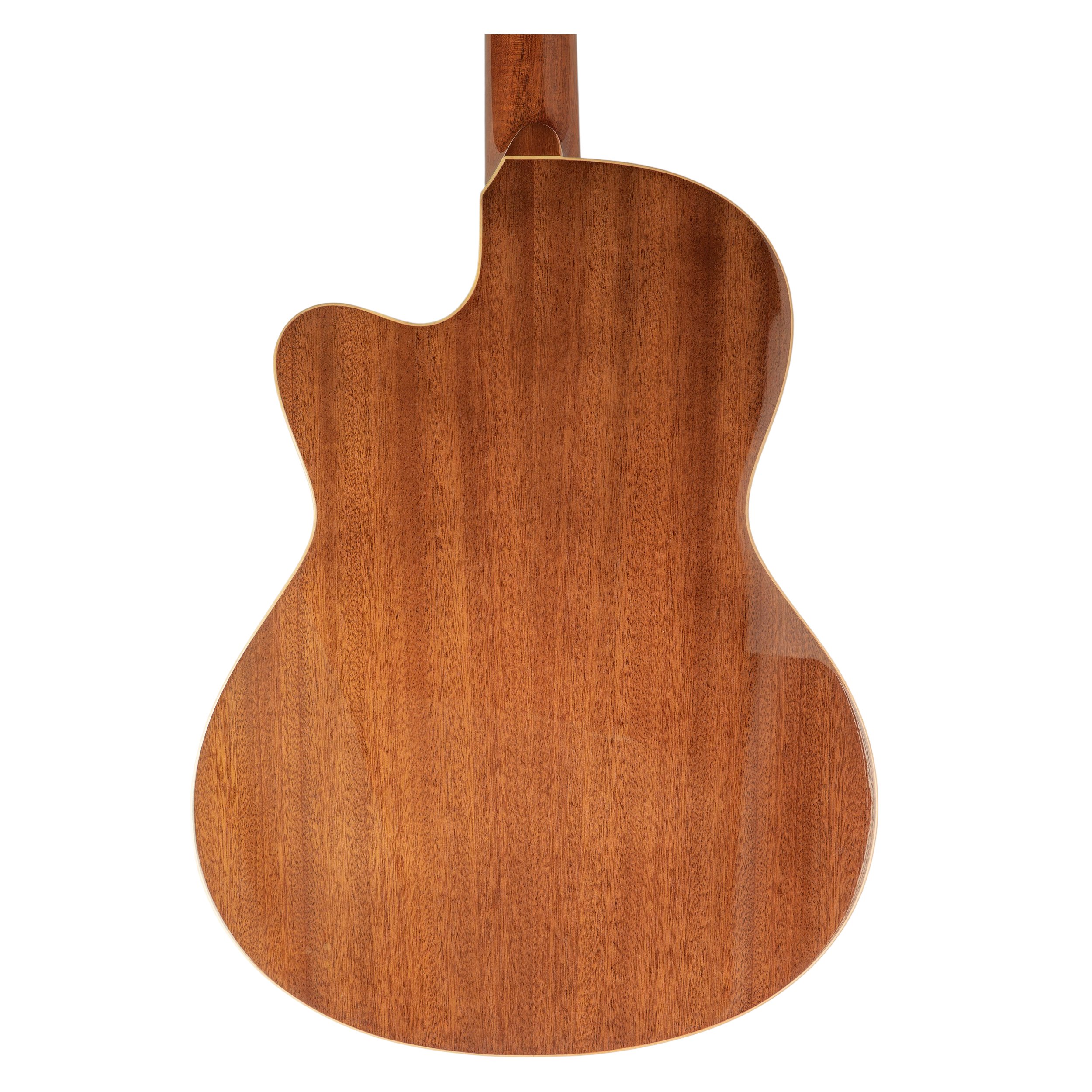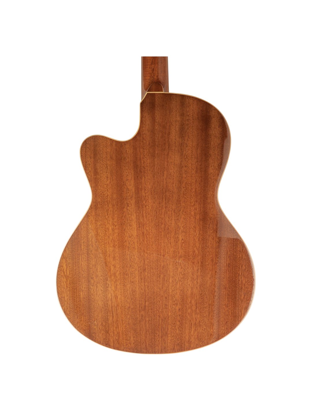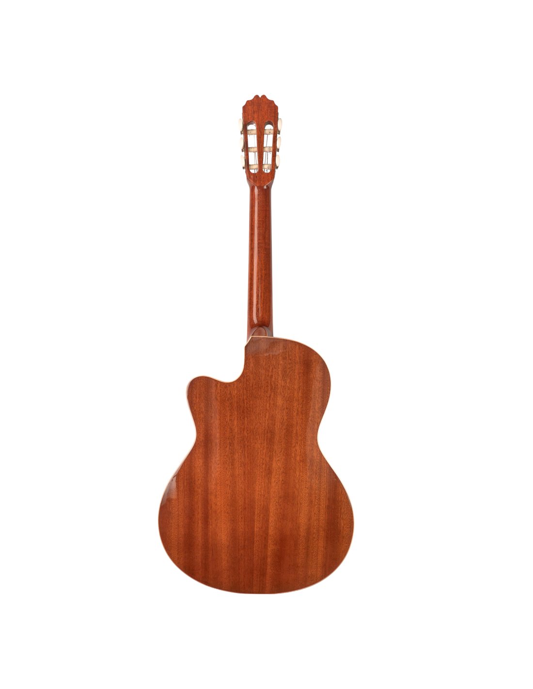 Electric classical guitar with crossover cutaway. Solid cedar top. Mahogany sides and back. Narrow mahogany handle. Indian rosewood keyboard. 48mm bone nut. Nickel-plated mechanics. Maple binding in the top. 650 mm scale. Preamp Fishman classical II. Glossy finish