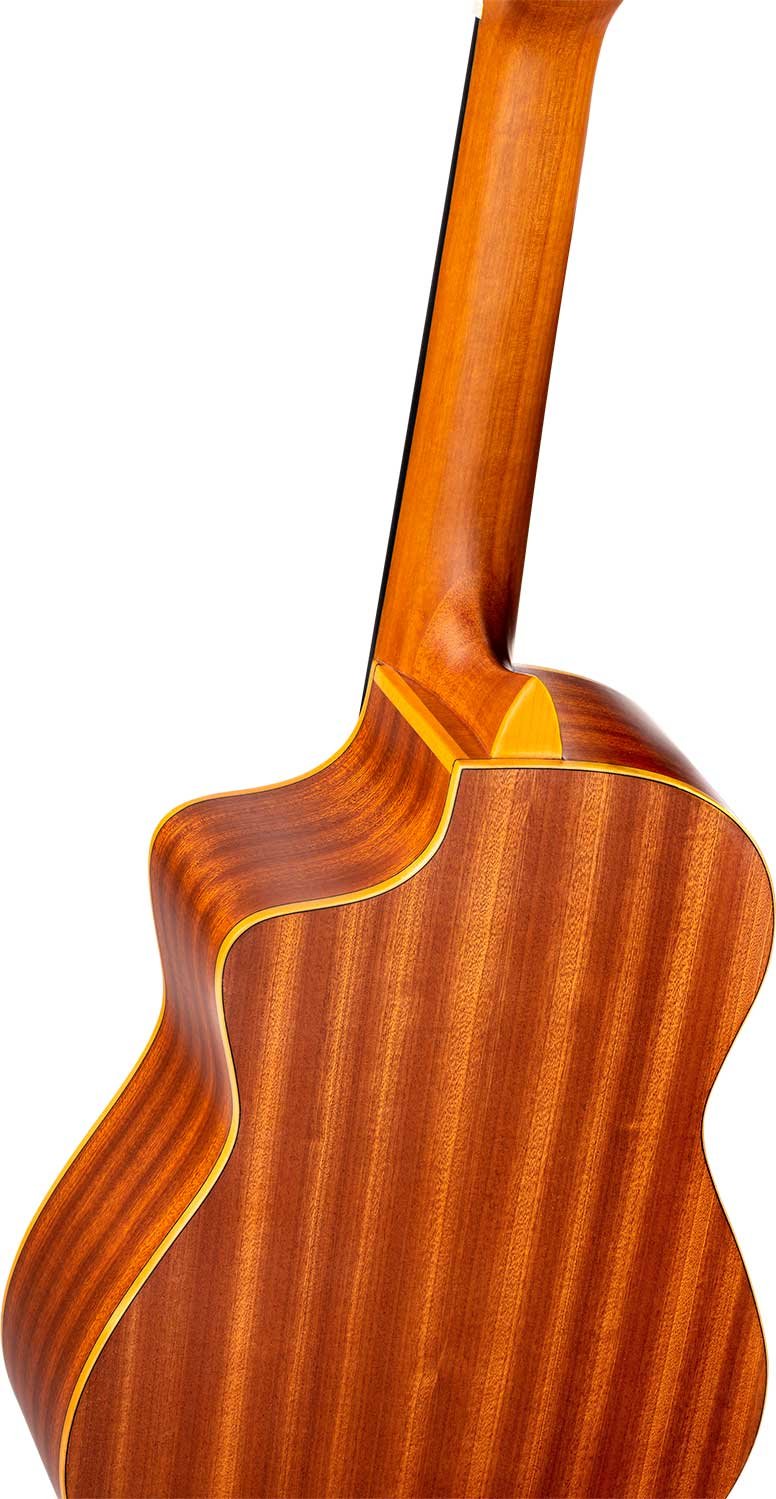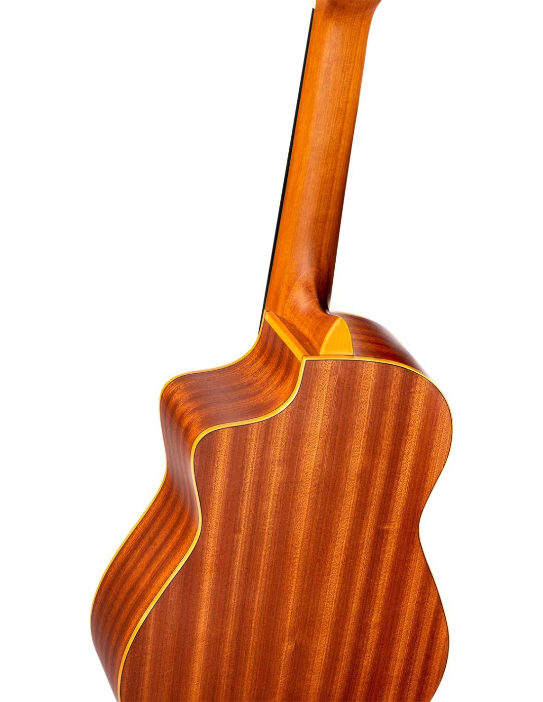 RQ25 Requinto in Mexican style with deep body. Spruce top with natural satin finish. Circles and bottom in satin sapelli. 110 mm extra deep body. Okoumé handle with glossy satin finish. Walnut keyboard and bridge.