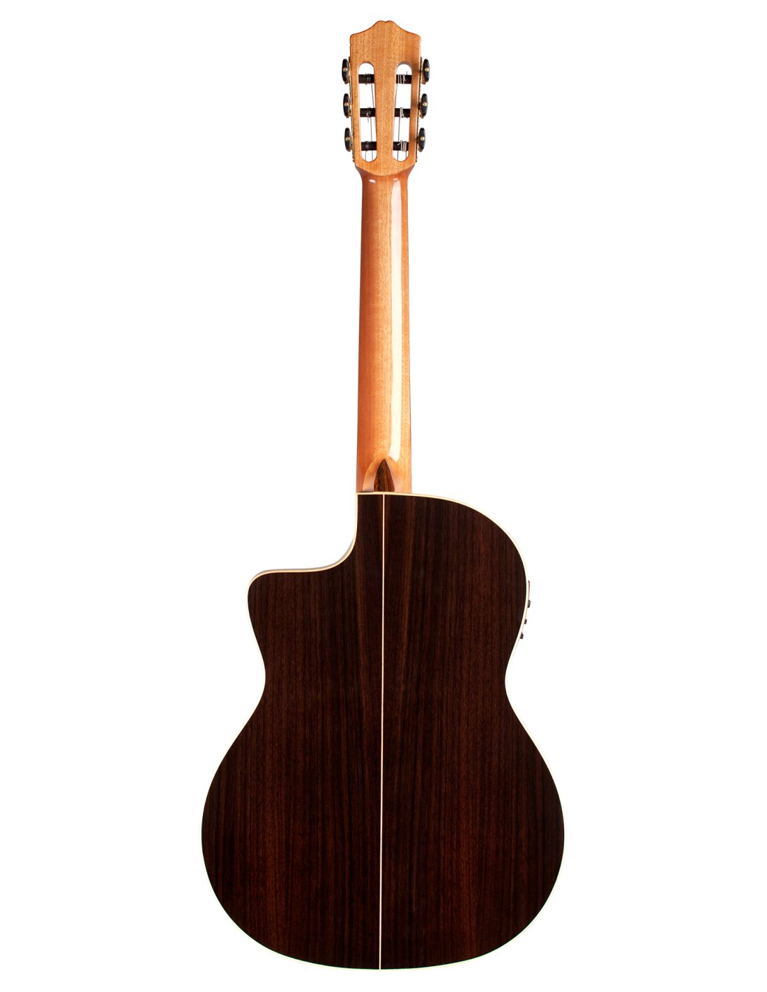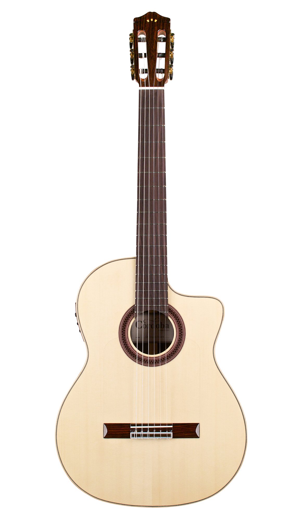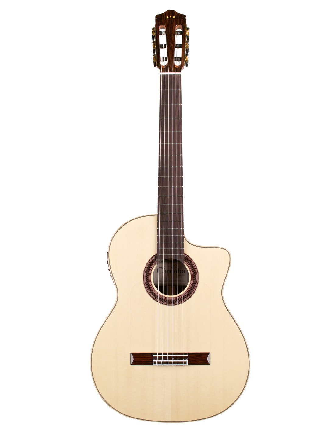 'Built with a solid European spruce top, rosewood back and sides, soft cutaway and Fishman Presys Blend preamp, the GK Studio Negra is Córdoba's ultimate concert instrument and a best seller. Built for the stage, the GK Studio Negra is built with a slightly thinner body depth, neck and nut width than a traditional Spanish guitar. The handle is designed to have little or no relief, offering a low action to facilitate comfort and speed of execution. Flamenco players choose this model for a lower, more robust tone, in contrast to the bright and snappy sound of the “Blanca” flamenco guitar. However, any guitarist looking for a new tone will feel at home. Like any Córdoba guitar, this model features a two-way truss rod integrated into the neck. Other valuable features are the glossy finish, the flamco-style transparent plate and the Savarez strings. '