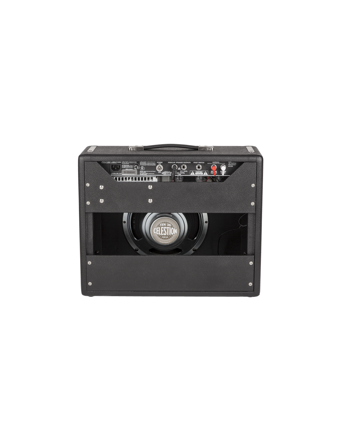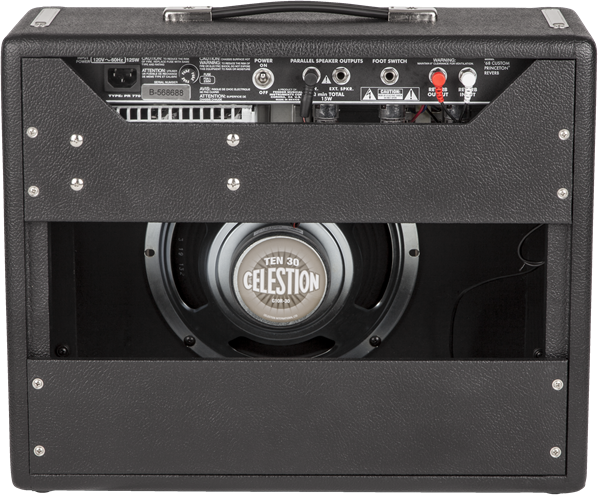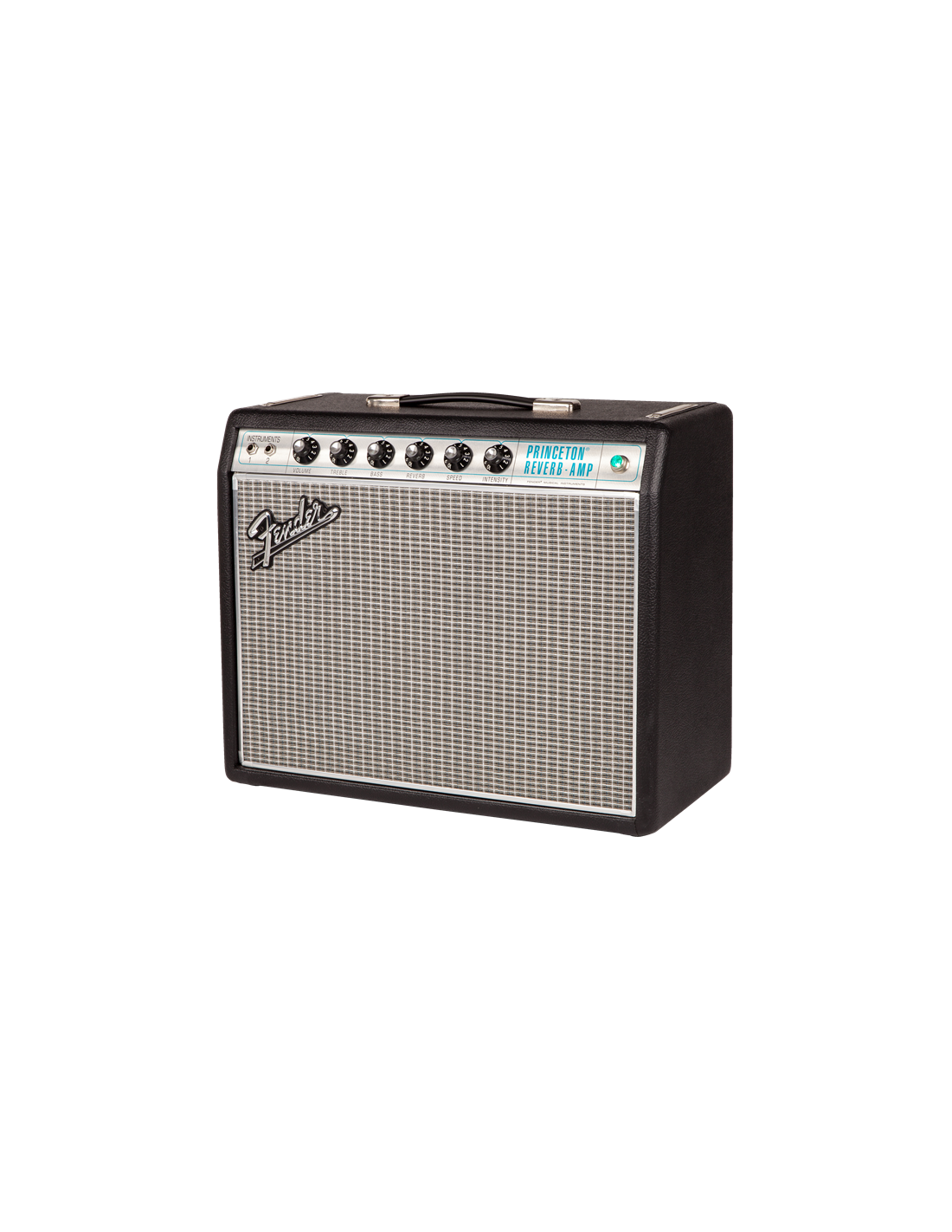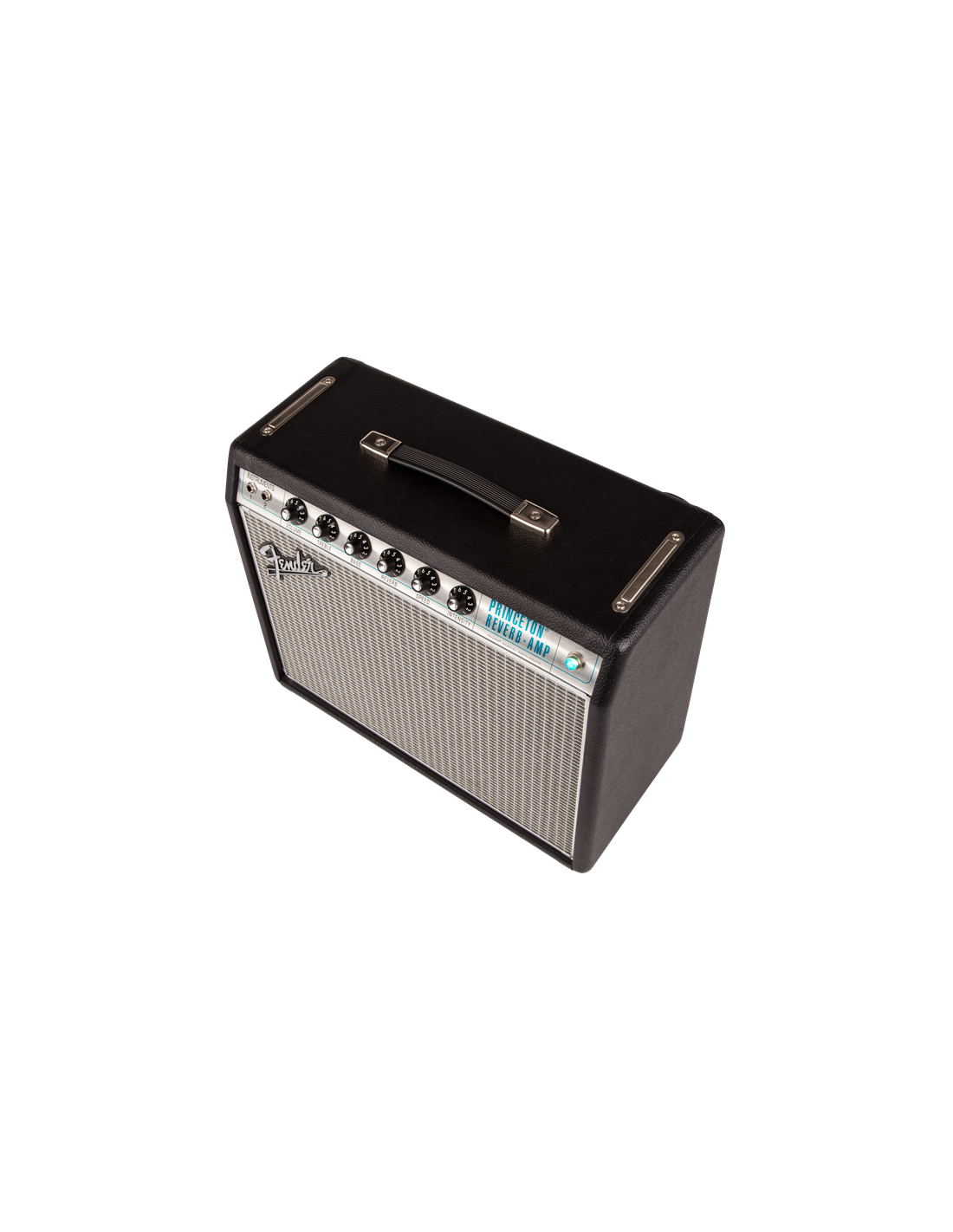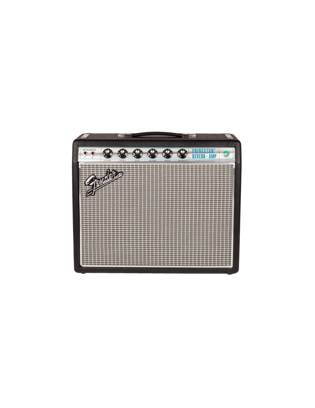 FENDER 68 PRINCETON REVERB is a tube combo amplifier for Princeton '68 series guitar with spring reverb. Technical features include a single 10" Celestion Ten 30 G10R-30 speaker with ceramic magnet and 12W of power, birch/fir cabinet with black vinyl coating, 4 preamp valves including 3 12AX7 and 1 12AT7, 2 6V6 final valves, 2-band Eq (Bass, Treble), Volume control, Reverb control with speed and intensity regulation. The amplifier is equipped with a single channel with 2 6.3 mm jack instrument inputs, one of which is reduced to -6 Db and 2 parallel Speaker outputs