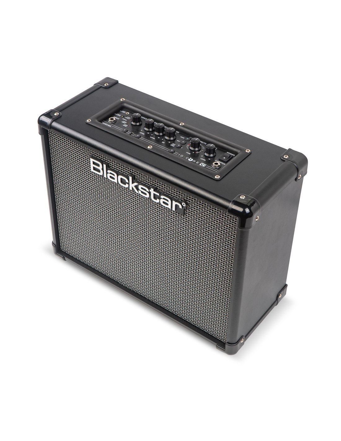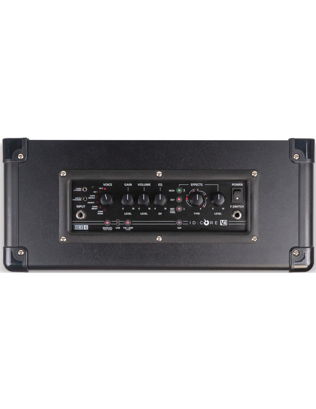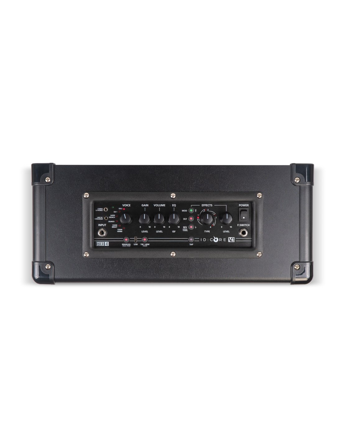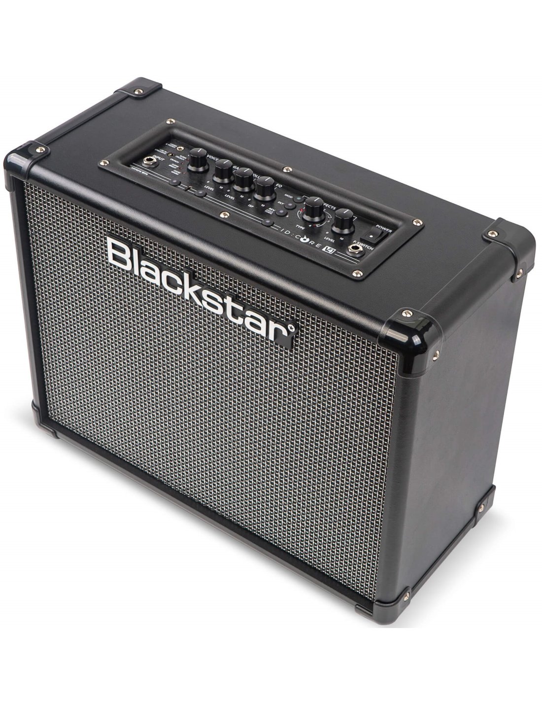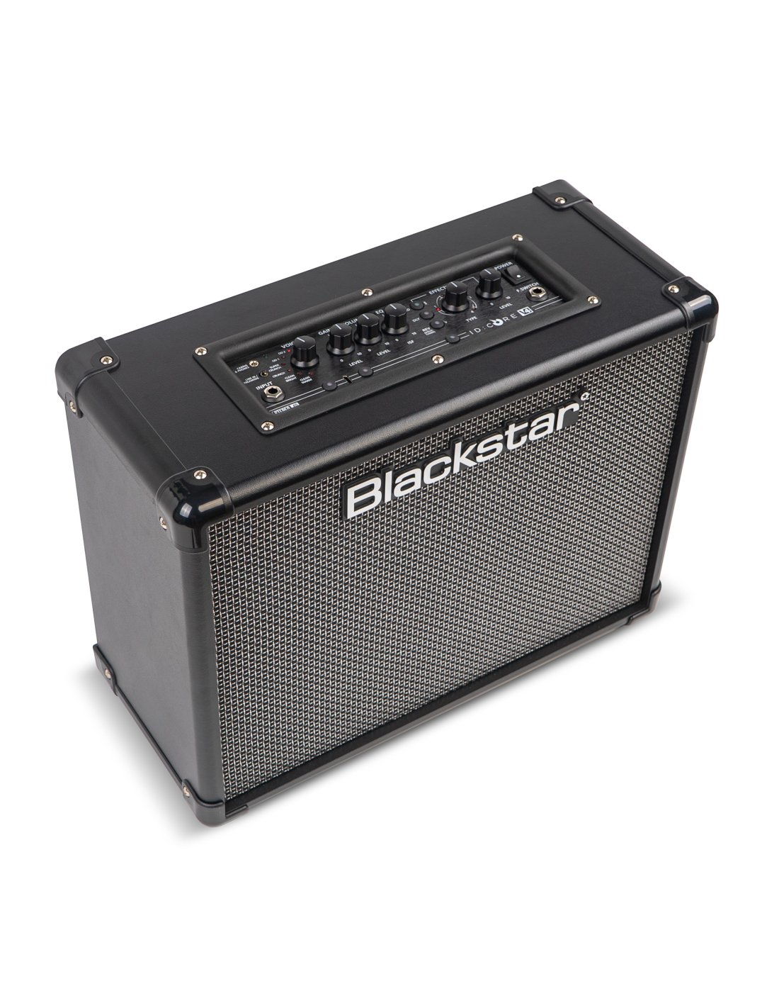 BLACKSTAR IDC 40 V4. Wide Stereo guitar combo amplifier with 2x20W of power and integrated digital effects. Technical features include 2 6.5" stereo Blackstar speakers, 6 digital effects voices selectable by encoder, gain and volume controls, patented ISF (Infinite Shape Feature) circuit that adjusts equalization through a single encoder, 4 delays with tap tempo, 4 reverbs and 4 types of modulation selectable with level control, CABrig Lite technology for digital simulations of microphone speakers, 4-channel USB audio interface integrated with Architect software for managing recordings. It has 3.5 mm TRS jack audio input for streaming from devices, instrument input via 6.3 mm jack, Cabrig/phones output through 3.5 mm TRS jack.