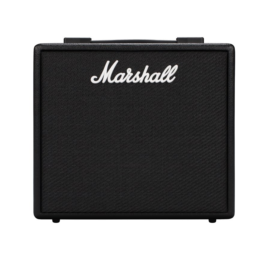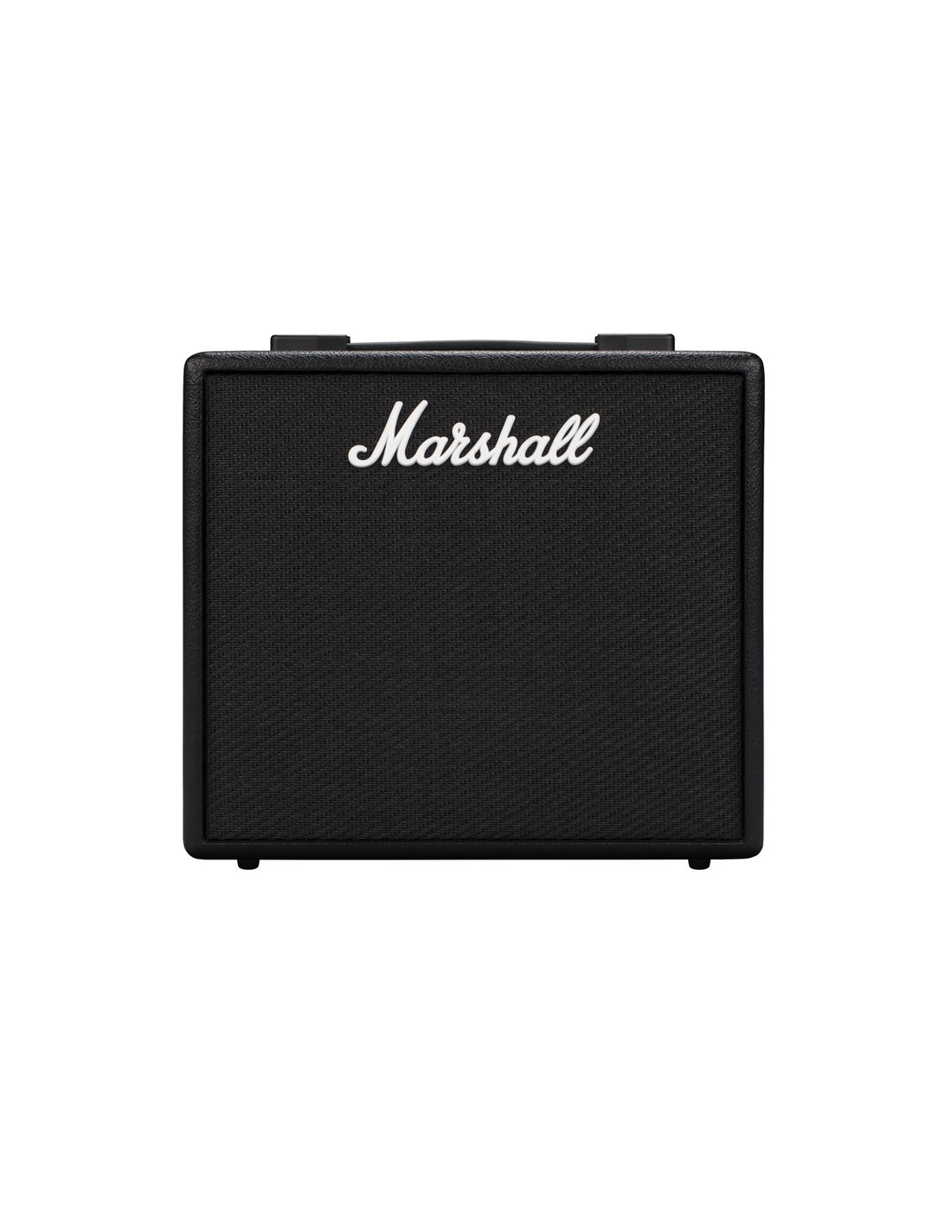 Marshall Code 25 Combo Digital 25W Electric Guitar Amplifier. The Marshall Code 25 Combo Digital 25W is a 25-watt programmable electric guitar amplifier that combines classic and contemporary Marshall tones with professional-quality FX. It has 14 preamp models, 4 power amplifier models, 8 cabinet models, 24 effects (5 simultaneous), 100 presets, Gain, Bass, Middle, Treble, Volume, Preset controls (Pre Fx, Amp, Mod, Del, Rev, Power, Cab, Edit/Store), Master, Mp3/Line In input, headphone output, USB connection, 1